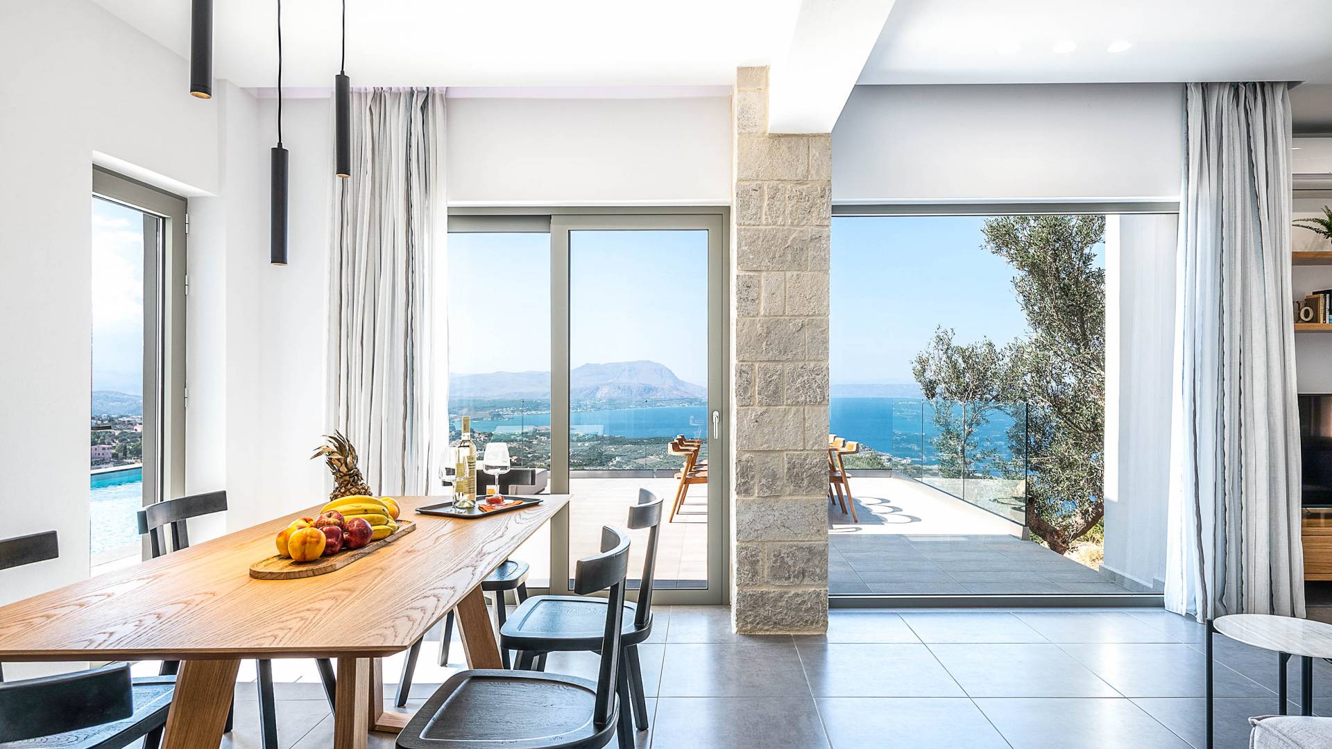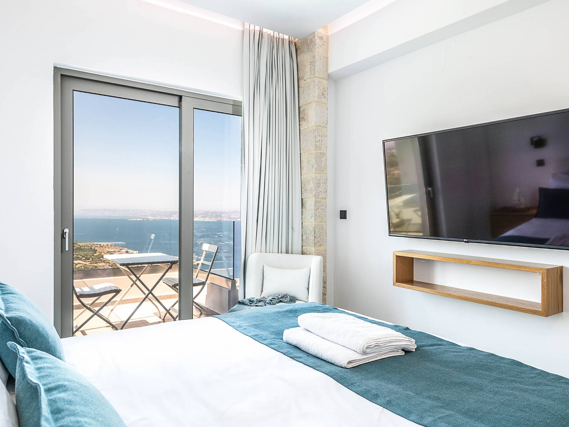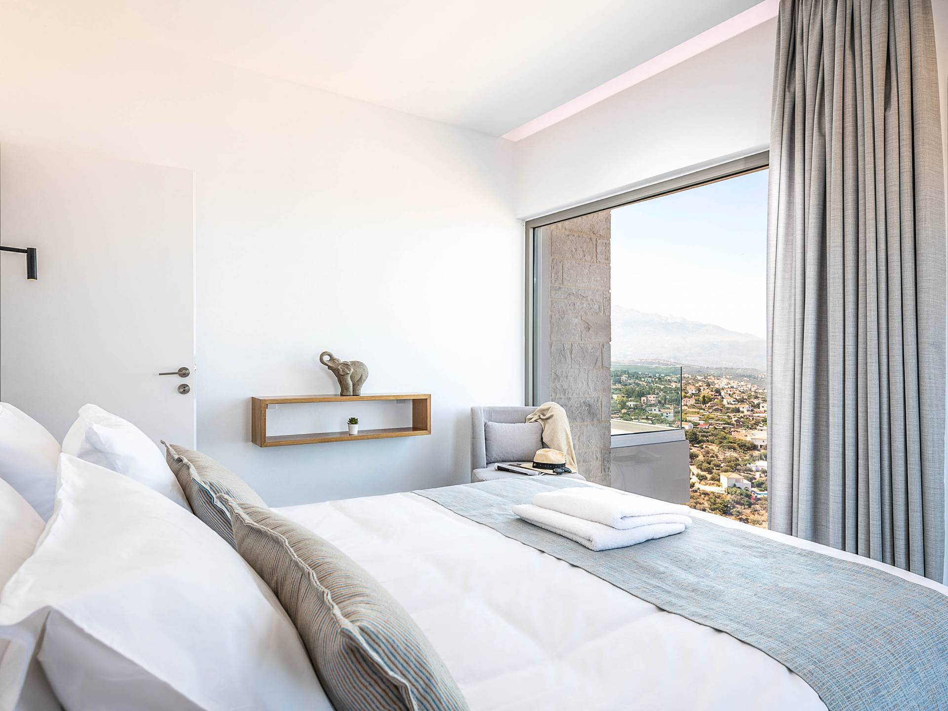Designed to evoke a sense of comfort and luxury, Villa Hero Crete features 122 square meters of beautifully appointed living space. The villa boasts three elegant bedrooms, each furnished with a double bed and accompanied by an individual en-suite bathroom, ensuring privacy and comfort for all guests. From each bedroom, enjoy breathtaking panoramic views of Souda Bay, the charming Apokoronas villages, and the majestic White Mountains – a perfect blend of sea, village life, and nature.