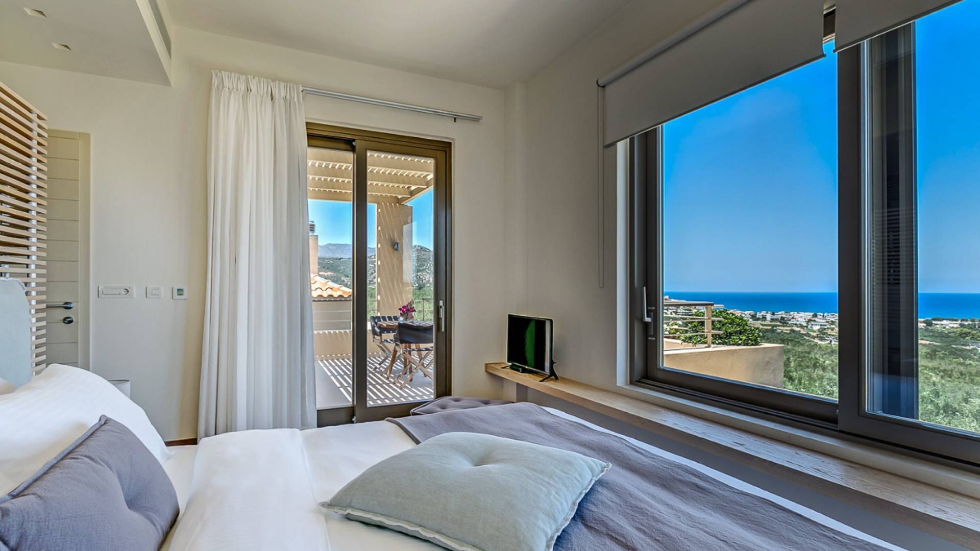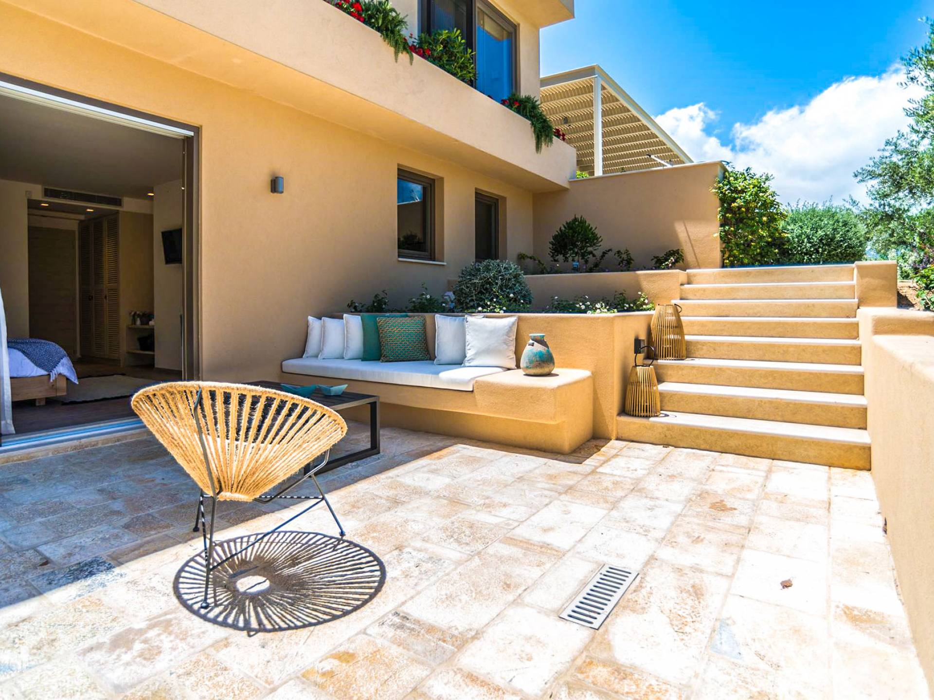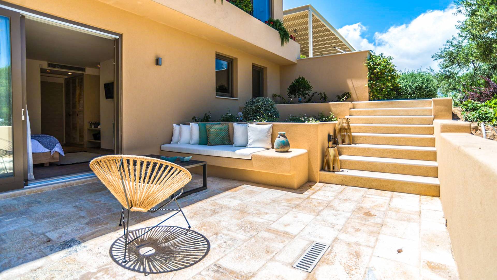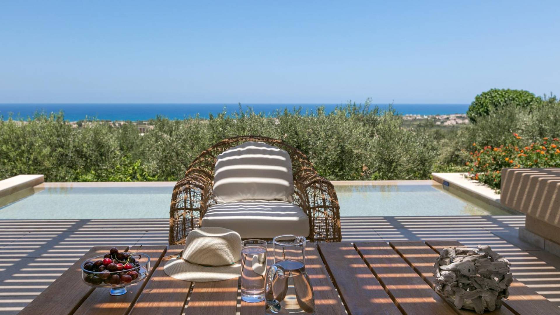 Nestled among olive groves and Mediterranean fruit trees, our tranquil villa sits atop a peaceful hill overlooking the turquoise-blue Sea of Crete.