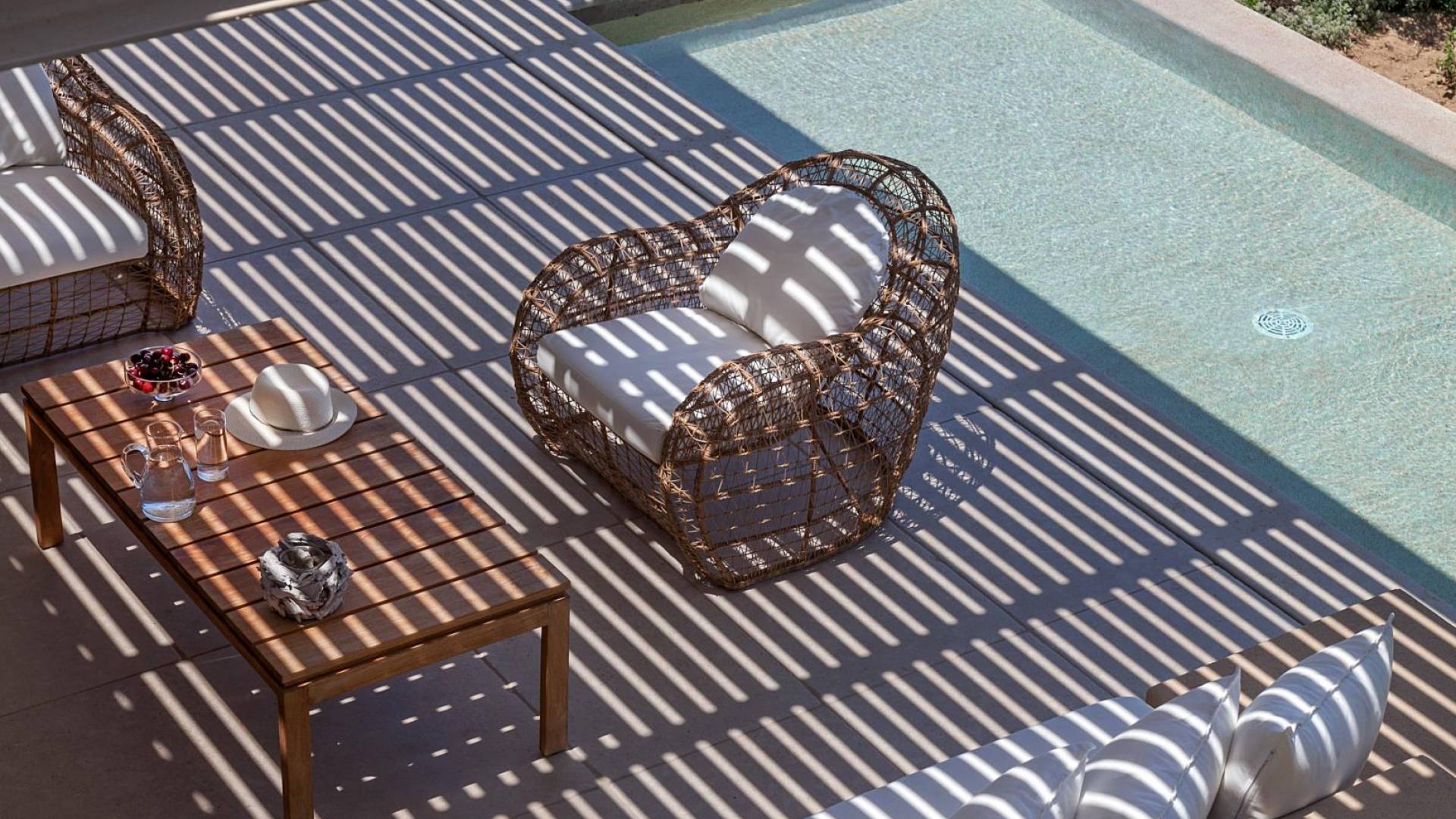 - Two Patios with built-in sofas, rattan furniture, and fluffy pillows