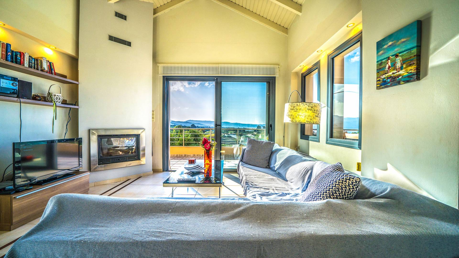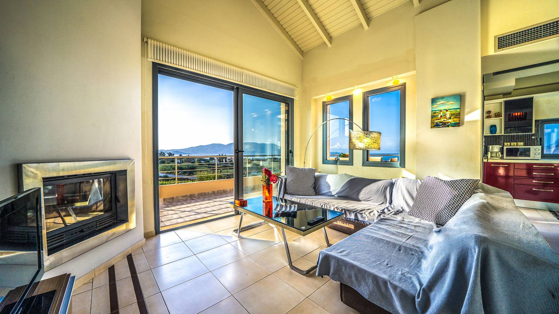- Spacious living room with fireplace, large sofa & sunset views