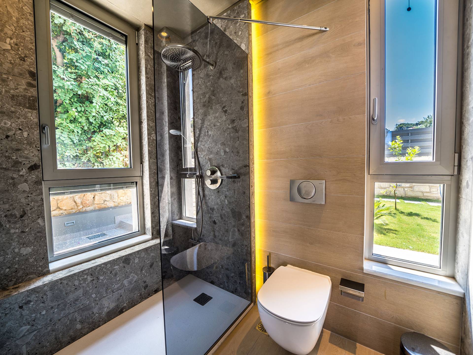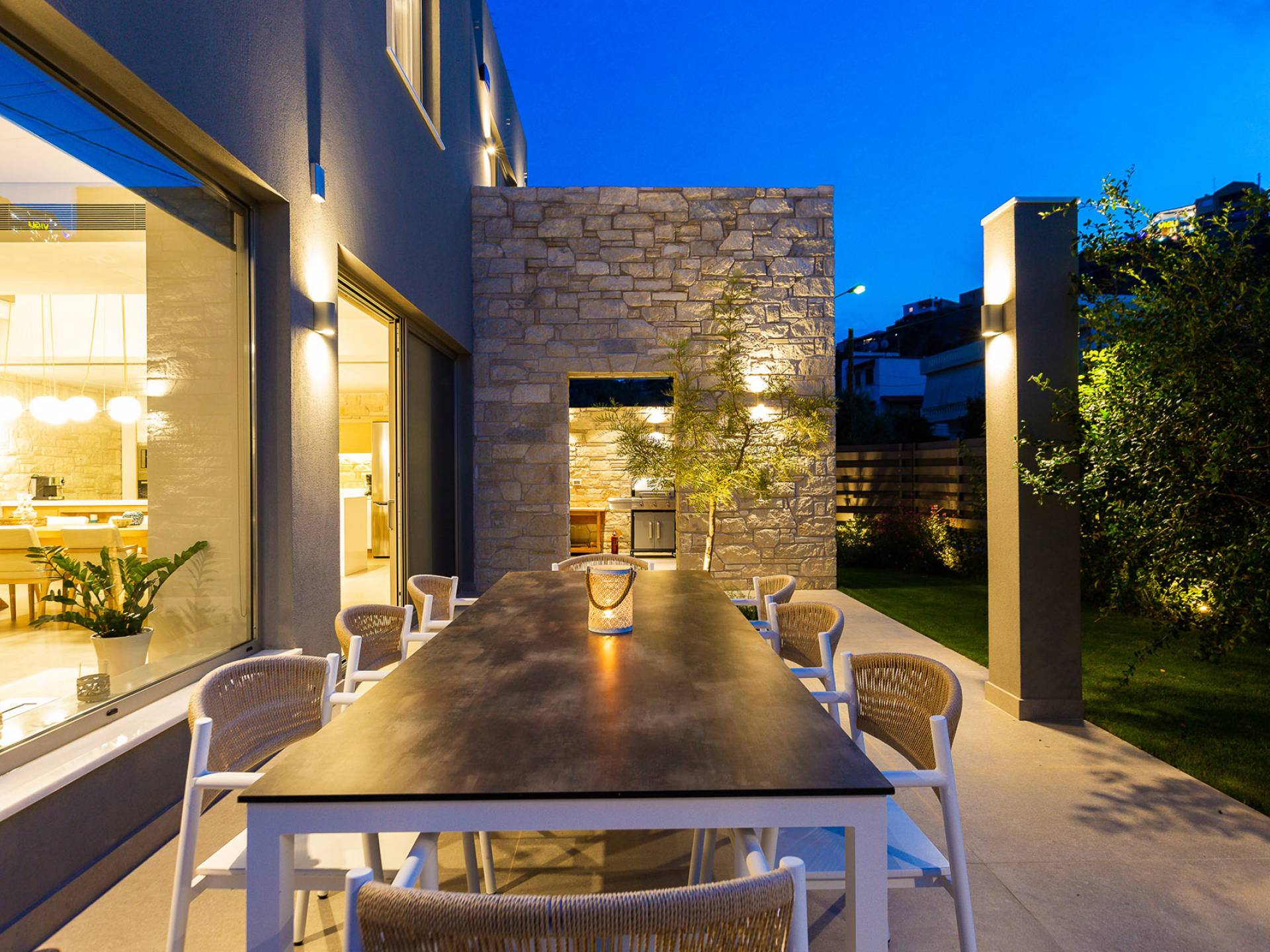 The outdoor area is covered at its most part by a large heated swimming pool 105 sqm with whirlpool which is divided into two parts, one suitable for small children. A living room and a dining room surround the building. The luxurious accommodation in the villa is completed with extra facilities such as a wellness area with a treadmill and multi- instrument gym, BBQ and private parking.