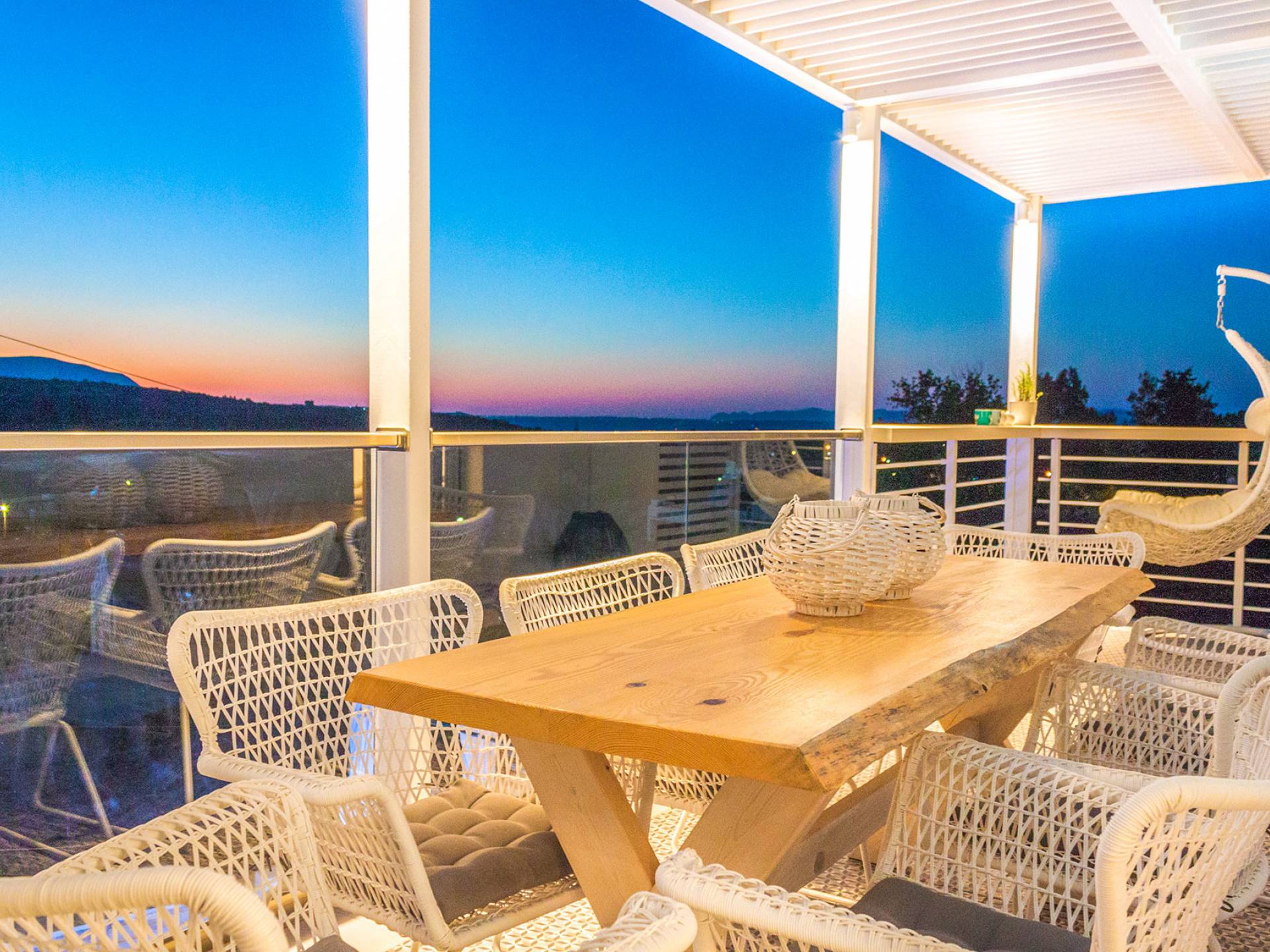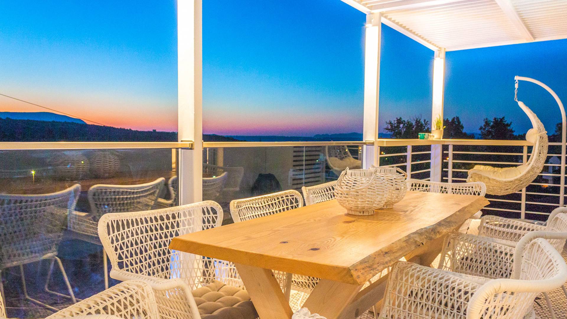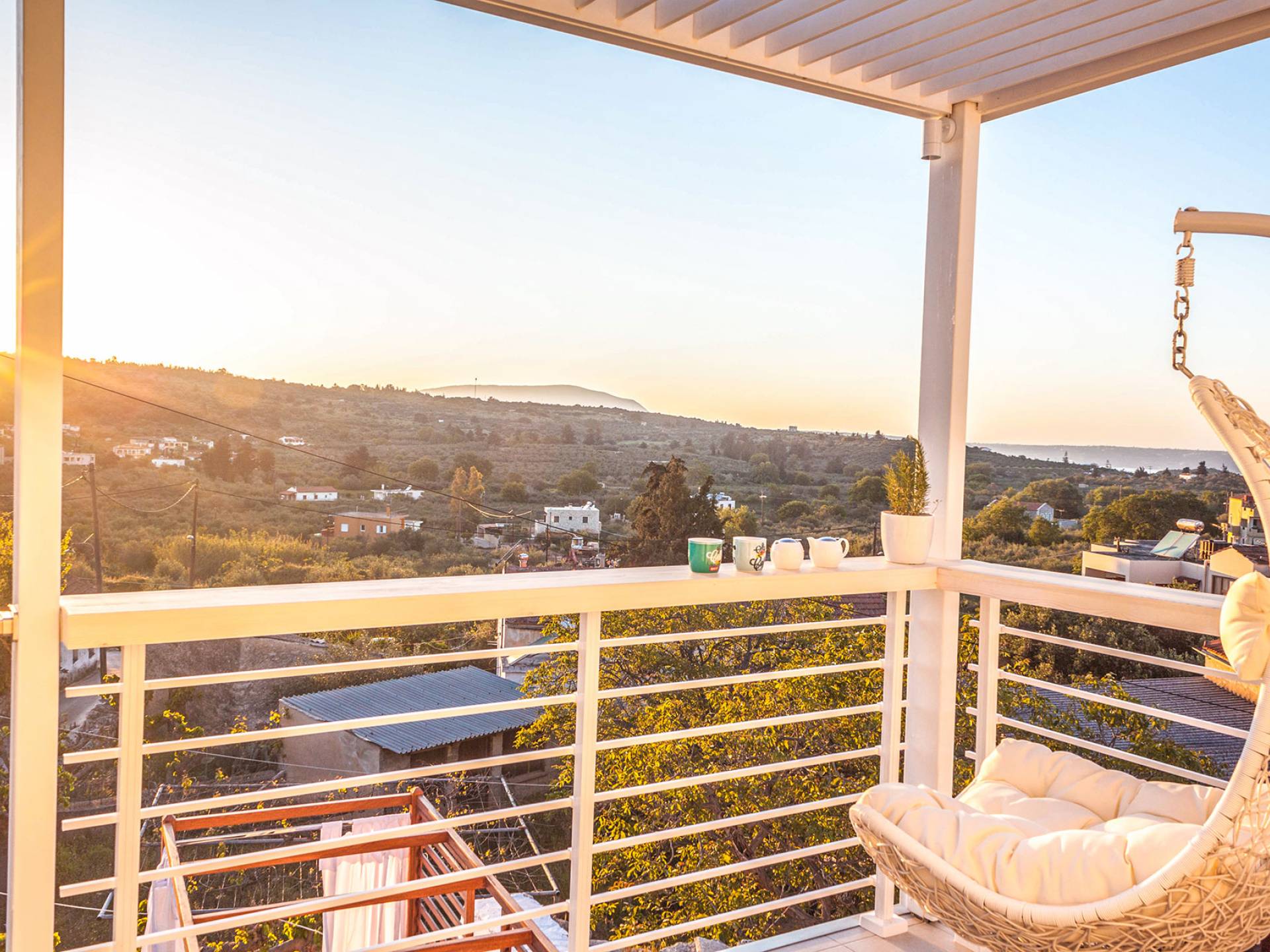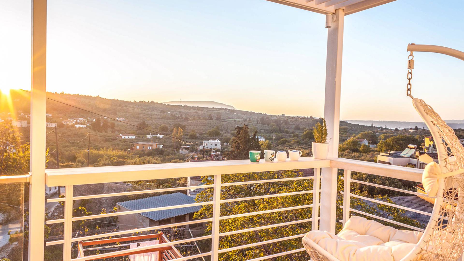 - The sunset-view balcony with swing chairs & mountain panorama