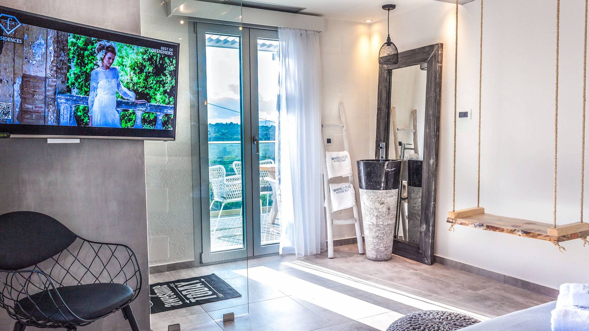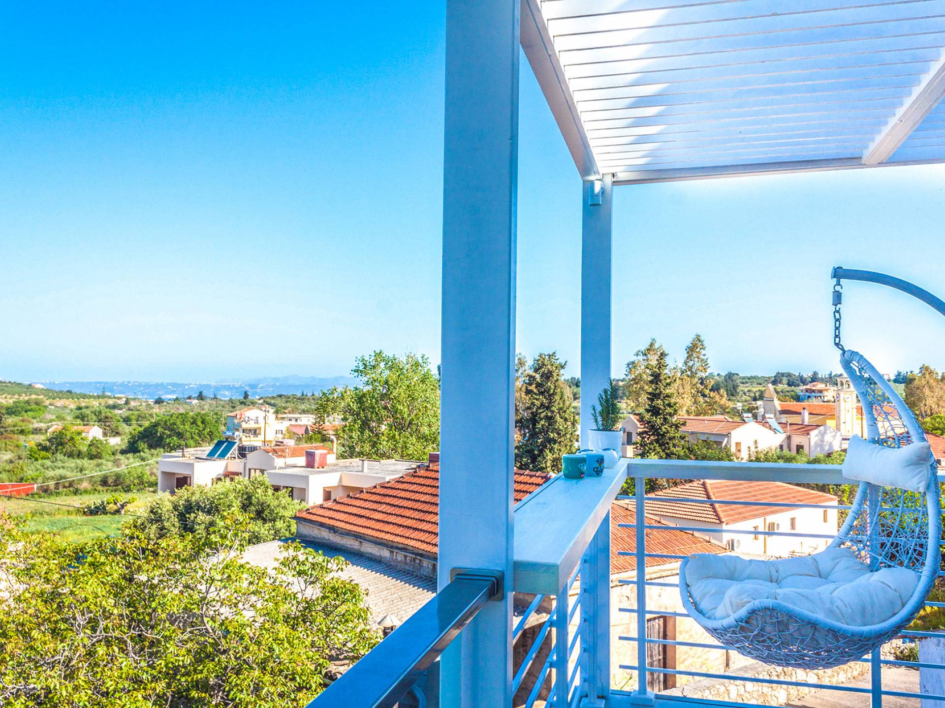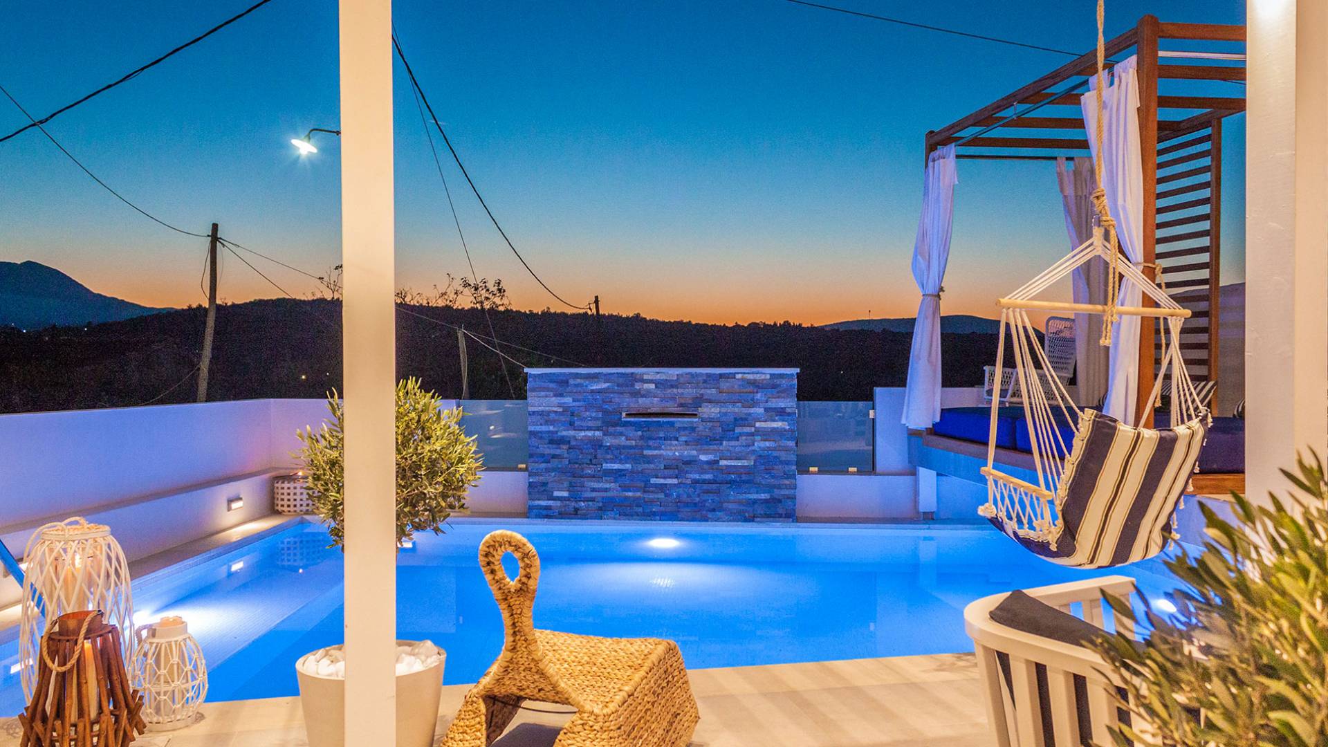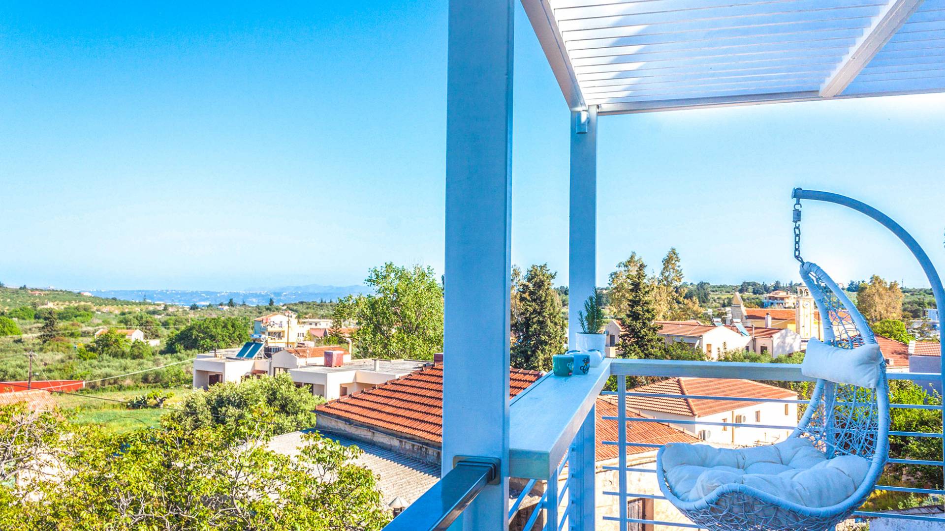 - The sunset-view balcony with swing chairs & mountain panorama