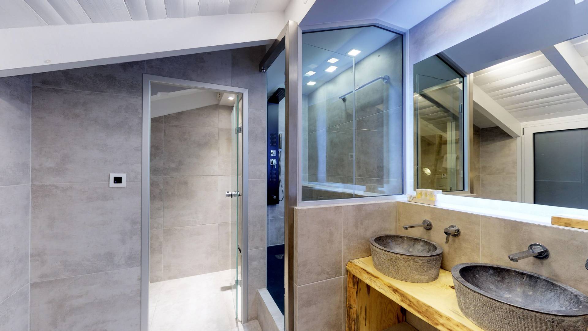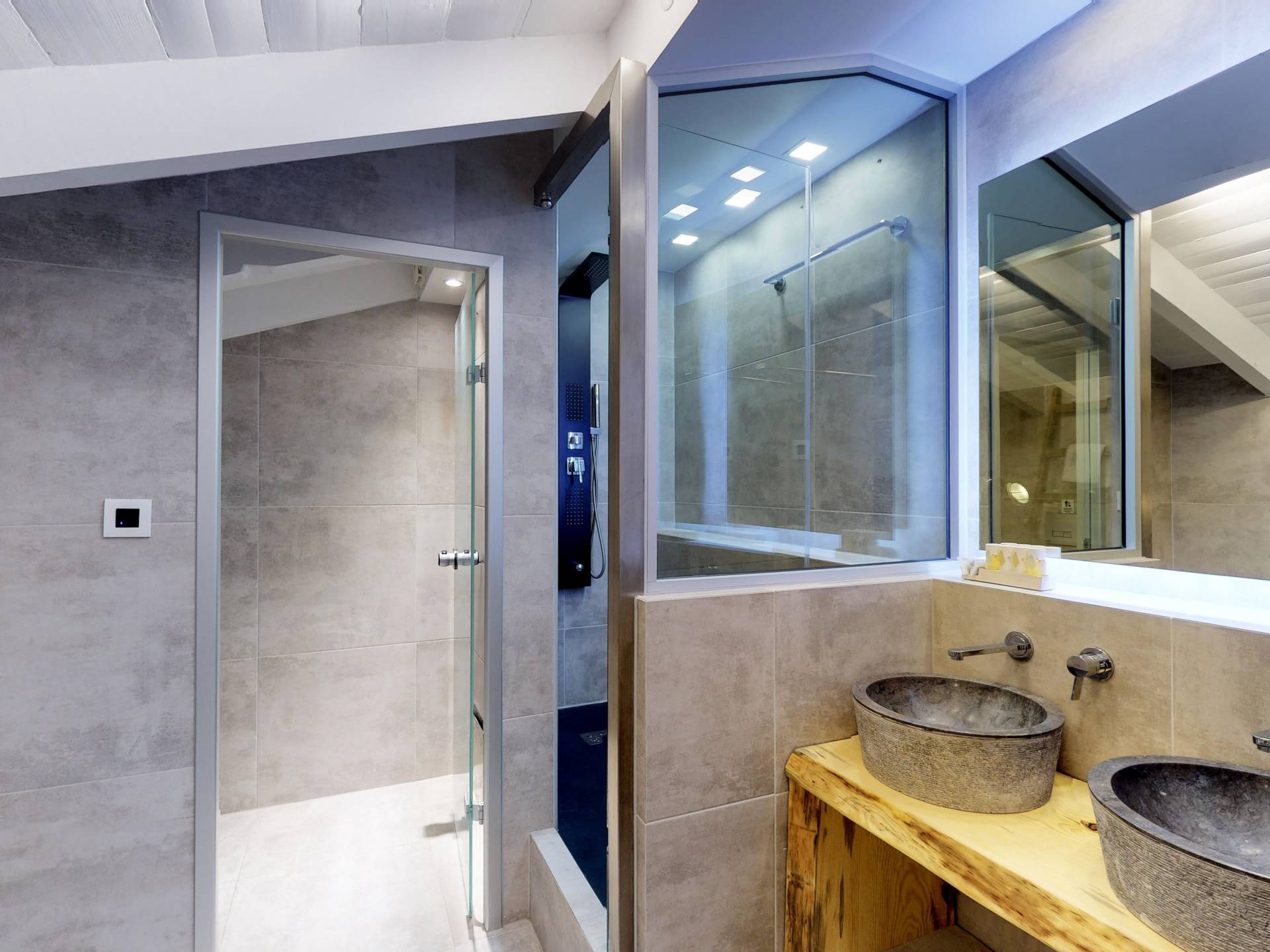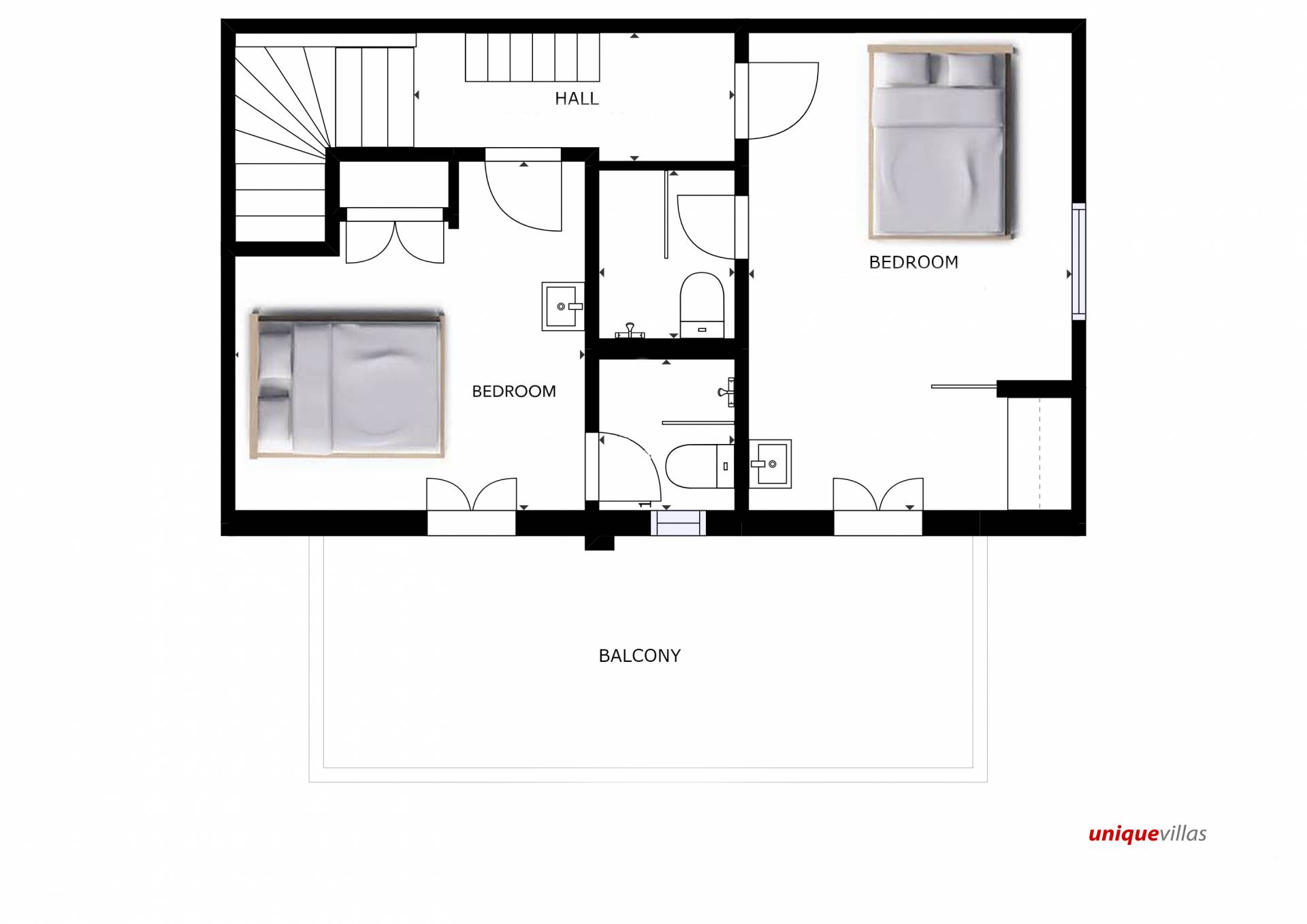- First Floor: 2 bedrooms with queen beds, hydromassage showers & access to a panoramic balcony
