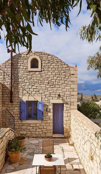 Orelia Cretan Villas are located at the crest of a small hill near the village of Kamilari, overlooking the deep blue waters of the Mediterranean Sea and facing the top of Mount Psiloritis. The villas and deluxe apartments are just 2 kilometers from the nearby seaside resort of Kalamaki.