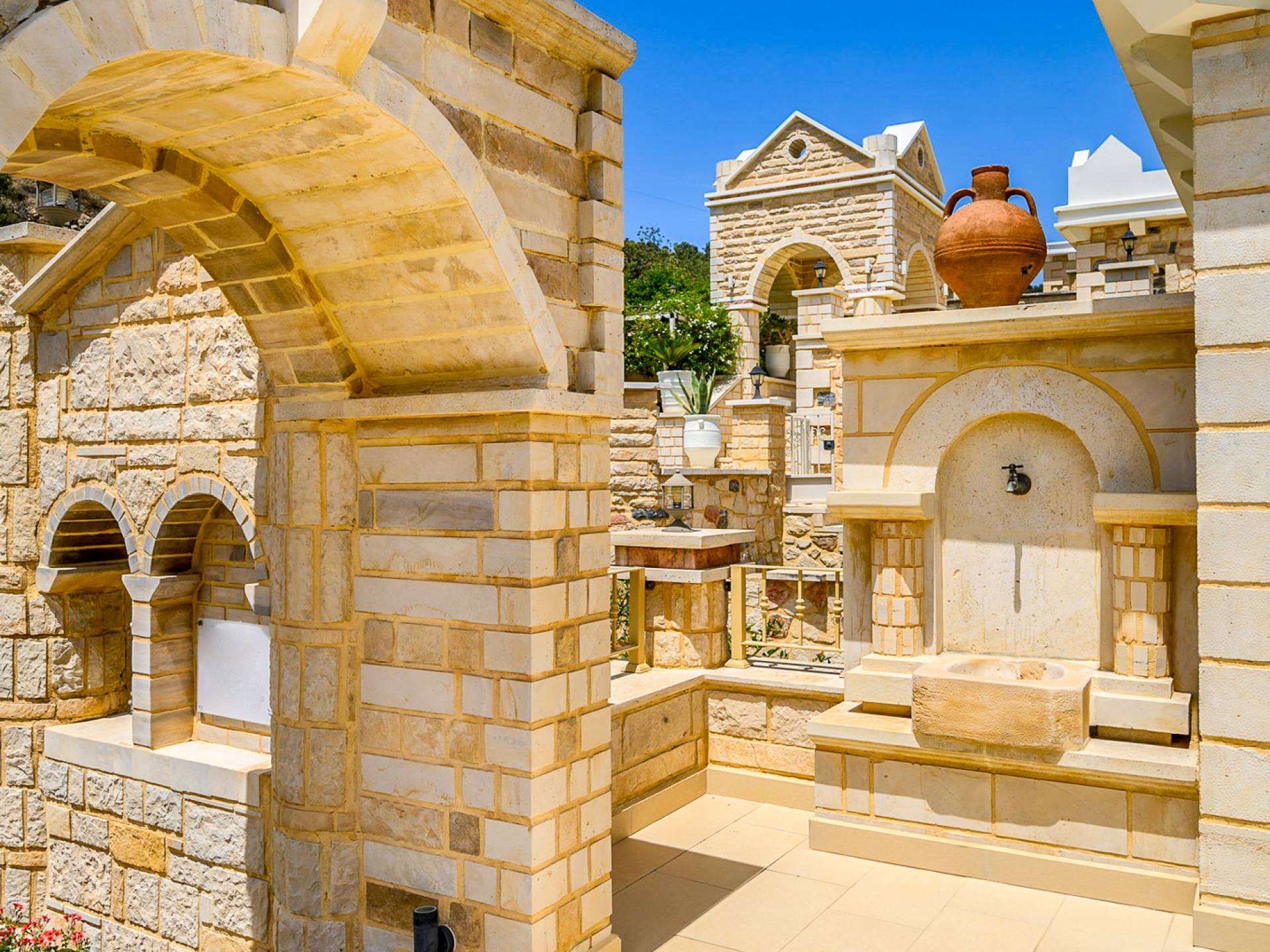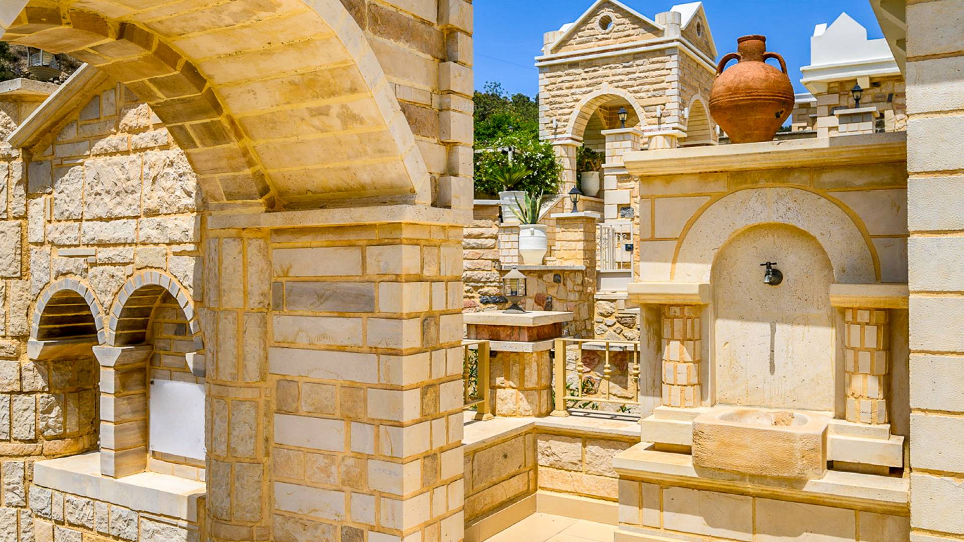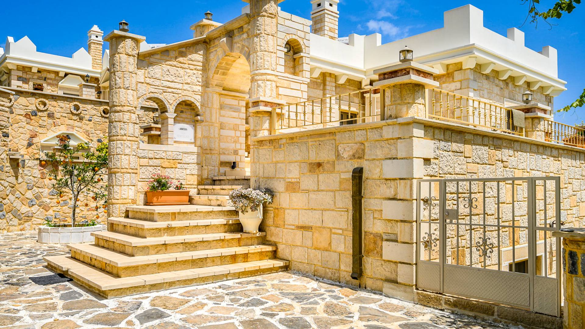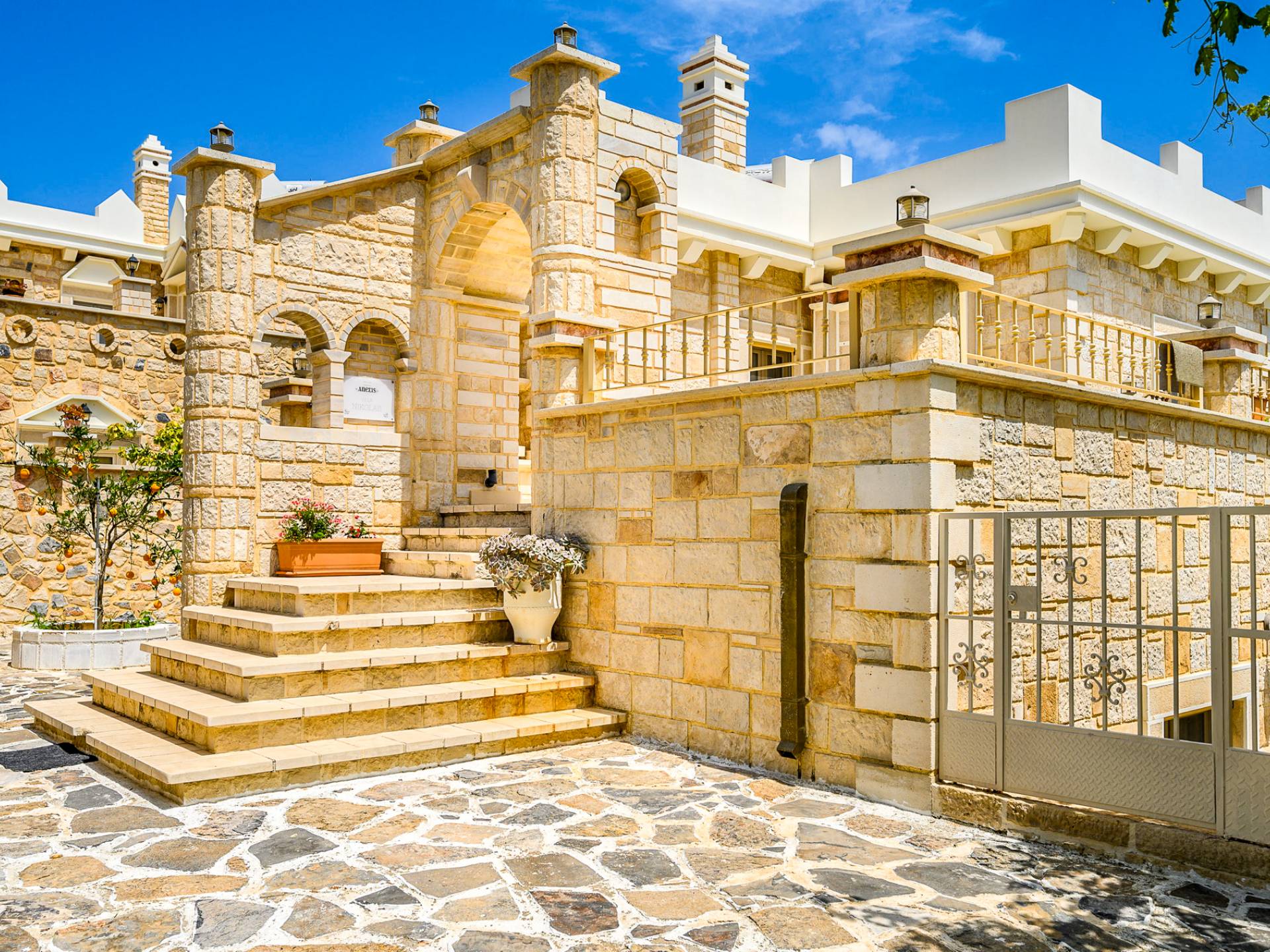 Kamilari village in Heraklion Crete is located in southern Crete, close to the villages of Mires, Timpaki, and to famous Matala. Kamilari is 4 km from the important archaeological site of Festos and close to the verdant plain of Messara with the traditional villages, turquoise beaches, and its vibrant history. Kamilari is built on the top of three hills and it is a tranquil, traditional village with a splendid panoramic view of the top of Psiloritis Mountain, the olive groves of Messara, and the eternal blue of the Libyan Sea. The stone-built houses of the village with their beautiful gardens and bougainvillea coloring their walls compose the most picturesque frame and add greatly to its beauty.