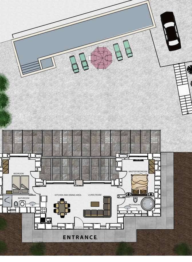 The Ground floor consists of an open plan living and dining room area, two bedrooms 1st bedroom provides a king size bed and en-suite bathroom with Hydro-massage bathtub. 2nd bedroom provides two single beds which can be converted into a double king size bed and en-suite bathroom with a shower. and two sofas in the living room area that can be converted into two single beds The beds and the sofas are Coco-mat, made from high-quality natural ingredients for a unique sleeping and relaxation experience. Total interior space of the villa 80 m2.