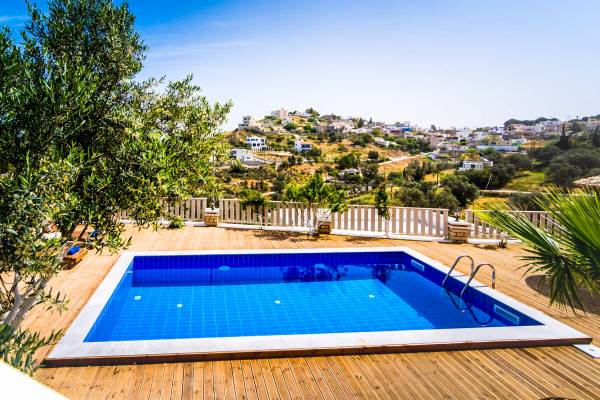 The villa is located in Kamilari, a peaceful hilltop village overlooking the Messara Plain and the Libyan Sea. This area is ideal for guests who want authentic village life while being close to some of the most beautiful beaches, cultural landmarks, and natural attractions in southern Crete.