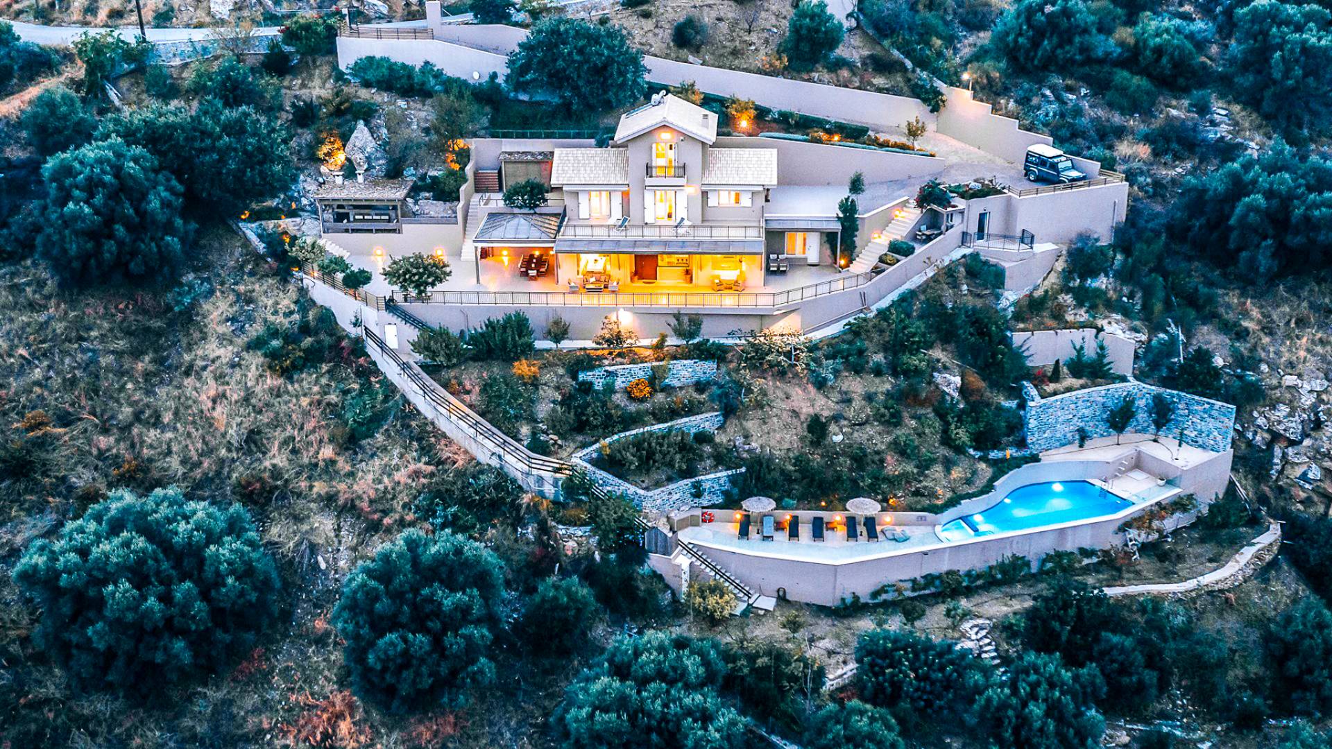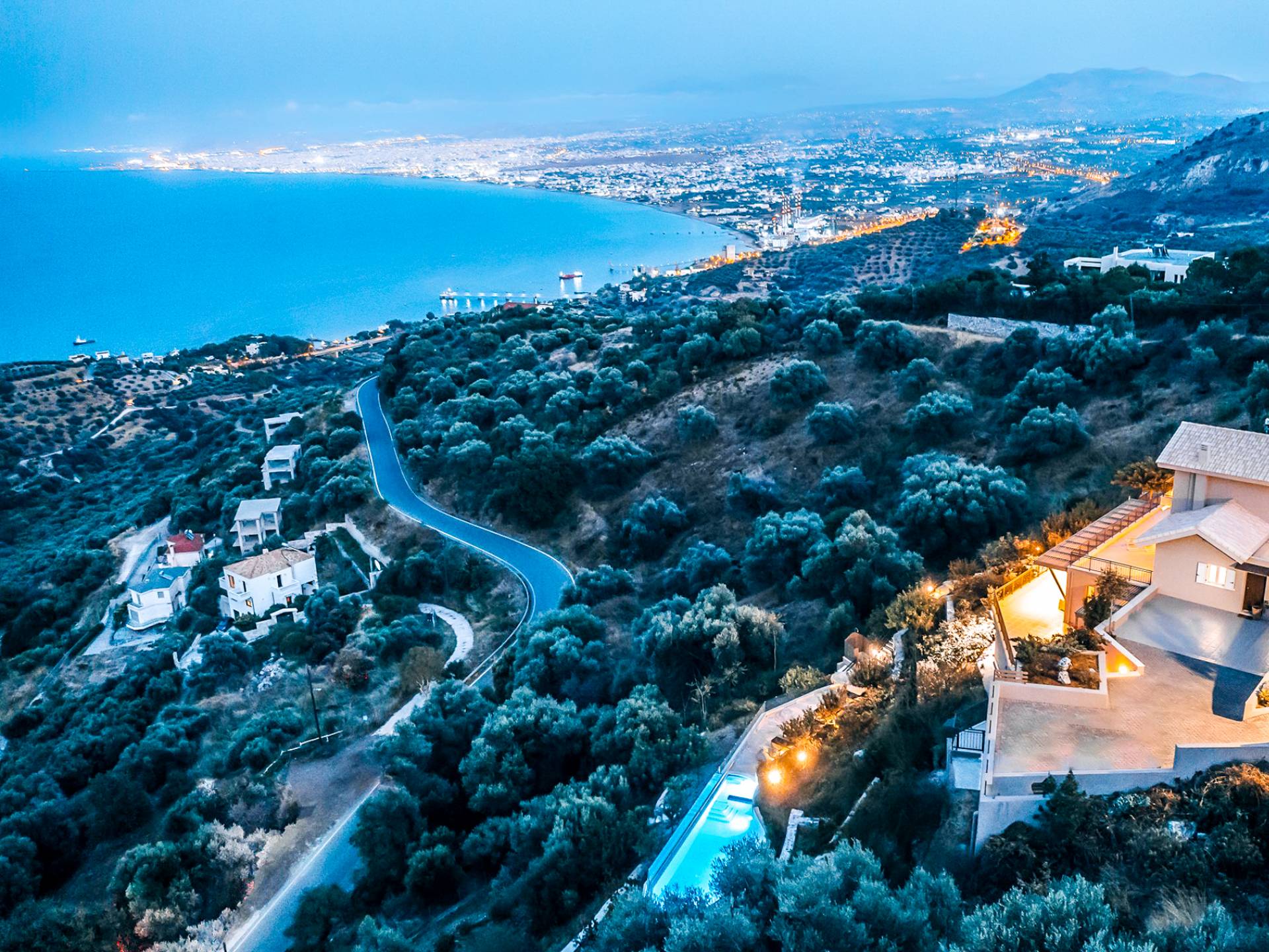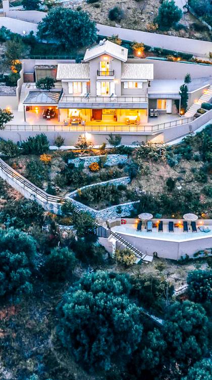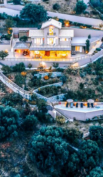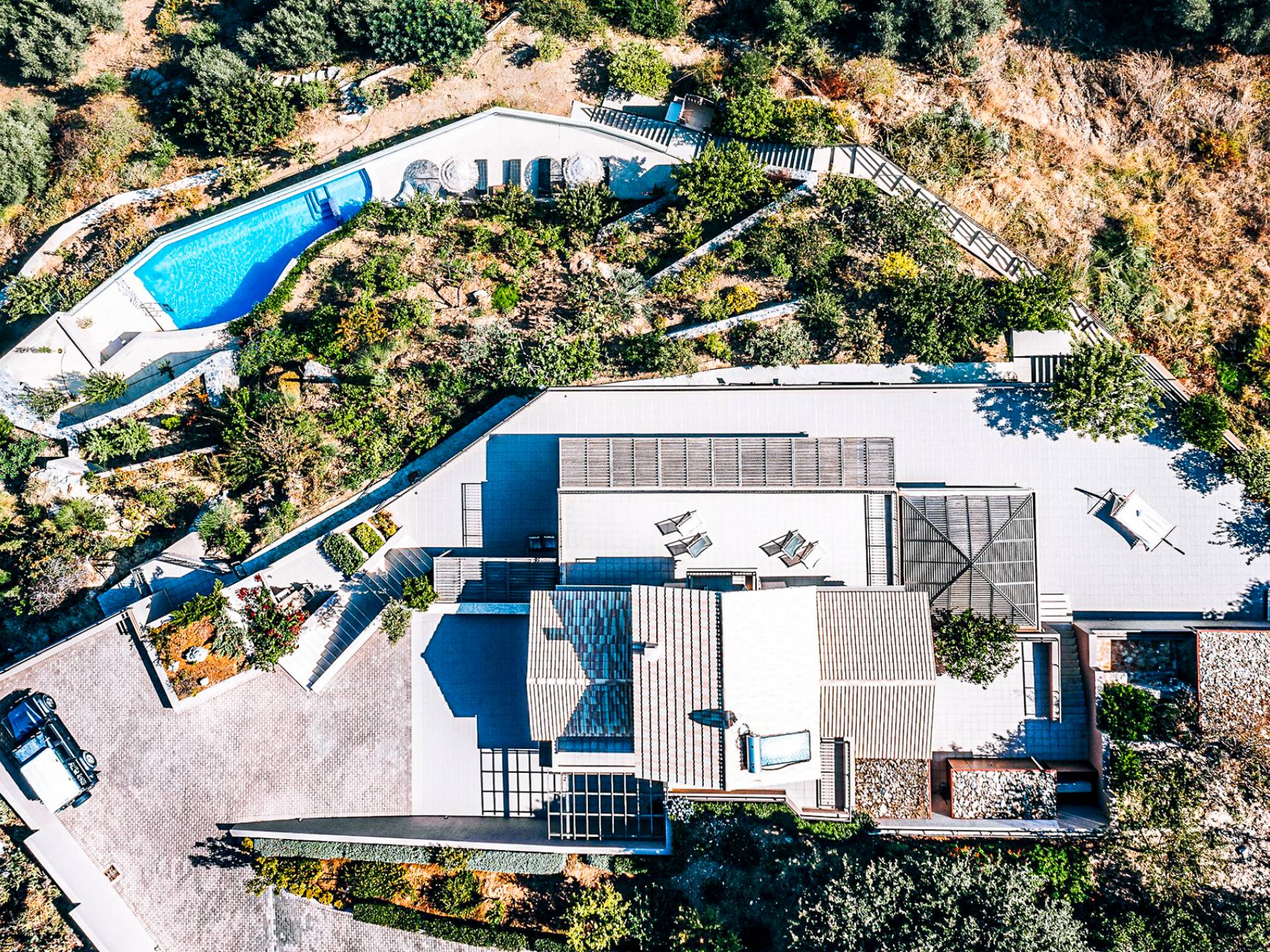 Perched atop the hill above Pantanassa, on the slopes of Rodia mount, Villa Omikron offers spectacular panoramic vistas of the Aegean sea, Heraklion gulf, Dia island, and the surrounding mountains, as well as colorful sunset views. Located on a 2700 m2 plot near the picturesque village of Rodia and just a short drive away from Heraklion town may be your starting point to explore all the island of Crete has to offer or serve as your private paradise for refreshment and recreation.