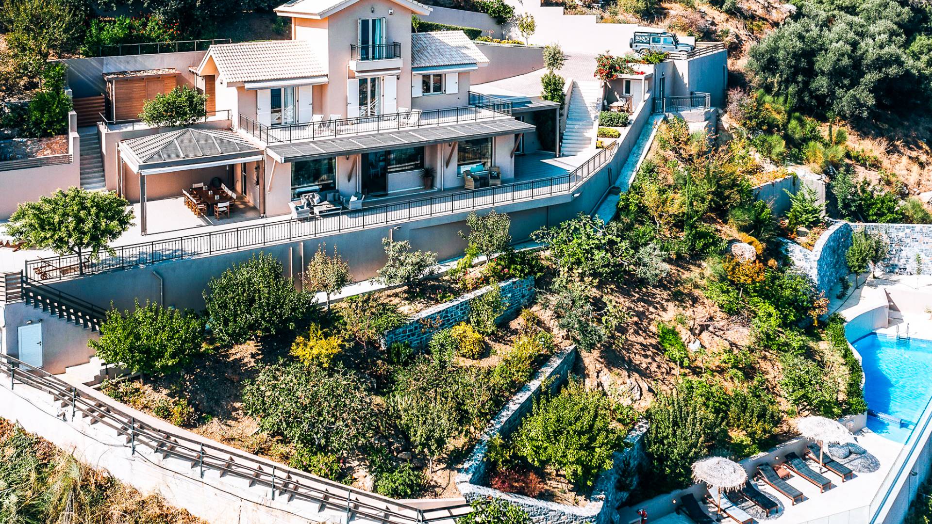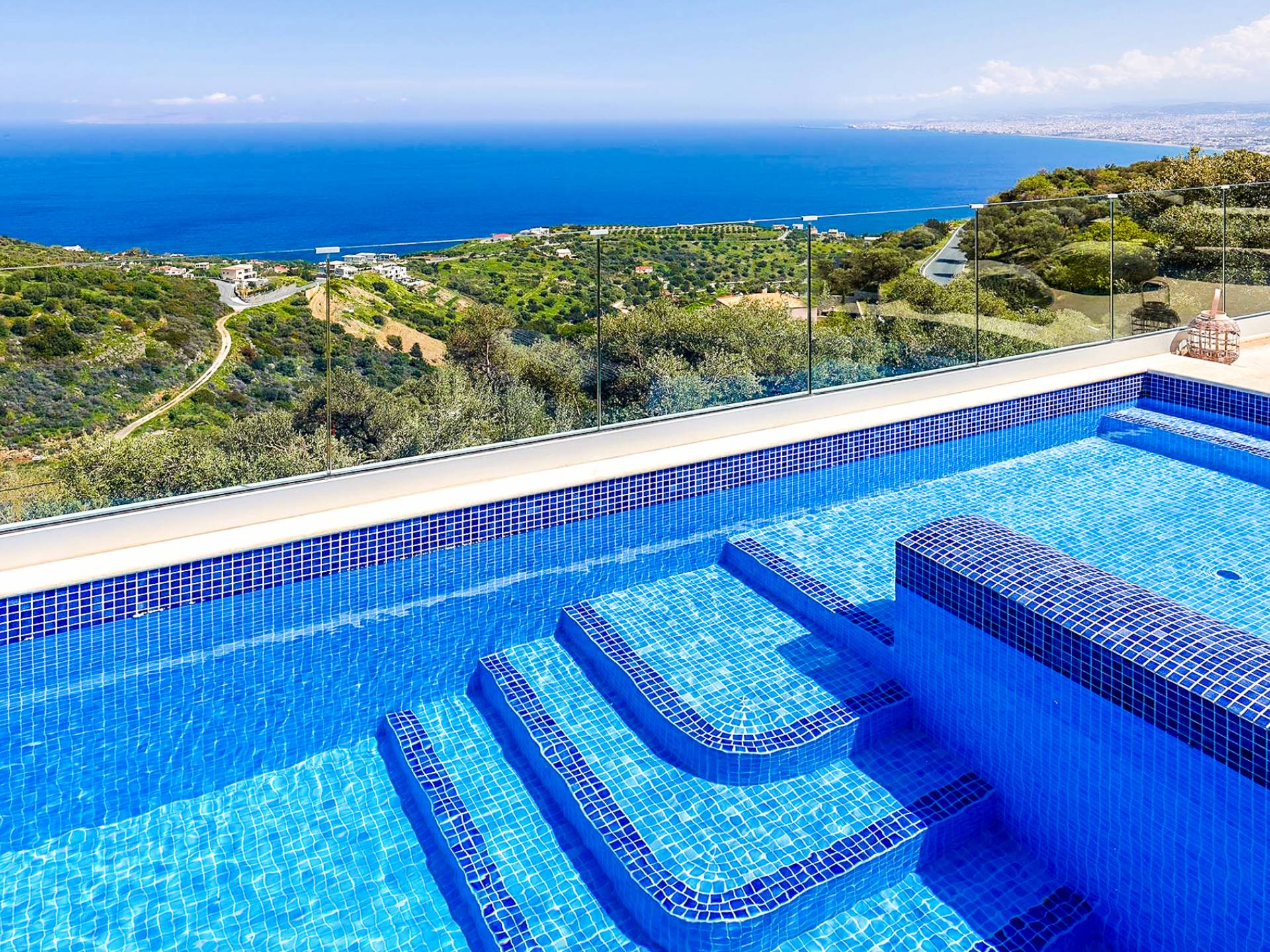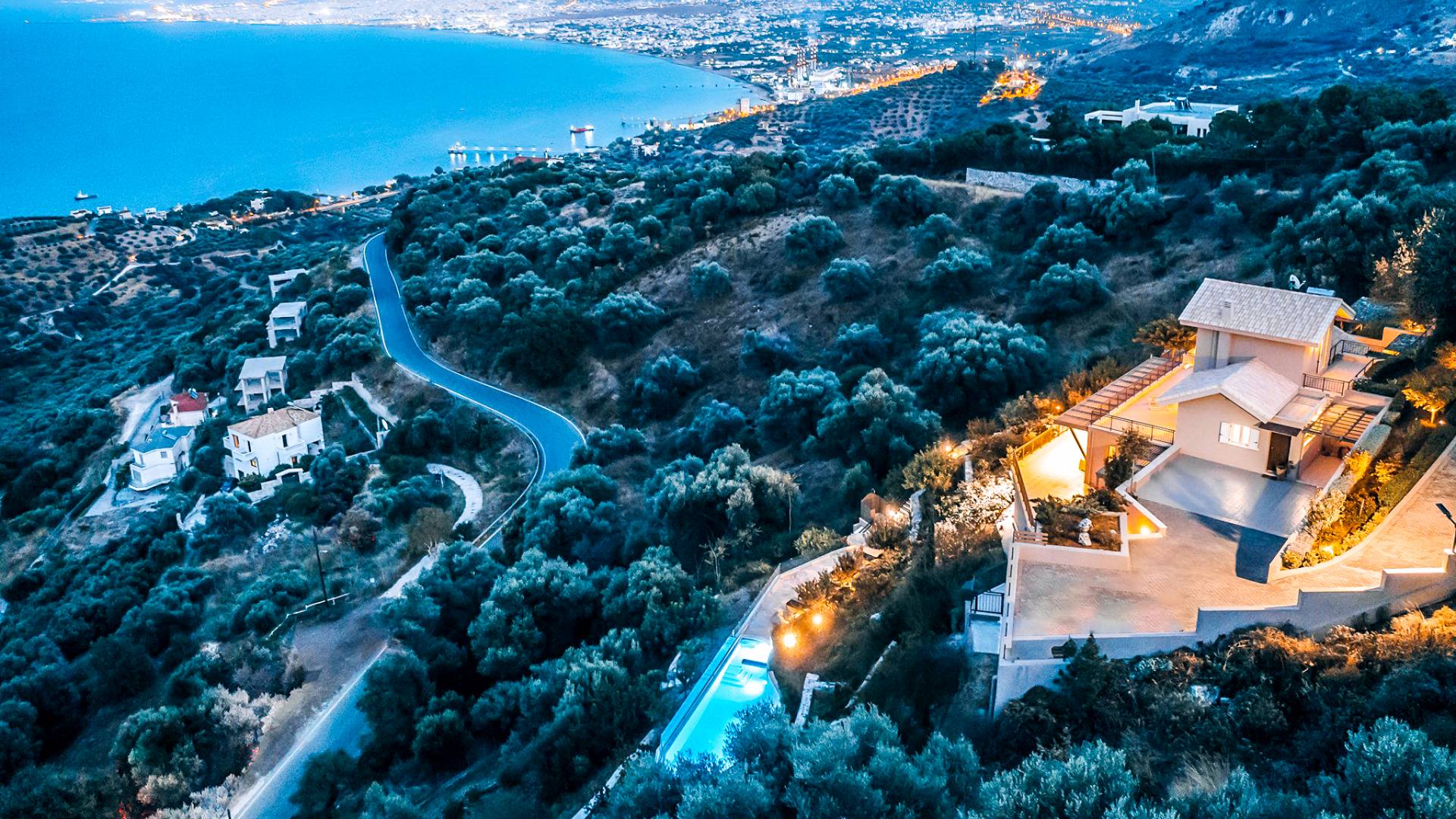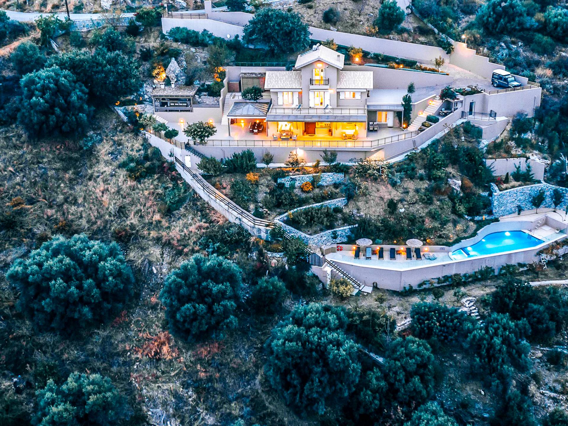 Perched atop the hill above Pantanassa, on the slopes of Rodia mount, Villa Omikron offers spectacular panoramic vistas of the Aegean sea, Heraklion gulf, Dia island, and the surrounding mountains, as well as colorful sunset views. Located on a 2700 m2 plot near the picturesque village of Rodia and just a short drive away from Heraklion town may be your starting point to explore all the island of Crete has to offer or serve as your private paradise for refreshment and recreation.