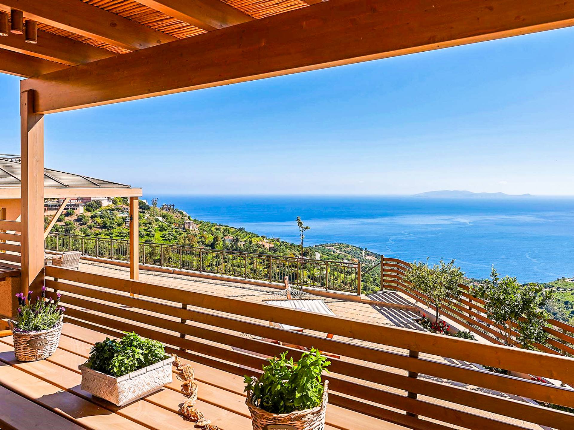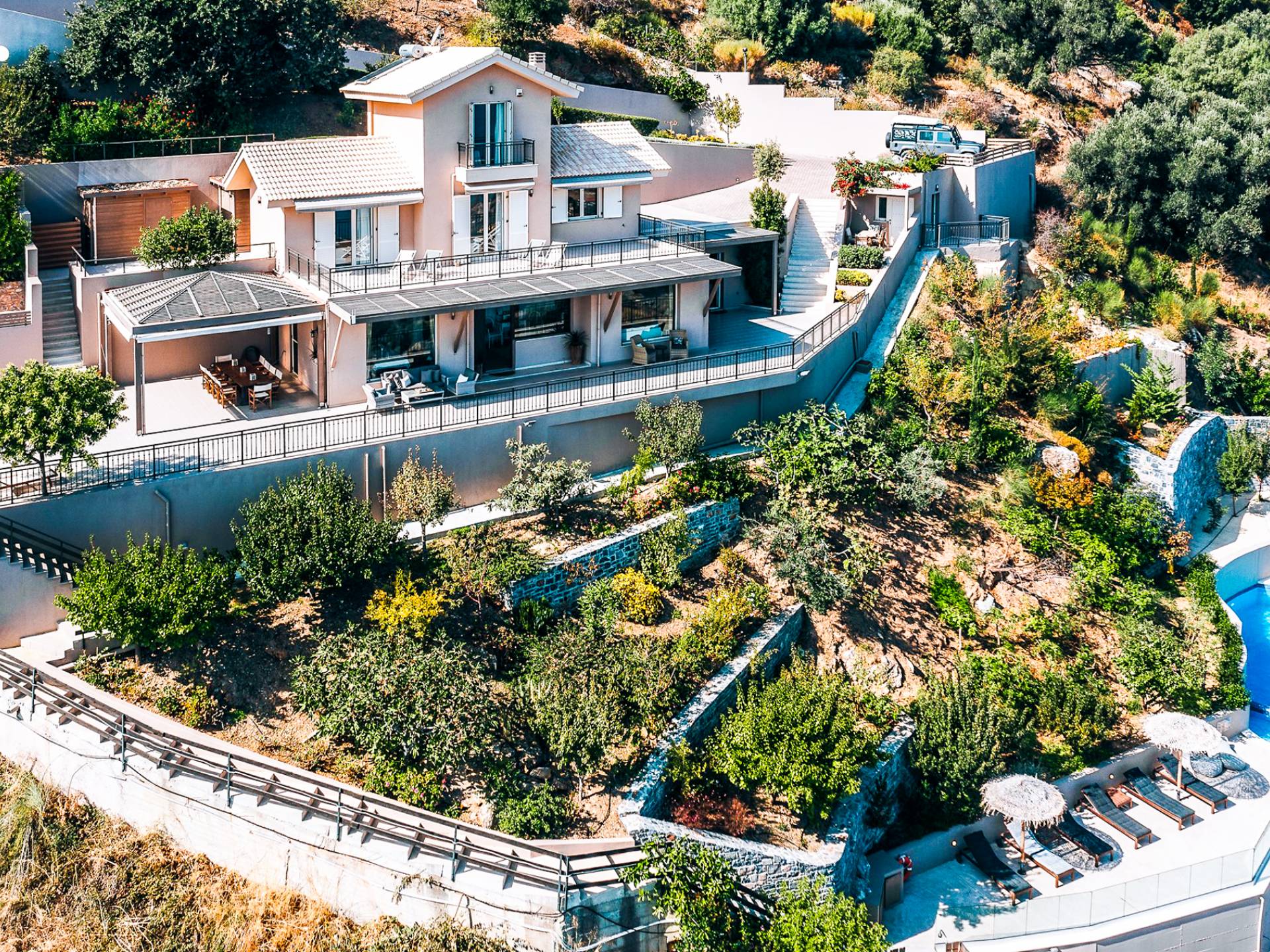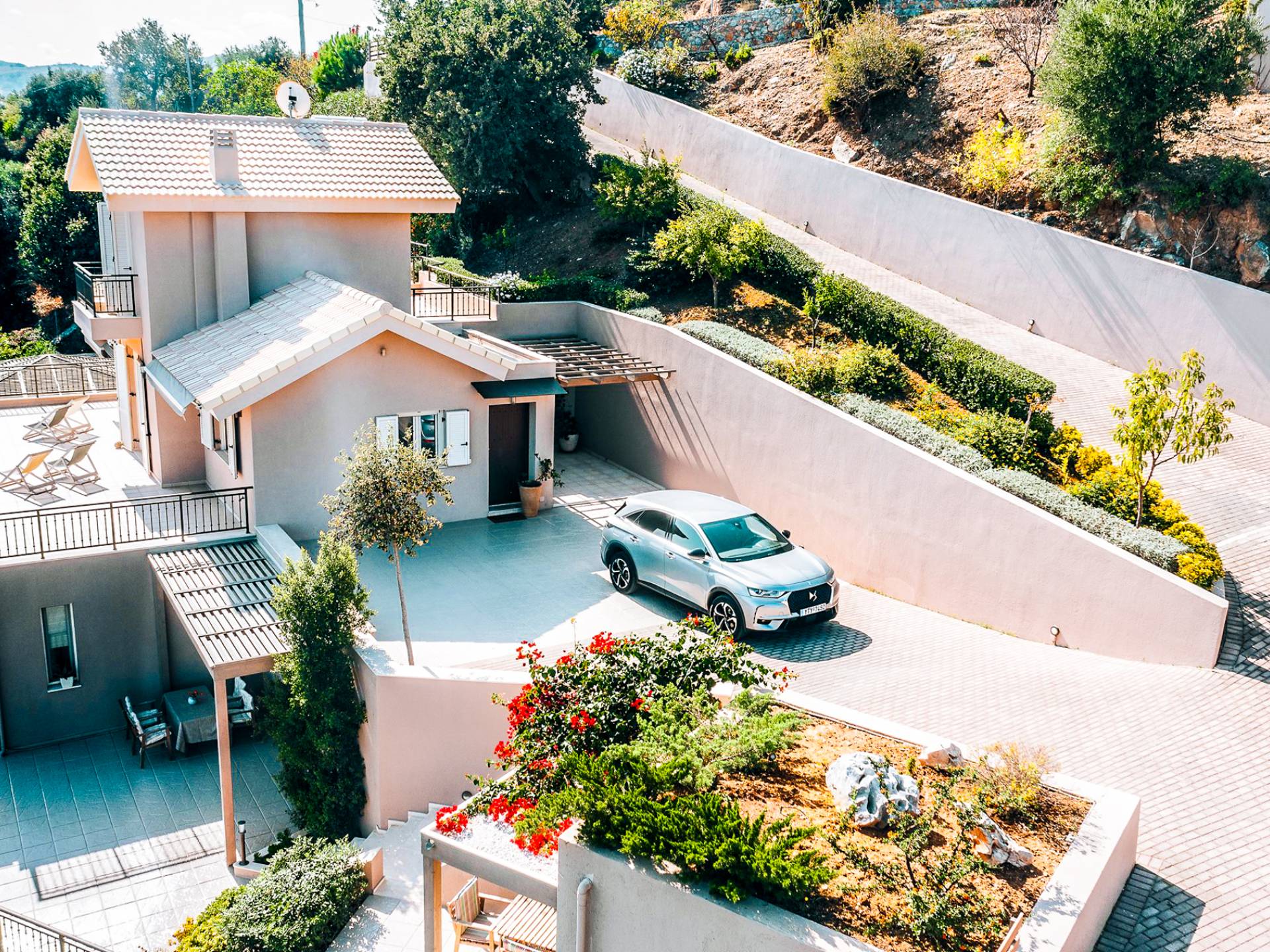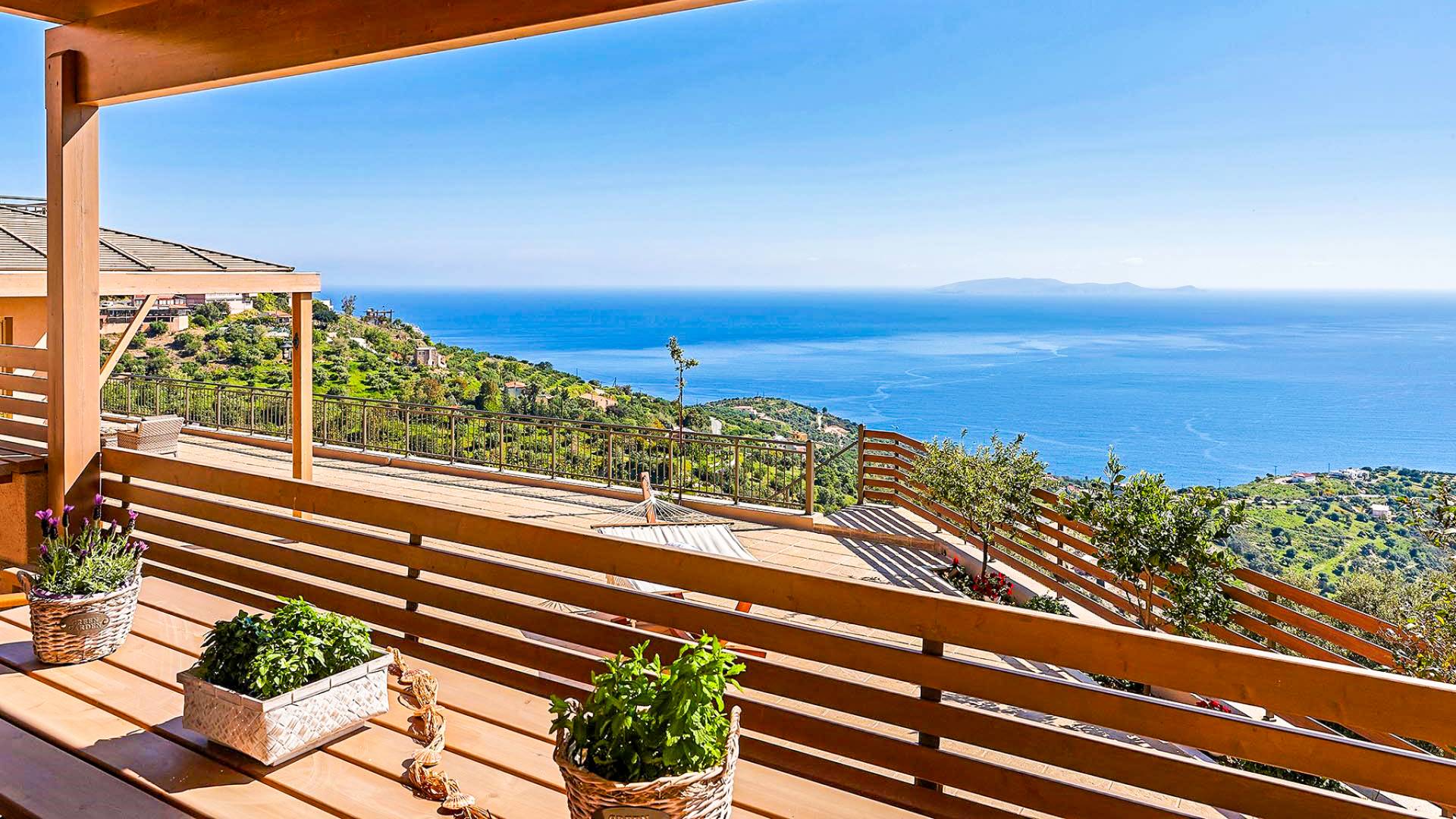 Following the stairs upwards, you will find yourselves in the cute attic, boasting 2 single beds (0,90 x 2,00 ) than can be set up as a Queen bed upon request, A/C, TV, closet, and vanity. The attic opens up to a small Juliet balcony and also to a private veranda at the rear side of the room, equipped with a seating area with a table and 4 chairs. The ample outdoor spaces of Villa Omikron cover 500 m2 and offer absolute privacy and breathtaking views of the sea and the mountains, as well as many facilities