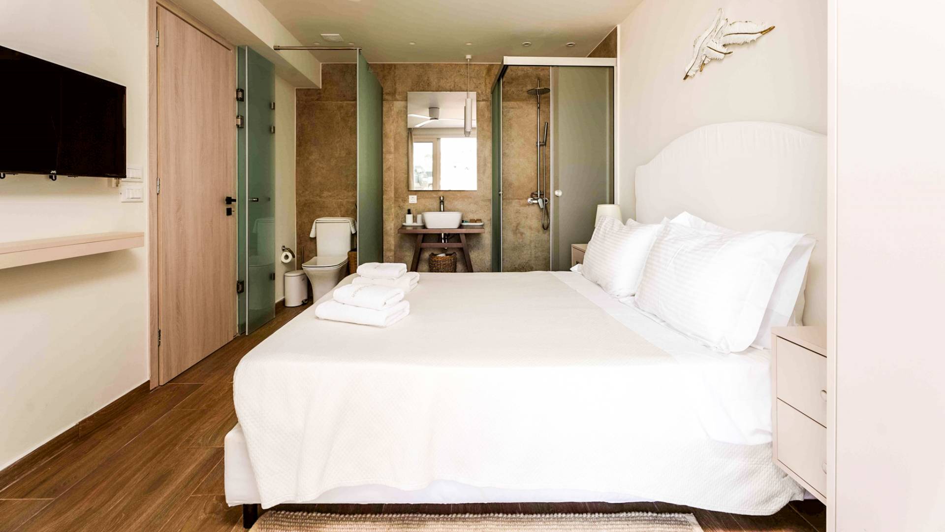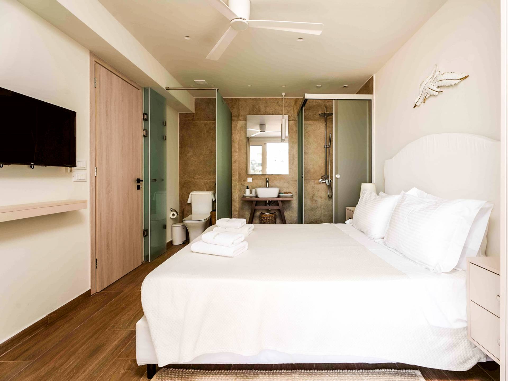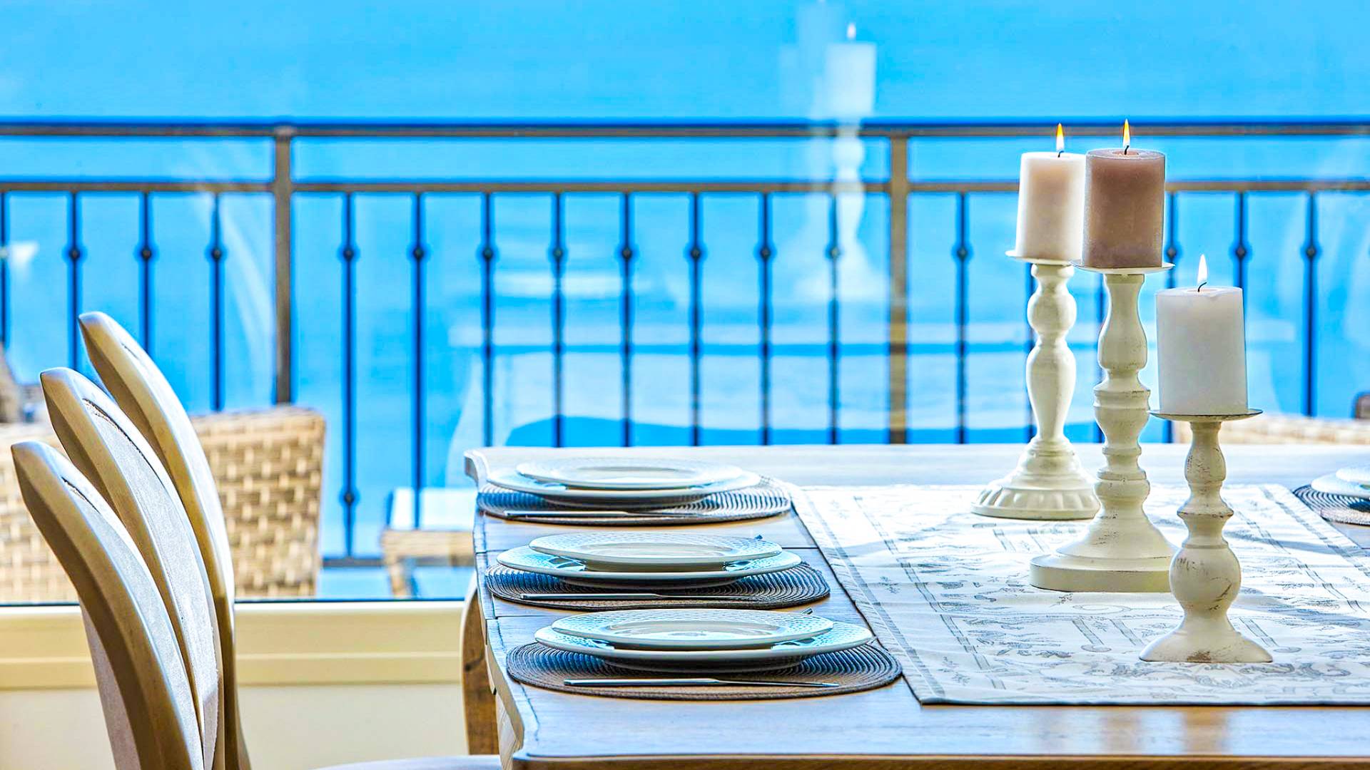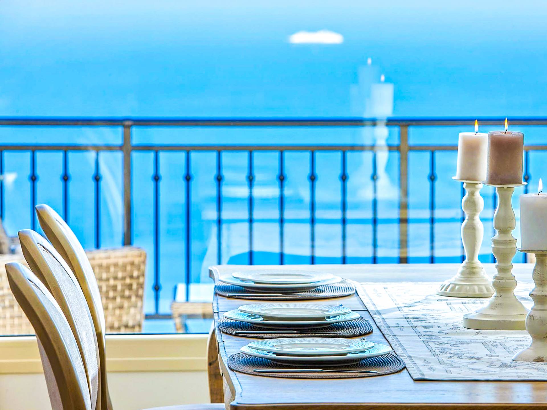 The kitchen offers all the essential appliances in order to prepare your meals, as well as a breakfast table for 4. The adjacent indoor dining area for 8 also enjoys stunning sea views. From the kitchen guests can also access a second dining area on the veranda with a monastery dining table for 10, to choose from according to their preferences. The living room and dining area both enjoy incredible views and a pleasant sea breeze. A WC is also available on this level. On the same level, there is a separate studio with its own private entrance that includes 2 single beds (0,90 x 2,00 ) than can be set up as a Queen bed upon request and a sofa that transforms into a convenient bed for a third guest. The autonomous apartment also enjoys beautiful sea views and features a fully equipped kitchen, a dining area for 4, and an en-suite bathroom.