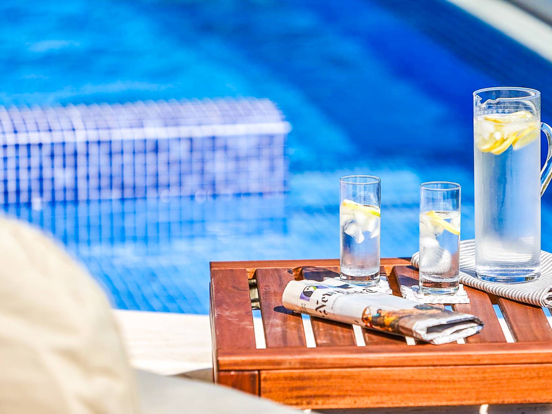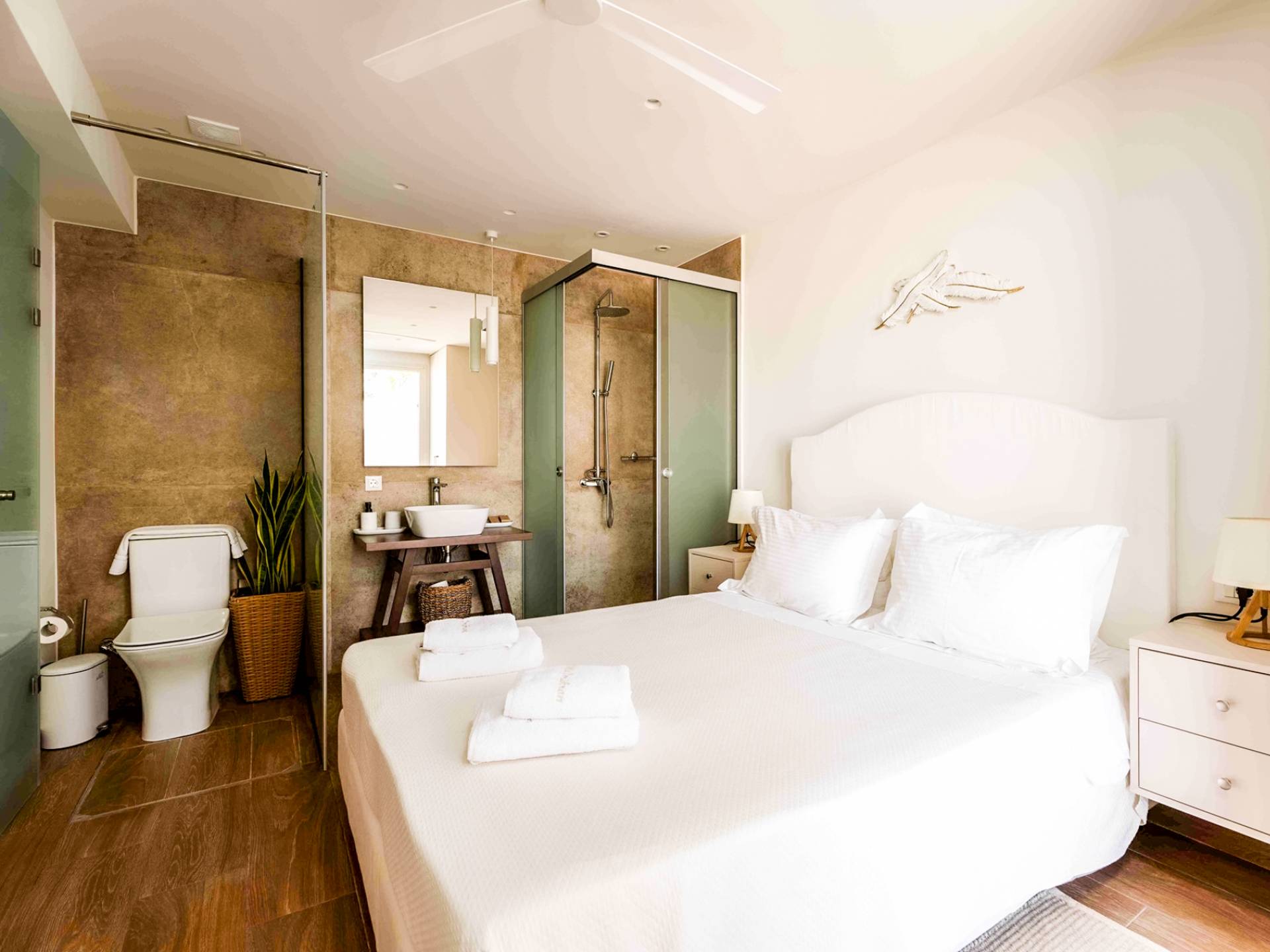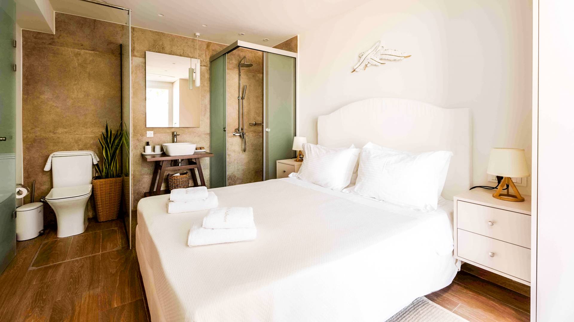 Reaching the first floor guests can find three bedrooms. The spacious master bedroom offers a 1,60 x 2,00 bed, plenty of wardrobe space, vanity, A/C, TV, safety box, and en-suite bathroom with double sinks and shower cabin with hydromassage column. The second bedroom offers a 1,80 x 2,00 bed and en-suite bathroom with shower cabin. The third bedroom features 2 single beds (0,90 x 2,00 ) than can be set up as a Queen bed upon request, A/C, TV, and vanity. Both bedrooms have access to a spacious veranda equipped with chaise longues, the perfect spot to enjoy the sunset with a refreshing drink in your hand. An additional bathroom with a shower cabin with a hydromassage column can also be found on the first floor.