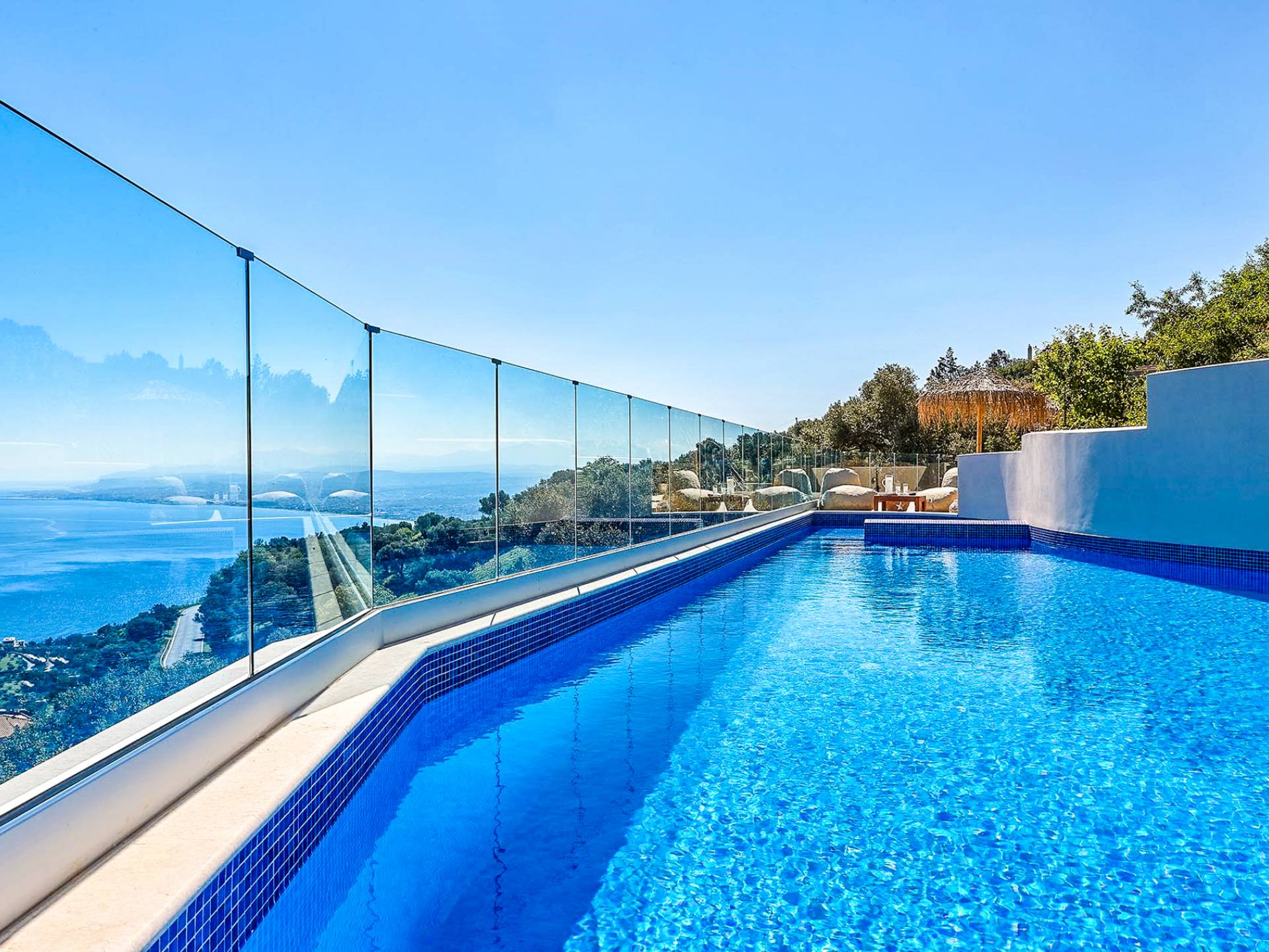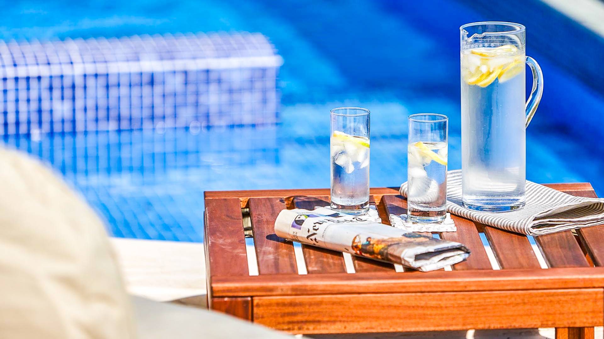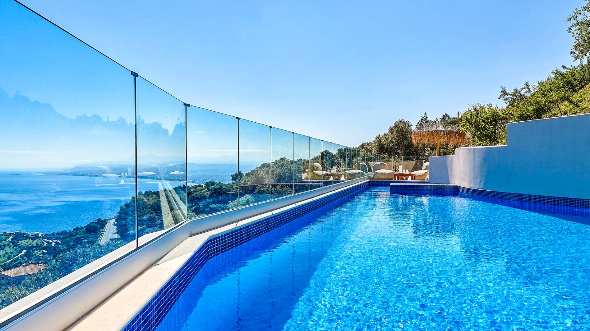 Reaching the first floor guests can find three bedrooms. The spacious master bedroom offers a 1,60 x 2,00 bed, plenty of wardrobe space, vanity, A/C, TV, safety box, and en-suite bathroom with double sinks and shower cabin with hydromassage column. The second bedroom offers a 1,80 x 2,00 bed and en-suite bathroom with shower cabin. The third bedroom features 2 single beds (0,90 x 2,00 ) than can be set up as a Queen bed upon request, A/C, TV, and vanity. Both bedrooms have access to a spacious veranda equipped with chaise longues, the perfect spot to enjoy the sunset with a refreshing drink in your hand. An additional bathroom with a shower cabin with a hydromassage column can also be found on the first floor.