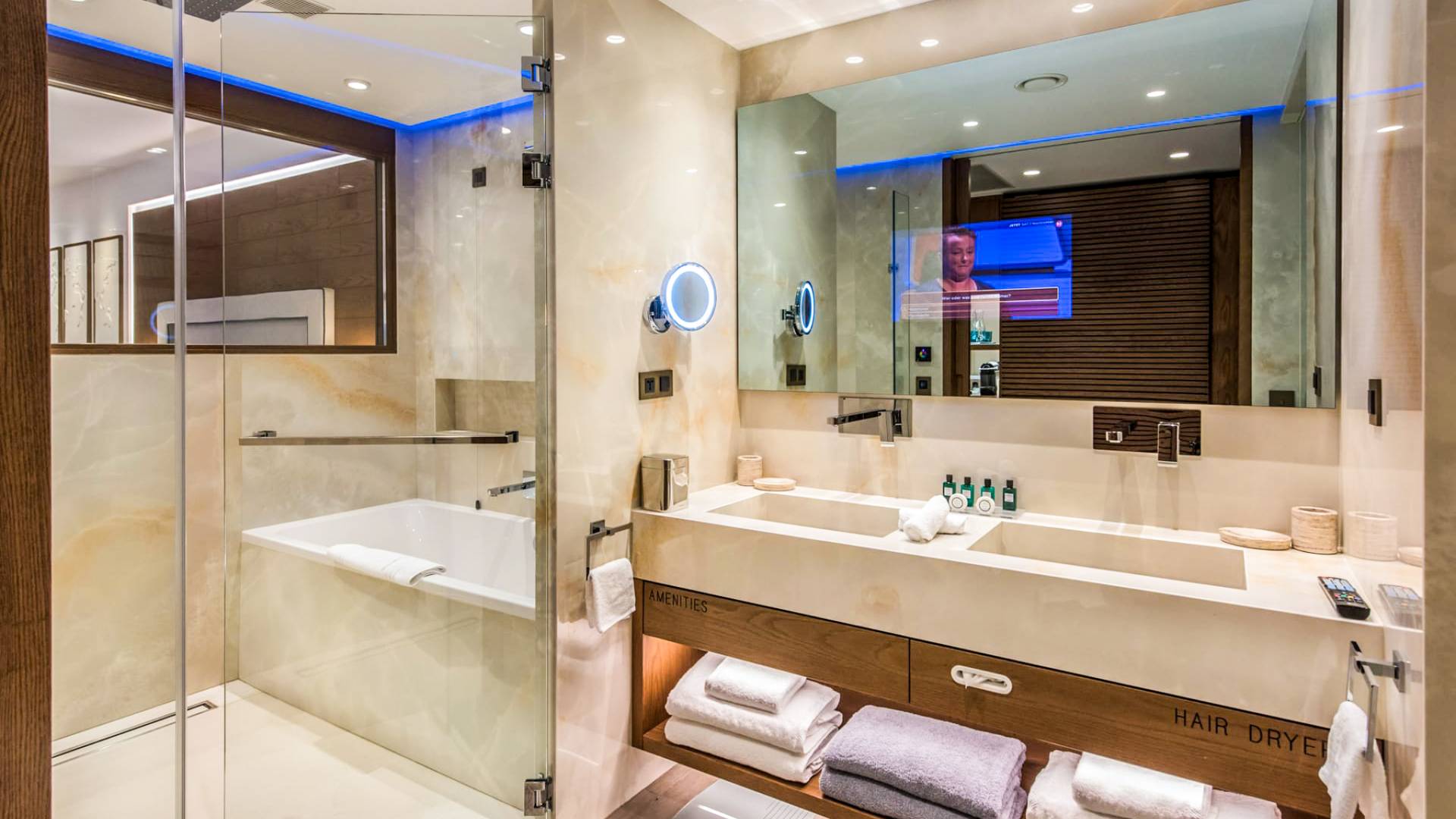 Two lavish king-size bedrooms, one of them a master, comfortably accommodate up to 4 adults. Experience the ultimate stay as high-tech amenities blend with elegant interiors to create a haven of luxury and exclusivity in which every desire is met. In-villa private dining with dishes especially created by a private chef adds to the wonderfully personalized experience.
