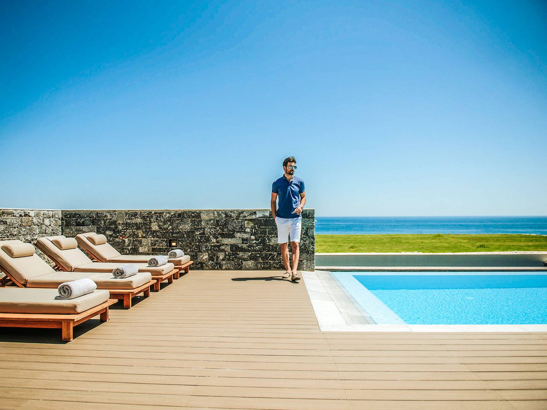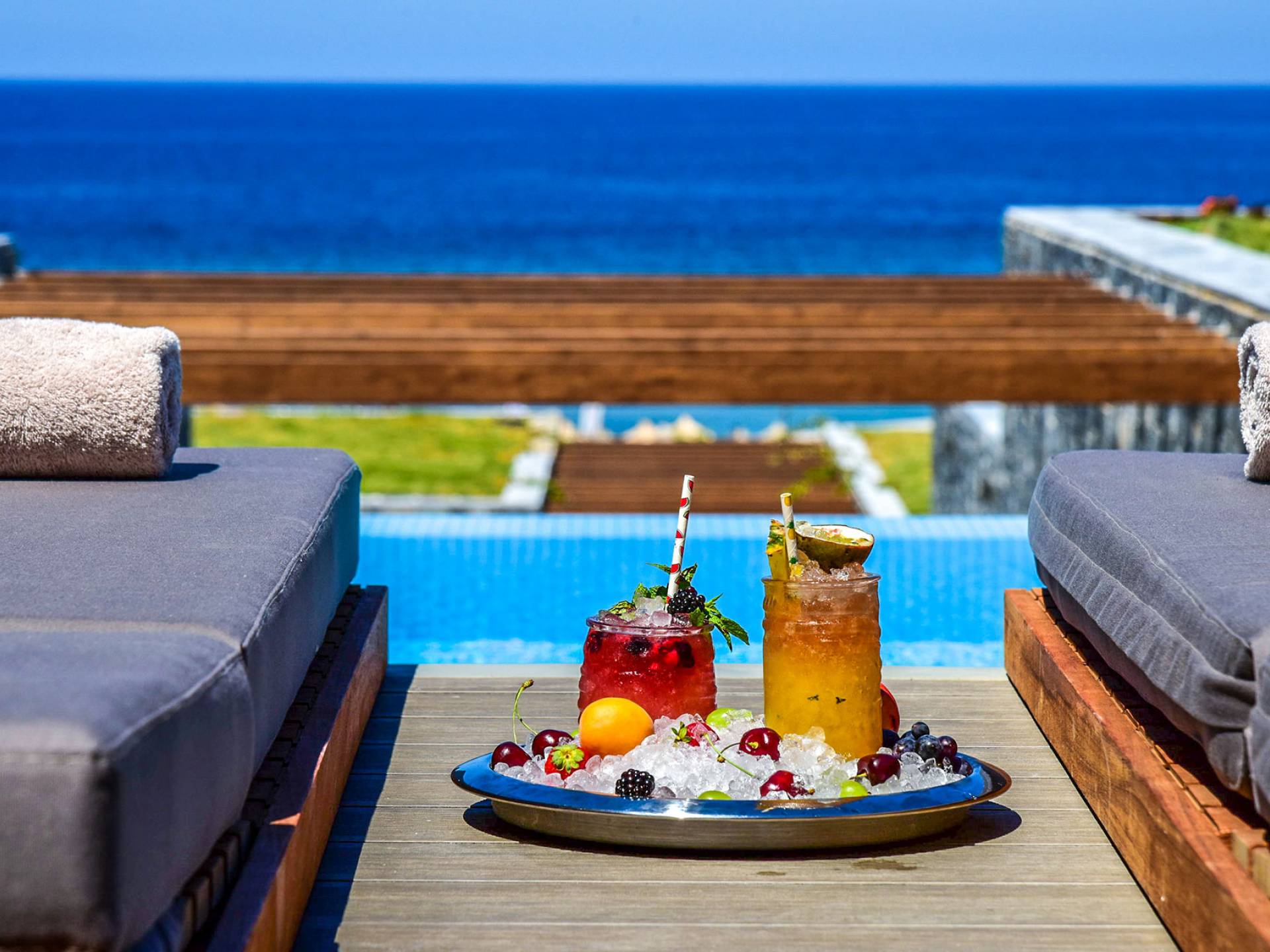 The idyllic scenery is created by the turquoise waters, pristine sandy beaches and rolling mountains in the background. The luxurious Resort blends perfectly into this natural setting, perched majestically on the coast with its private beach and two large outdoor pools. Guests can enjoy an unparalleled stay characterised by high-end service and luxurious amenities. The resort is located on a peninsula outside the coastal town of Chersonissos in the north of Crete, Greece's largest island. Overlooking the Cretan Sea, Chersonissos is approximately 25 km from Heraklion Airport and 27 km from Heraklion ferry port.