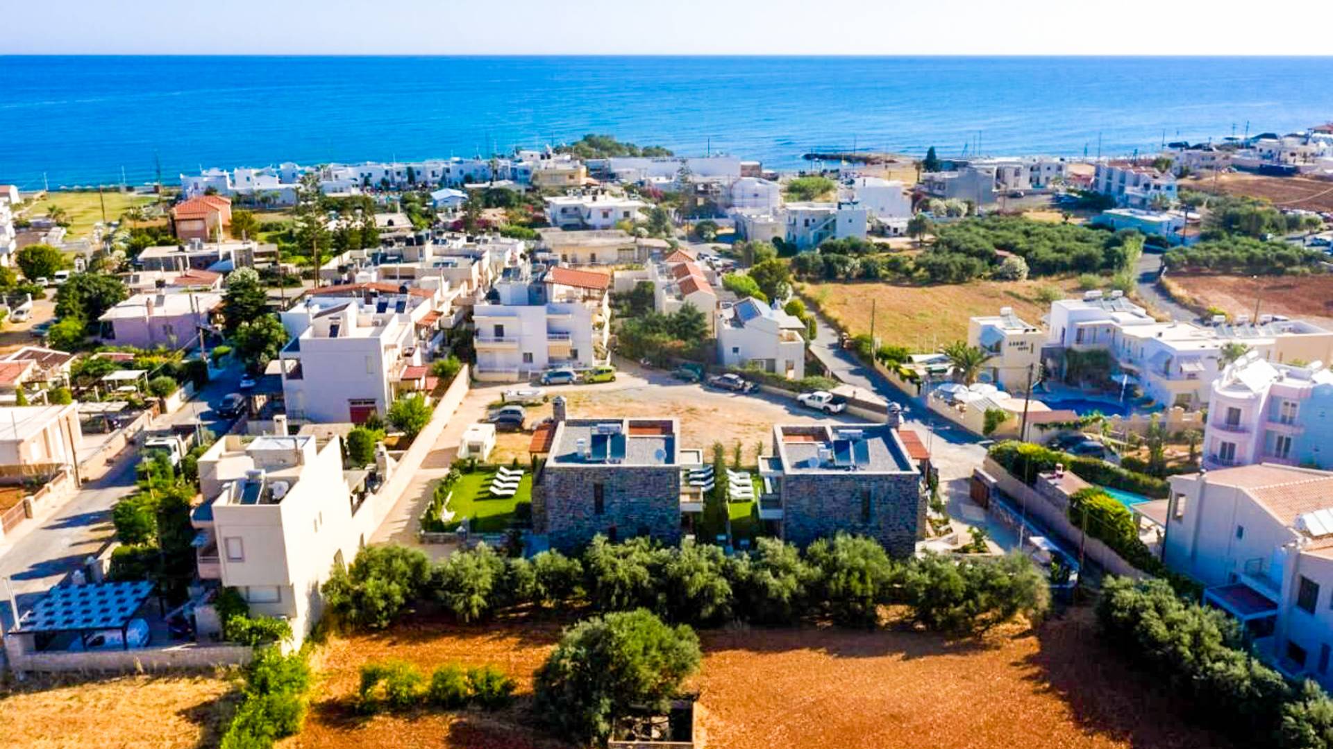 The villas are located in Kato Gouves, a charming seaside holiday village on the north coast of Crete, about 18 km east of Heraklion city and roughly 15 km from Heraklion International Airport - a perfect mix of relaxed local life and holiday-friendly amenities.