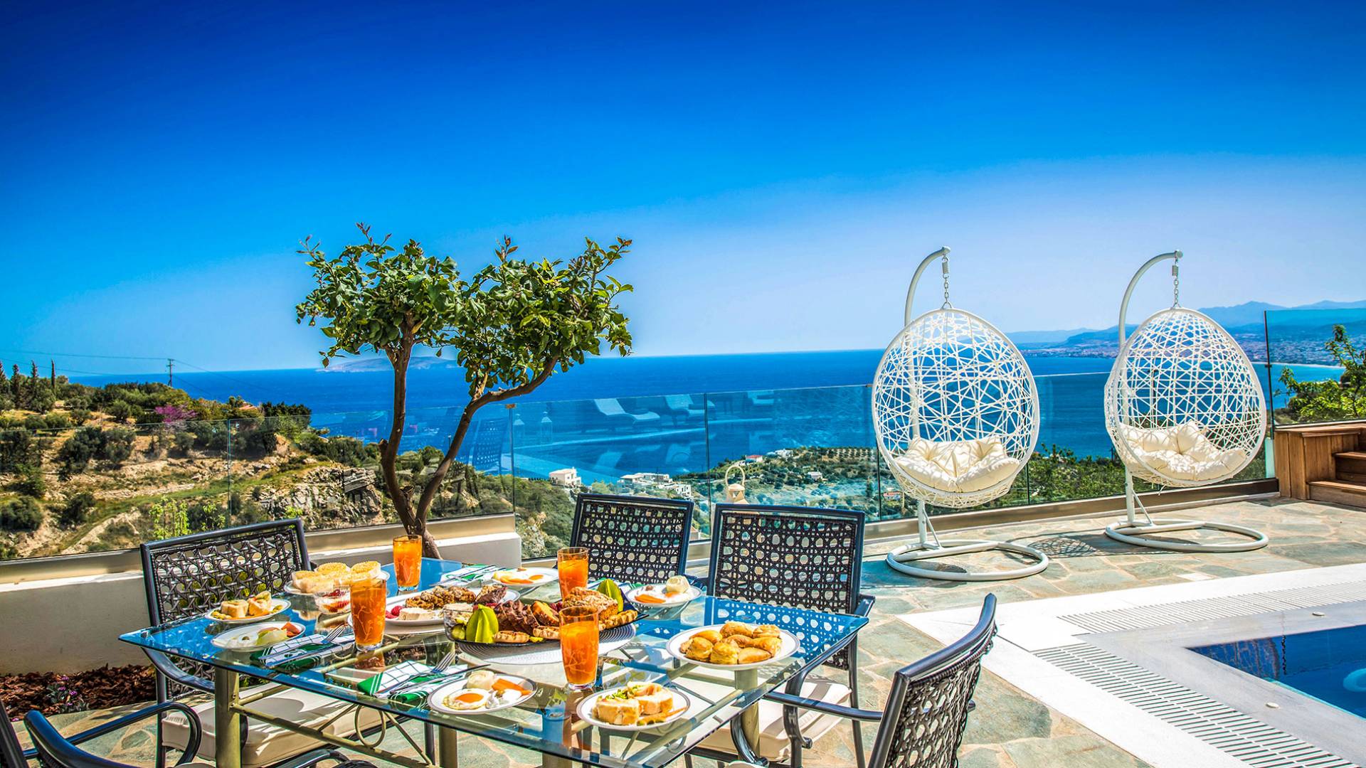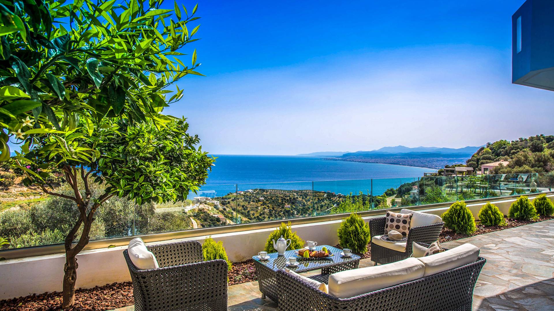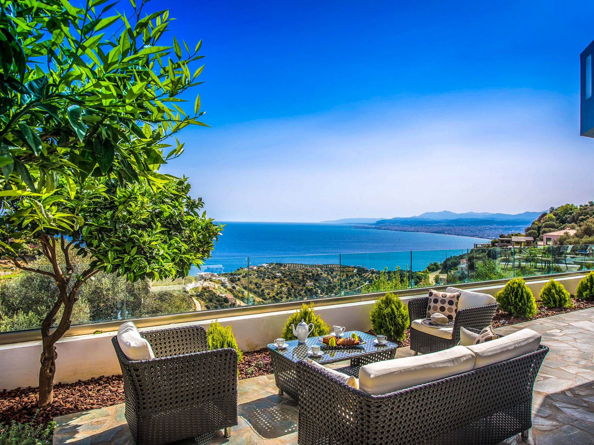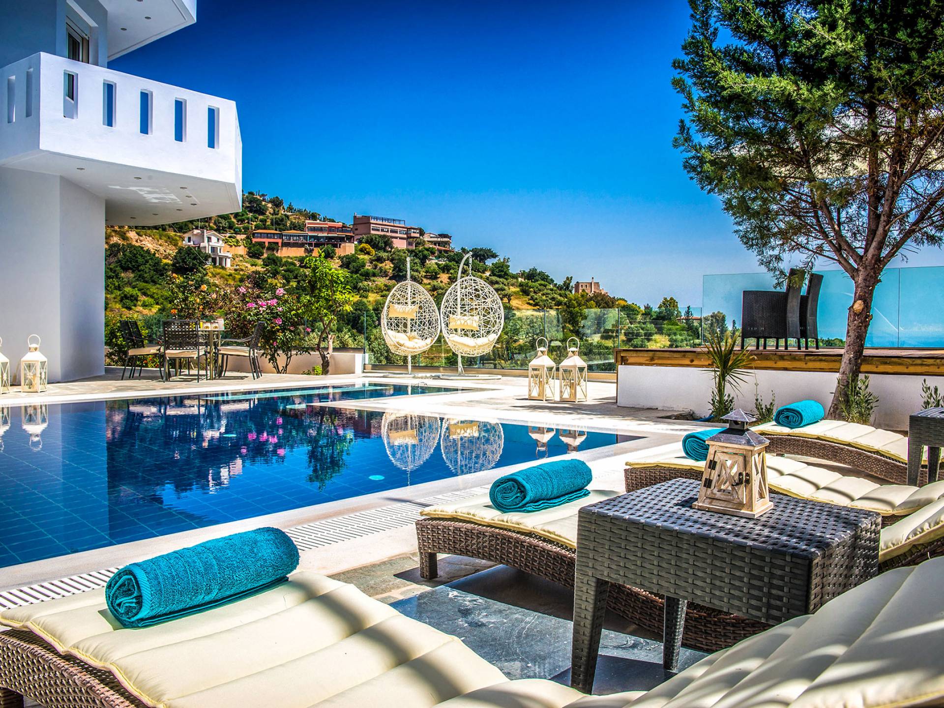 Welcome to your Mediterranean escape! Nestled at the base of the charming village of Rodia, this elegant villa overlooks the sparkling Aegean Sea and the gulf of Crete, surrounded by lush hills and serene countryside.