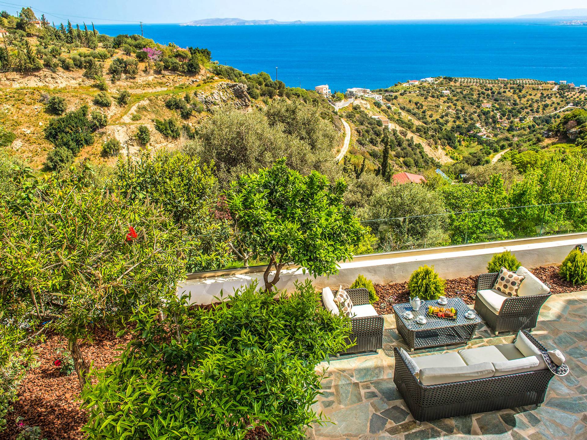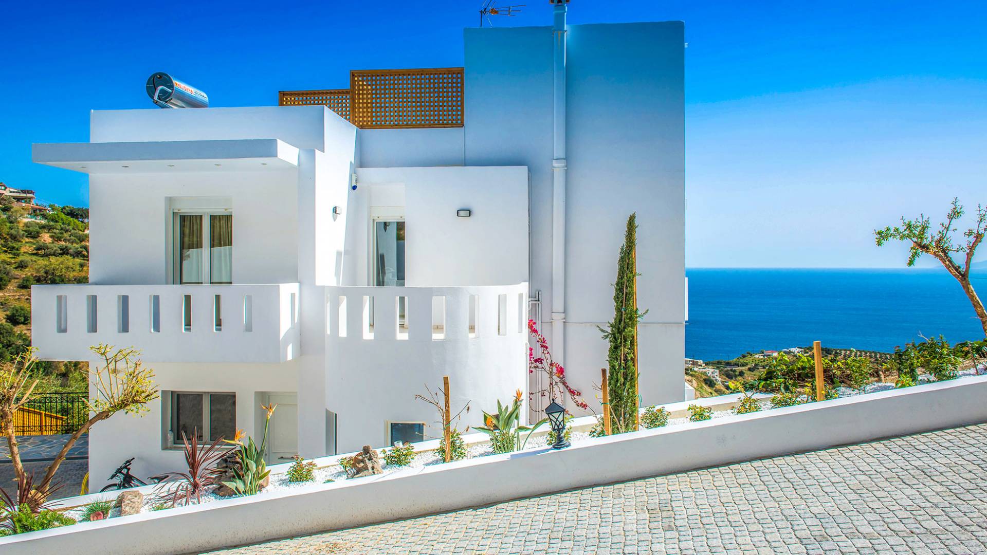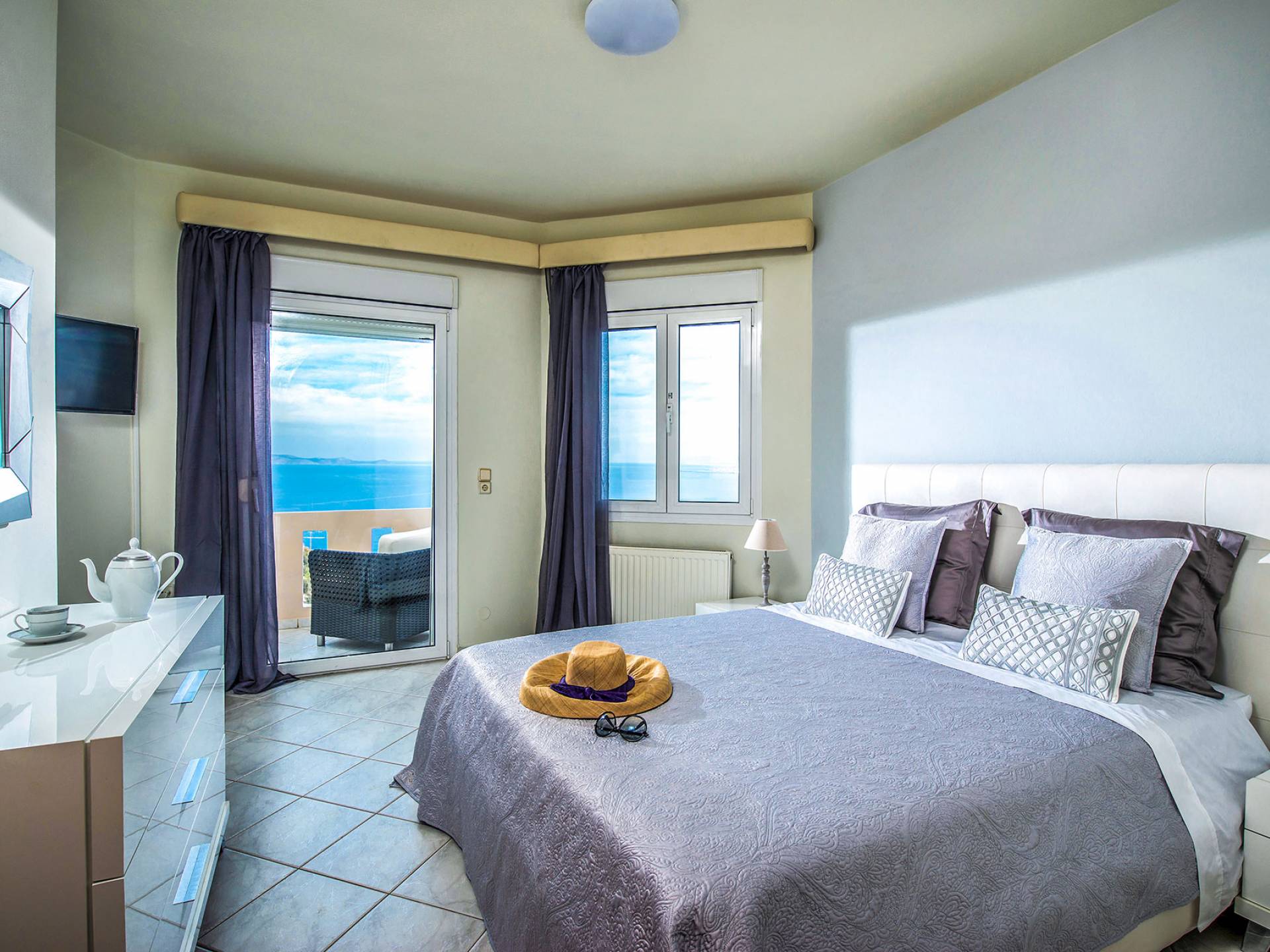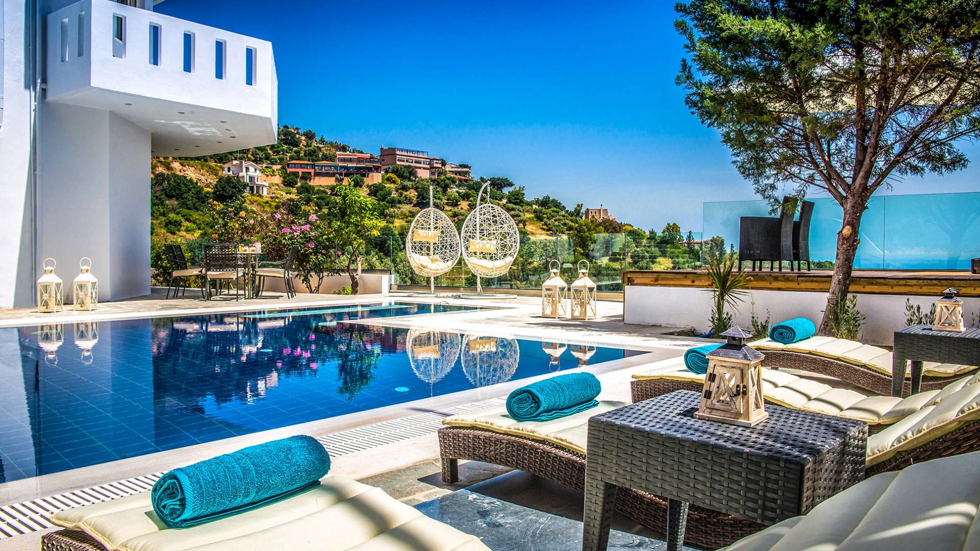 Welcome to your Mediterranean escape! Nestled at the base of the charming village of Rodia, this elegant villa overlooks the sparkling Aegean Sea and the gulf of Crete, surrounded by lush hills and serene countryside.