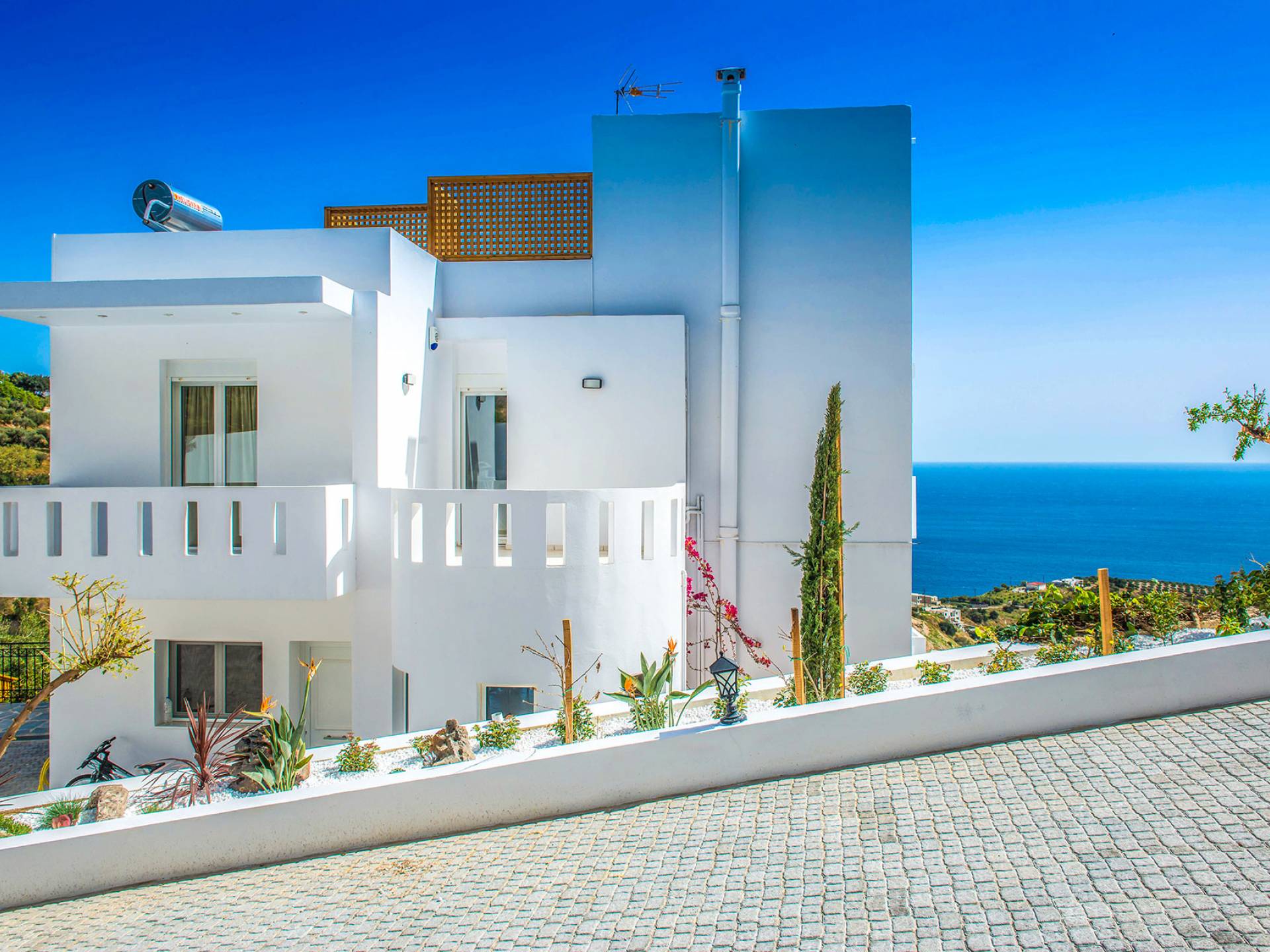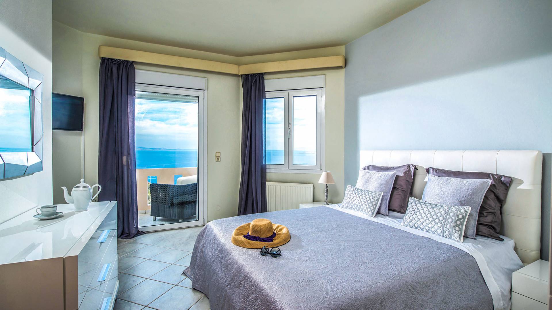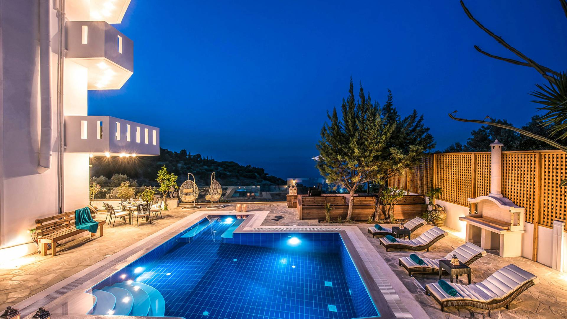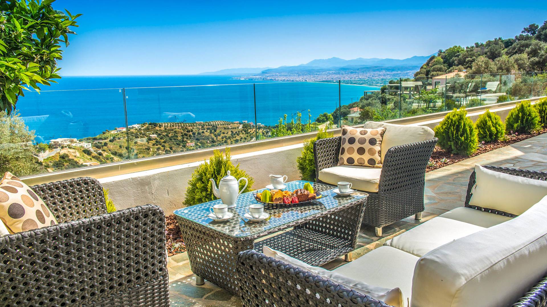 Welcome to your Mediterranean escape! Nestled at the base of the charming village of Rodia, this elegant villa overlooks the sparkling Aegean Sea and the gulf of Crete, surrounded by lush hills and serene countryside.