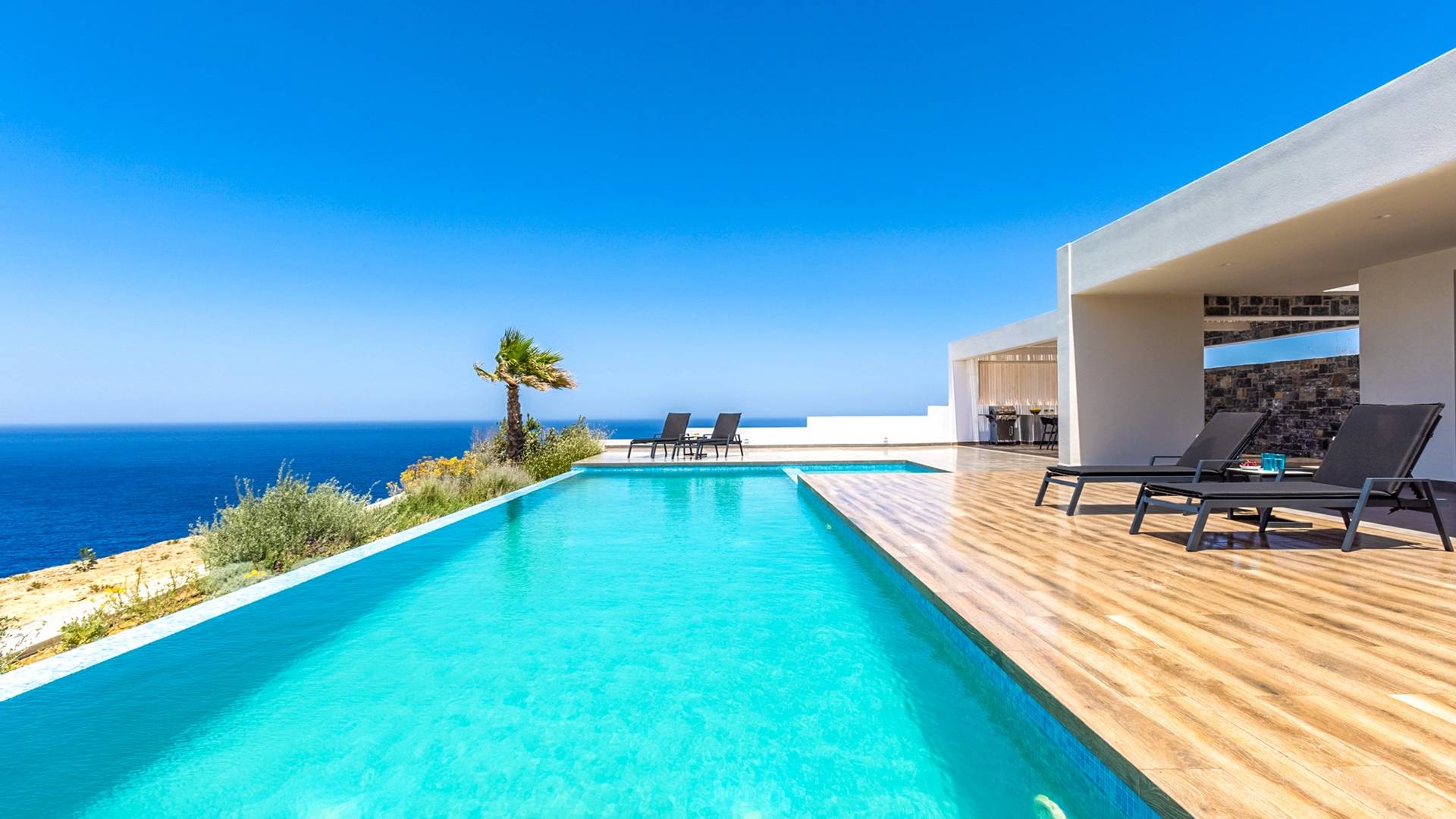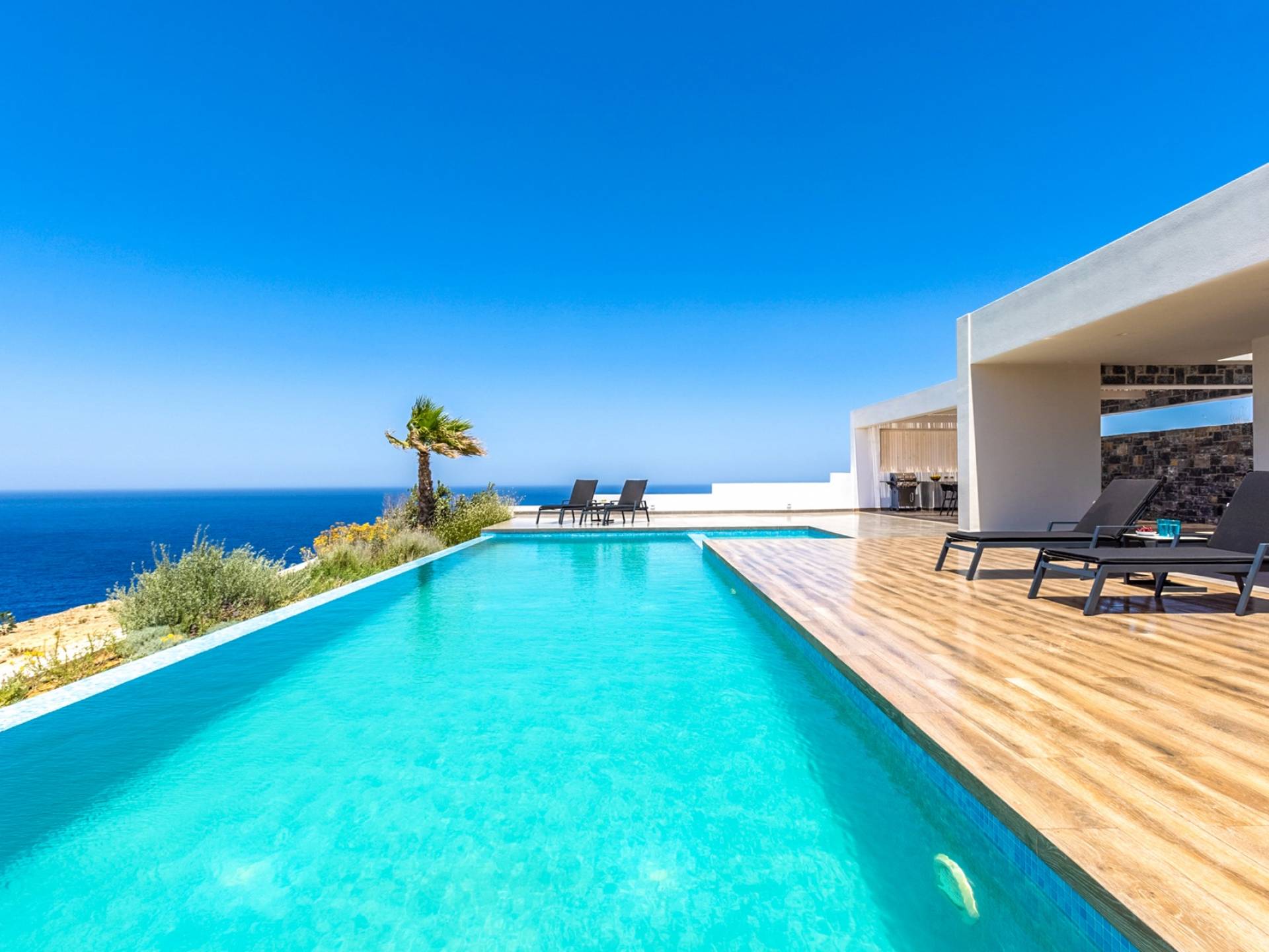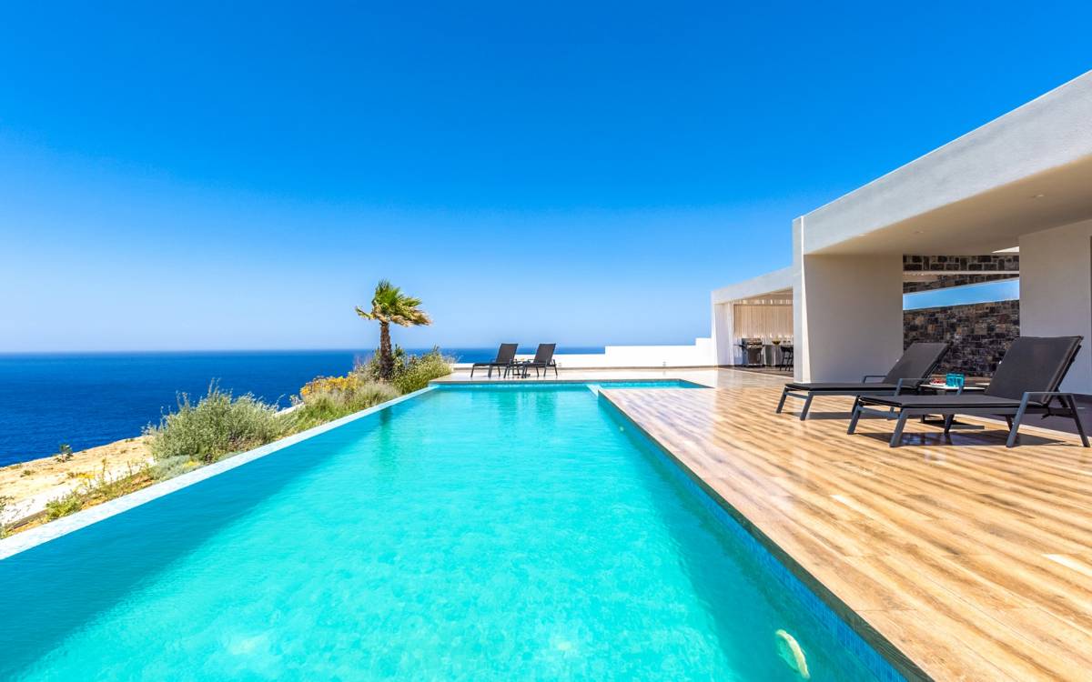 Villa Zephyros Crete is an elegant two-storey villa among Rock Bay Villas, surrounded by a Mediterranean garden with panoramic sea views and a private freshwater swimming pool.