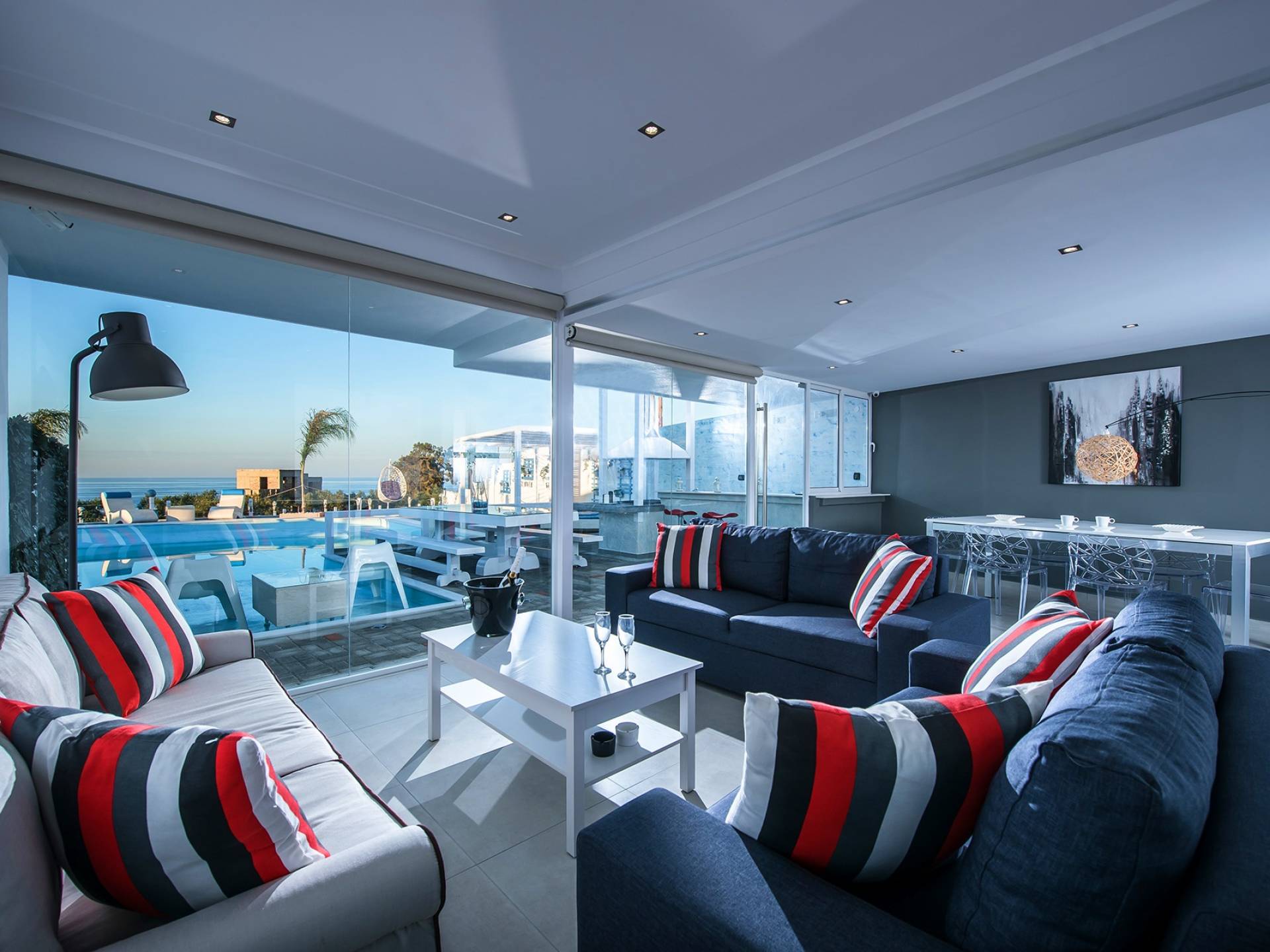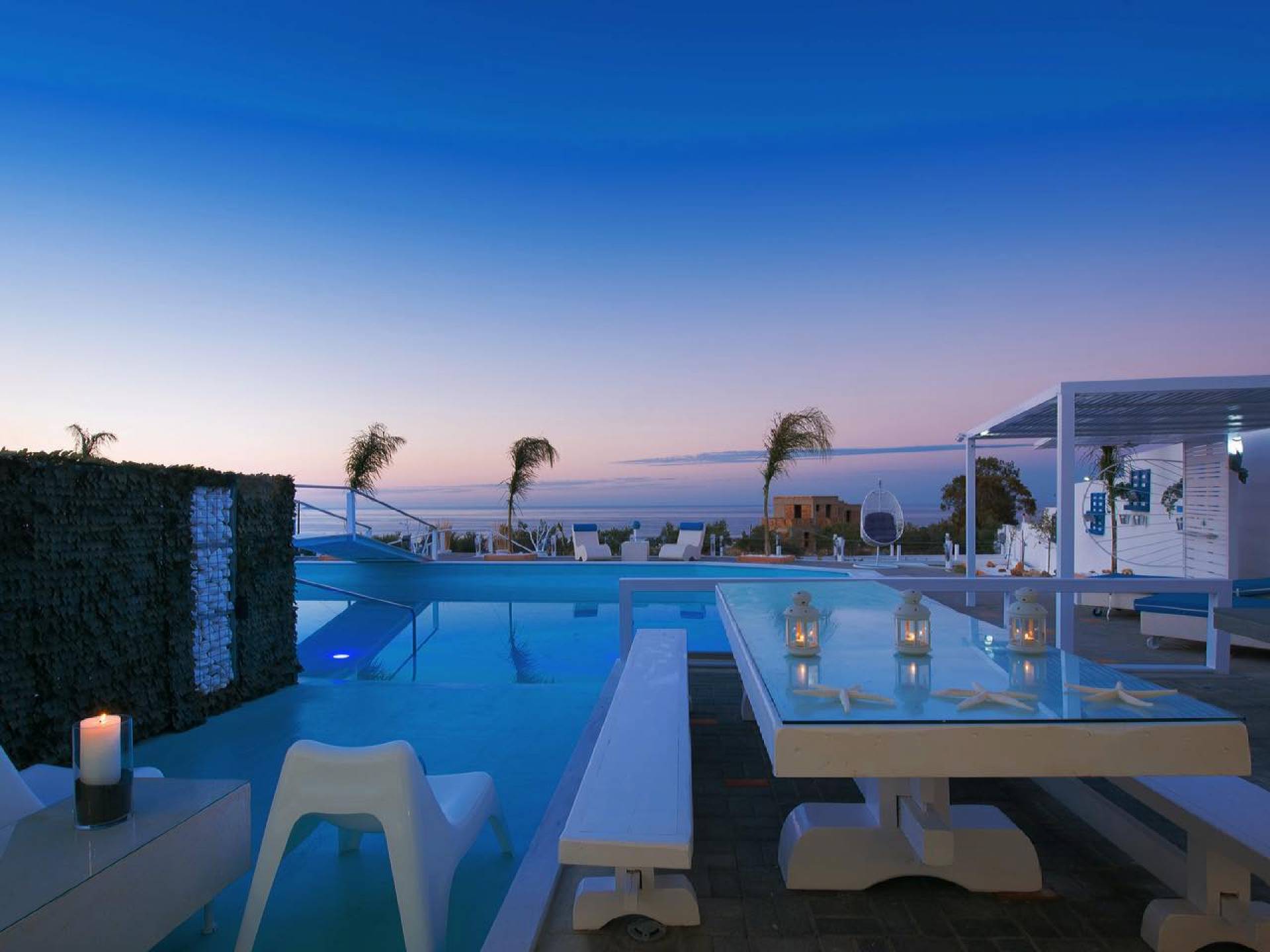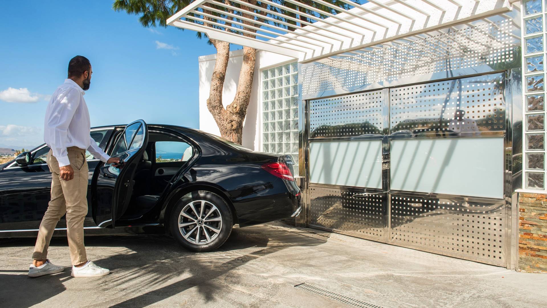 Guests can dine and organize ideal small parties and events in style with views over the blue sea. The villa is secured by a professional alarm system and comes with two spacious indoor and outdoor private parking areas. We offer your roundtrip VIP transfers from/to the airport/port free of charge so that you can start your journey in Crete in the most luxurious and comfortable way. What is more, along with your accommodation, we can provide two of our best staff in order to add the extra service and care you need. Absolute relaxation in luxurious and full comfort vacations is our promise.
