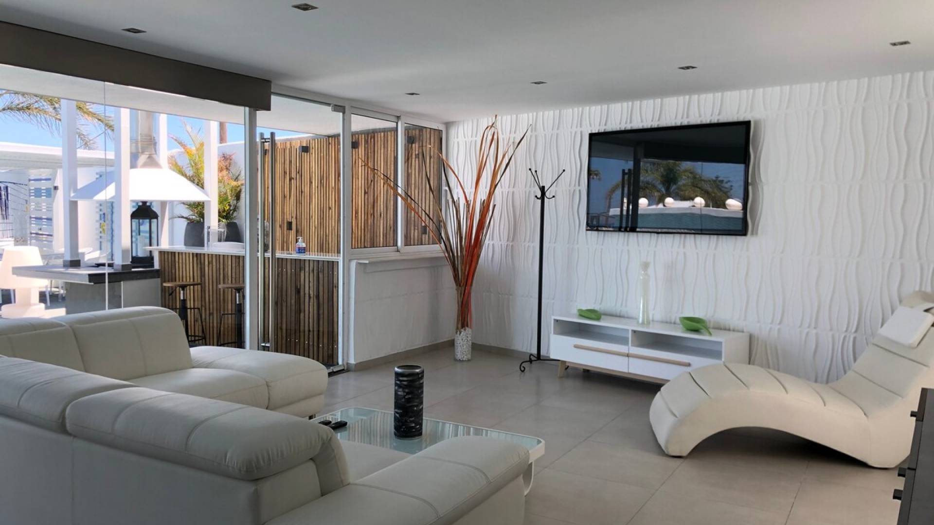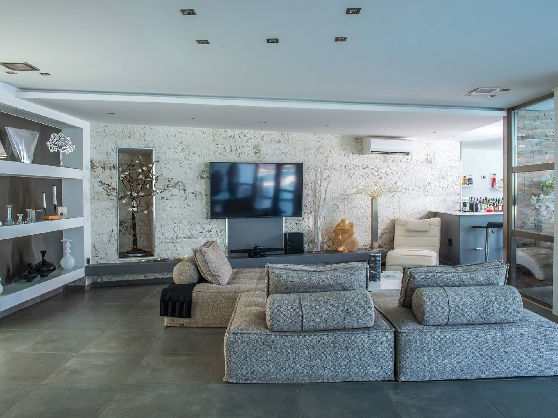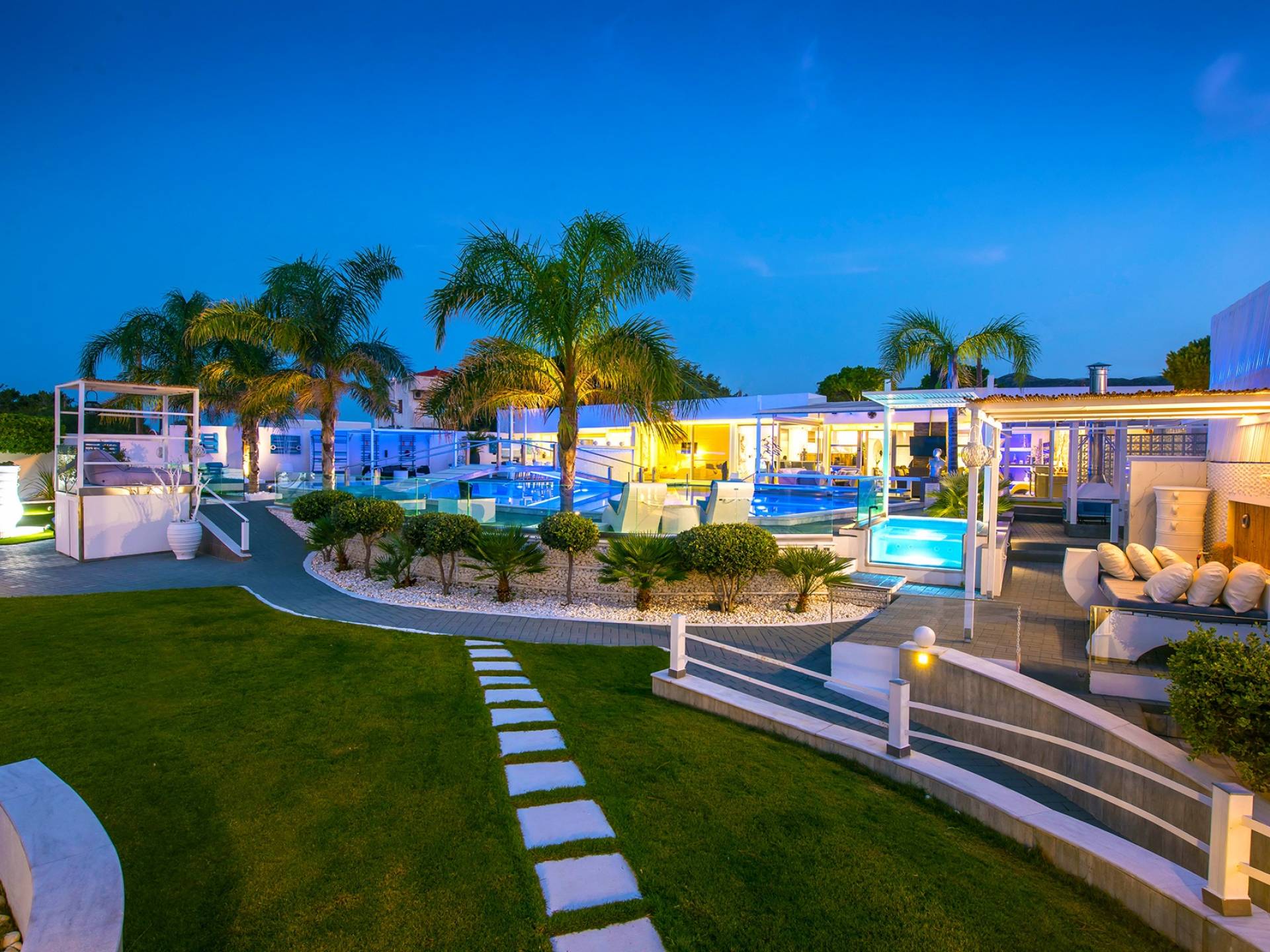 Equipped with the finest white furniture, this villa offers the ultimate comfort and style as well as all the necessary conditions for a relaxing, revitalizing, and luxury accommodation. The spectacular sea view meets the endless blue of the sky, providing the perfect combination for memorable days and nights. The outdoor area is dominated by a large lake pool of 330 sq.m plenty of comfortable sun loungers and a hydro hot massage aside to endlessly indulge yourself. Outside you can also enjoy the fully equipped BBQ area and have your dinner or relax at one of the five beautiful sitting and dining areas spotted around the spacious garden. In the outdoor area, you will also find an autonomous laundry house and a fully equipped indoor private bbq house of 85 sq.m. with a wooden oven, skewer, and gas BBQ. The same area is also used as a playroom. To your surprise, you will find also an autonomous wine cellar with 7.500 unique bottles of wine.