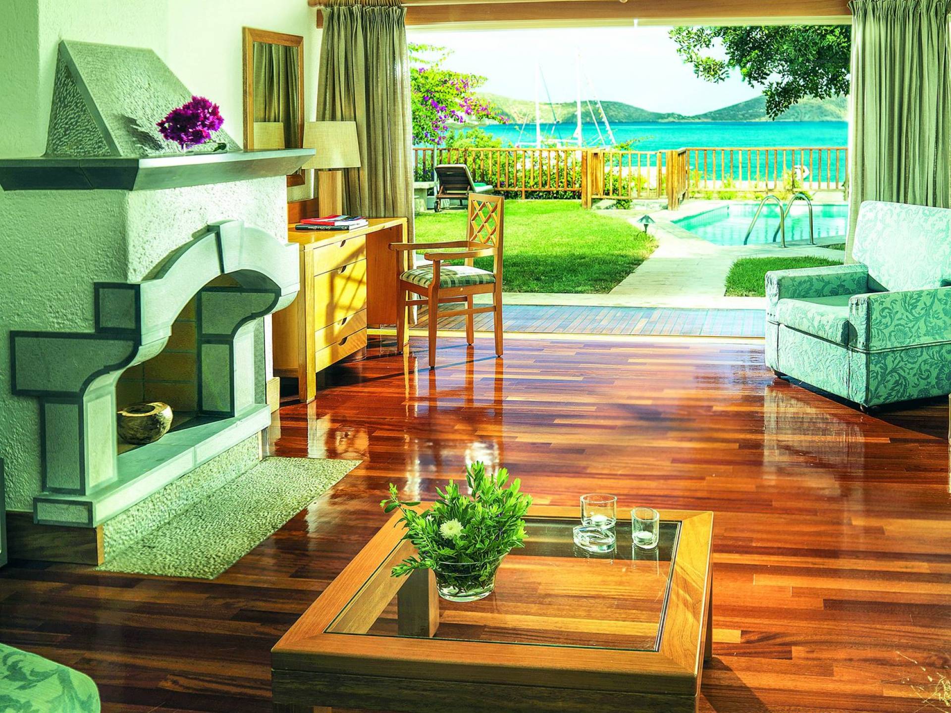 2BR Grand Villa at Elounda Peninsula Hotel consists of 120 m² of living space (5 guests) and approximately 140 m² private gardens. A large living room and indoor and outdoor dining area, luxurious bathrooms both feature Airbath tubs, one with a steam shower enclosure and an additional shower/W.C. in the living room and a large private furnished garden and seawater pool with direct access to the beach area of the resort ideal for families