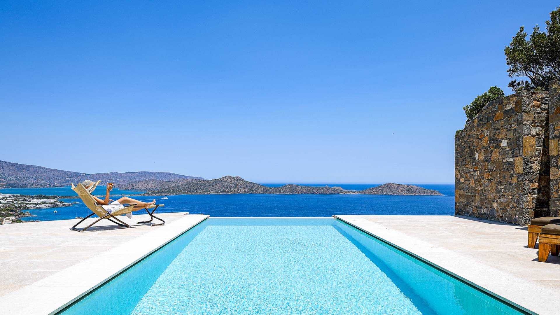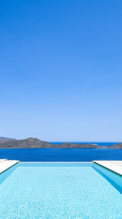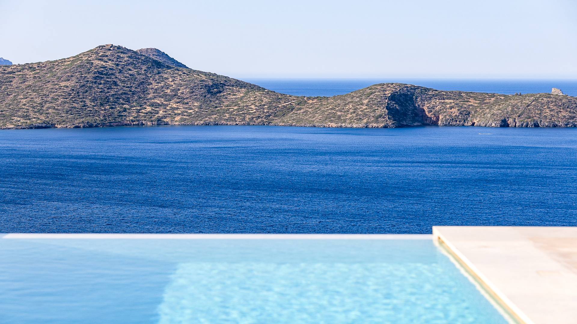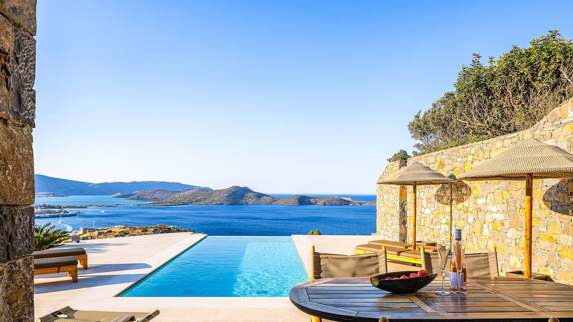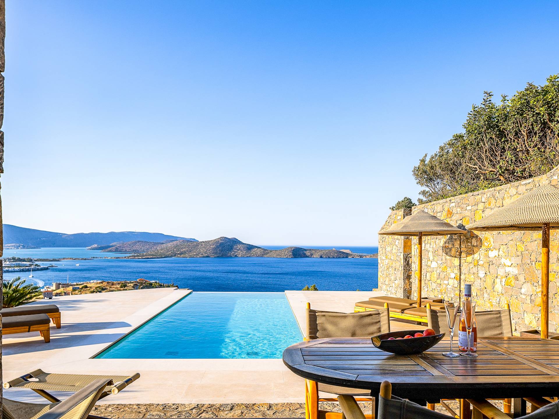 Mornings at the villa begin with laughter and splashes in the infinity pool, followed by a hearty breakfast together on the terrace with views over Elounda Bay.