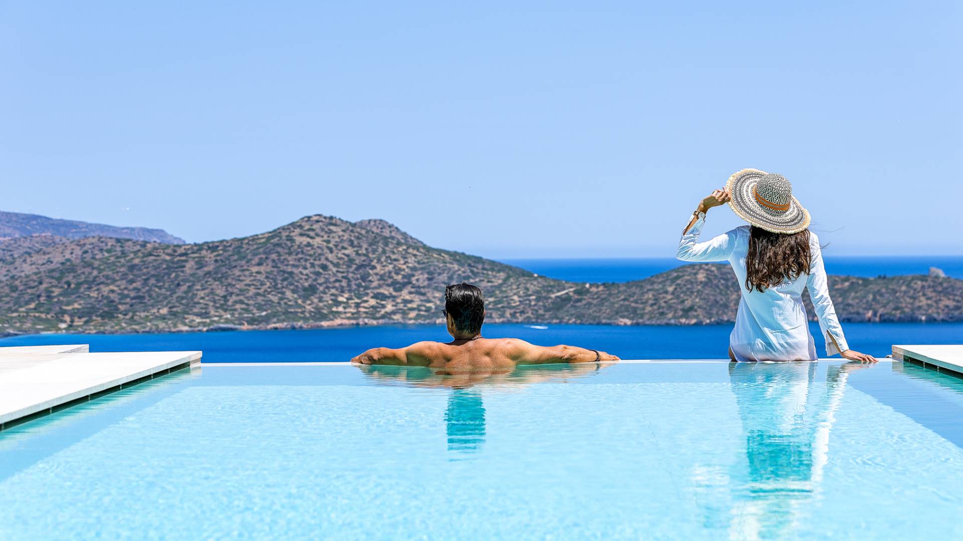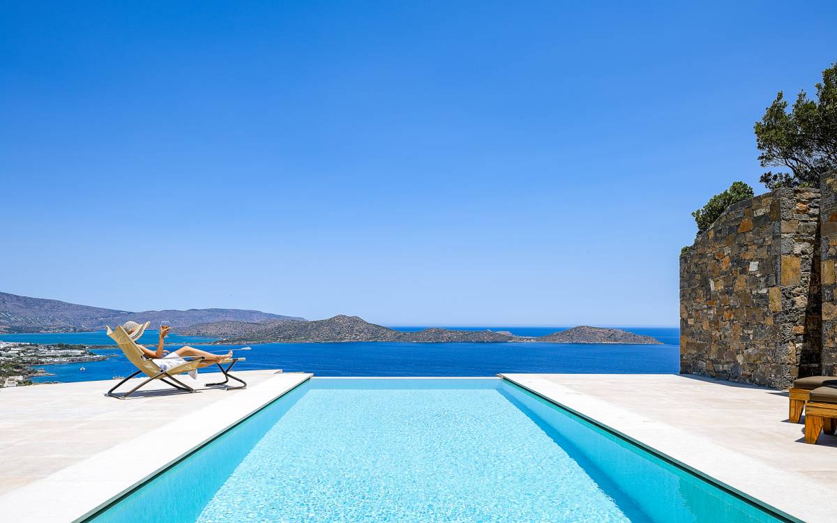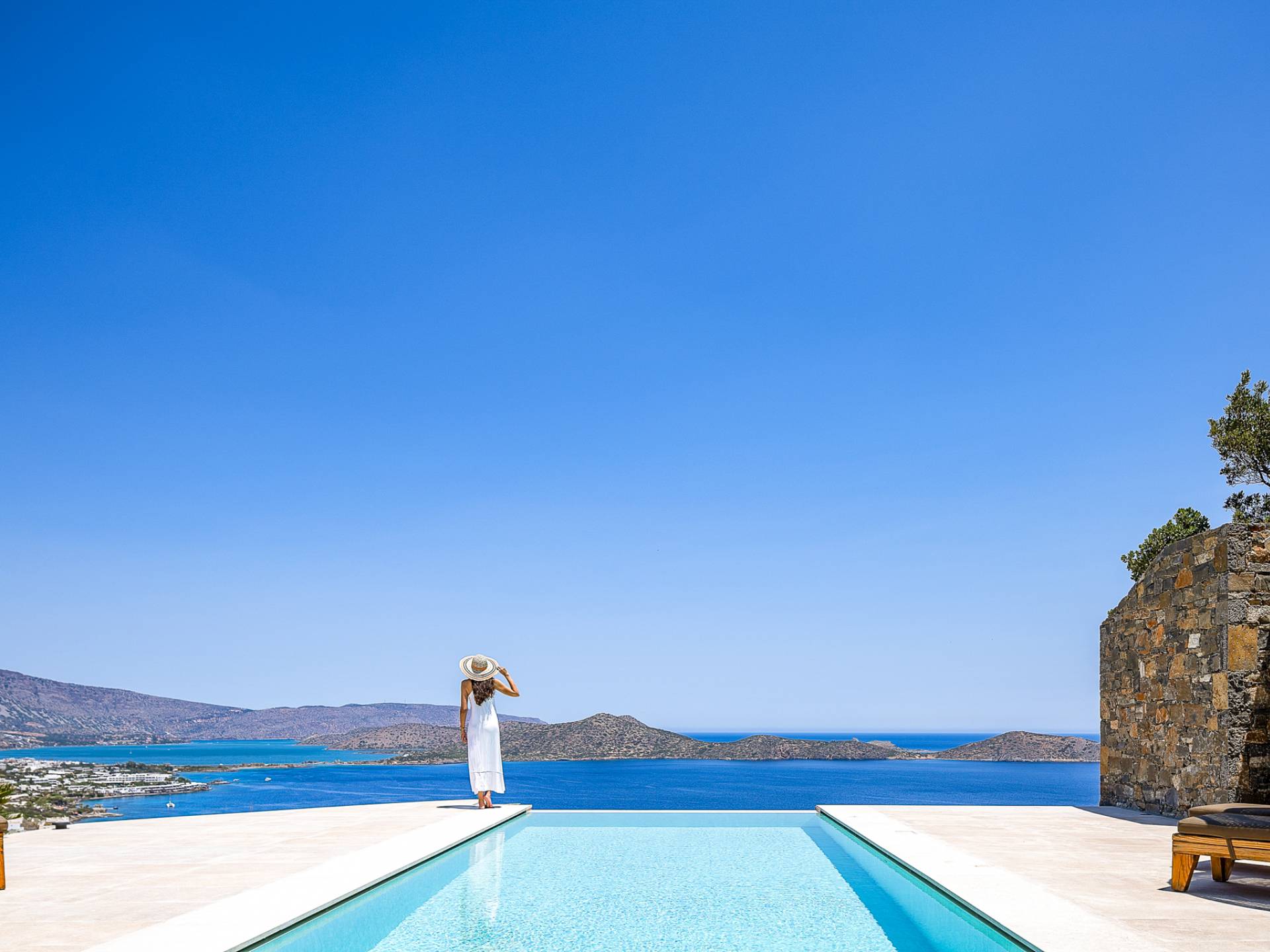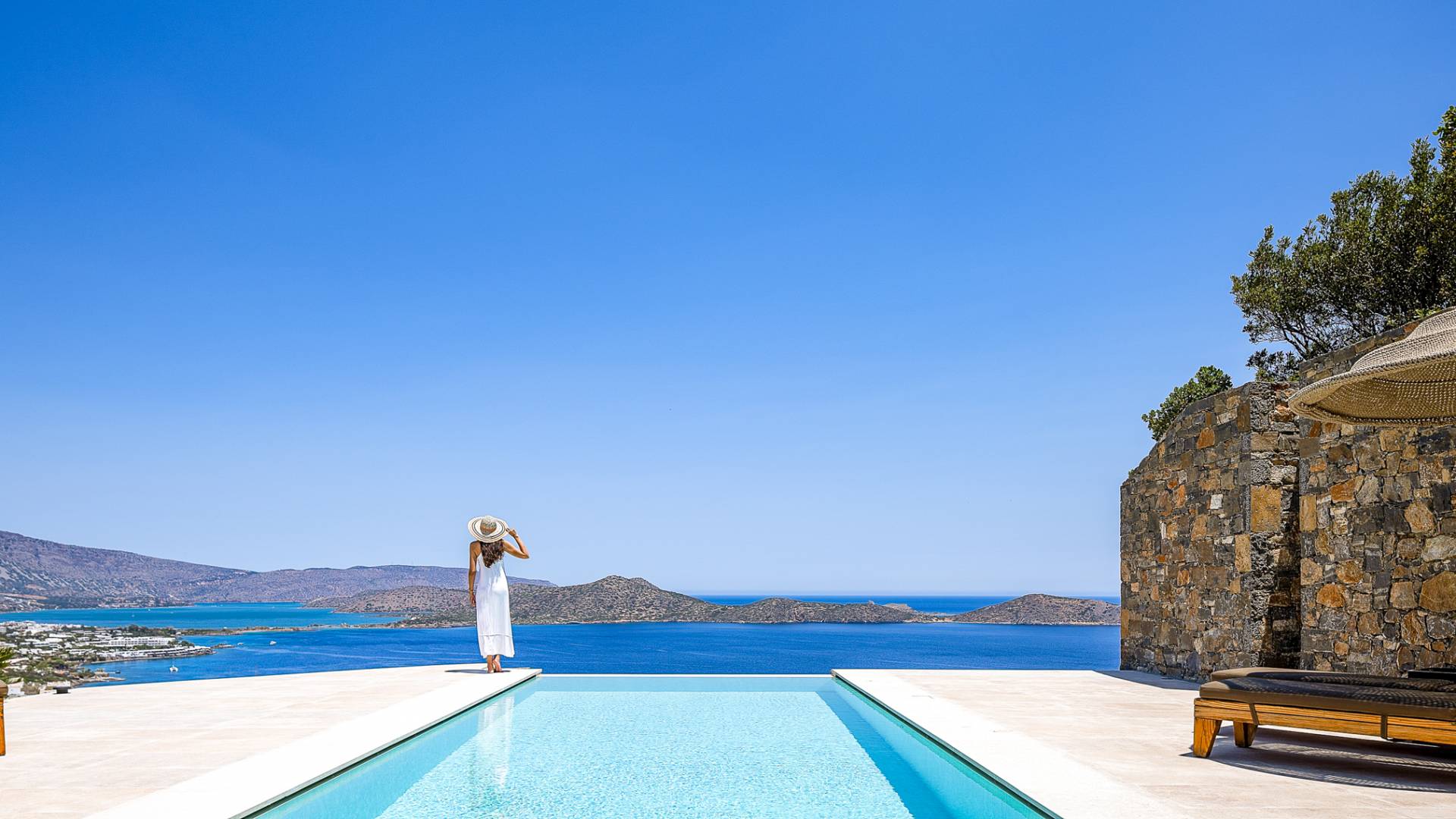 Mornings at the villa begin with laughter and splashes in the infinity pool, followed by a hearty breakfast together on the terrace with views over Elounda Bay.