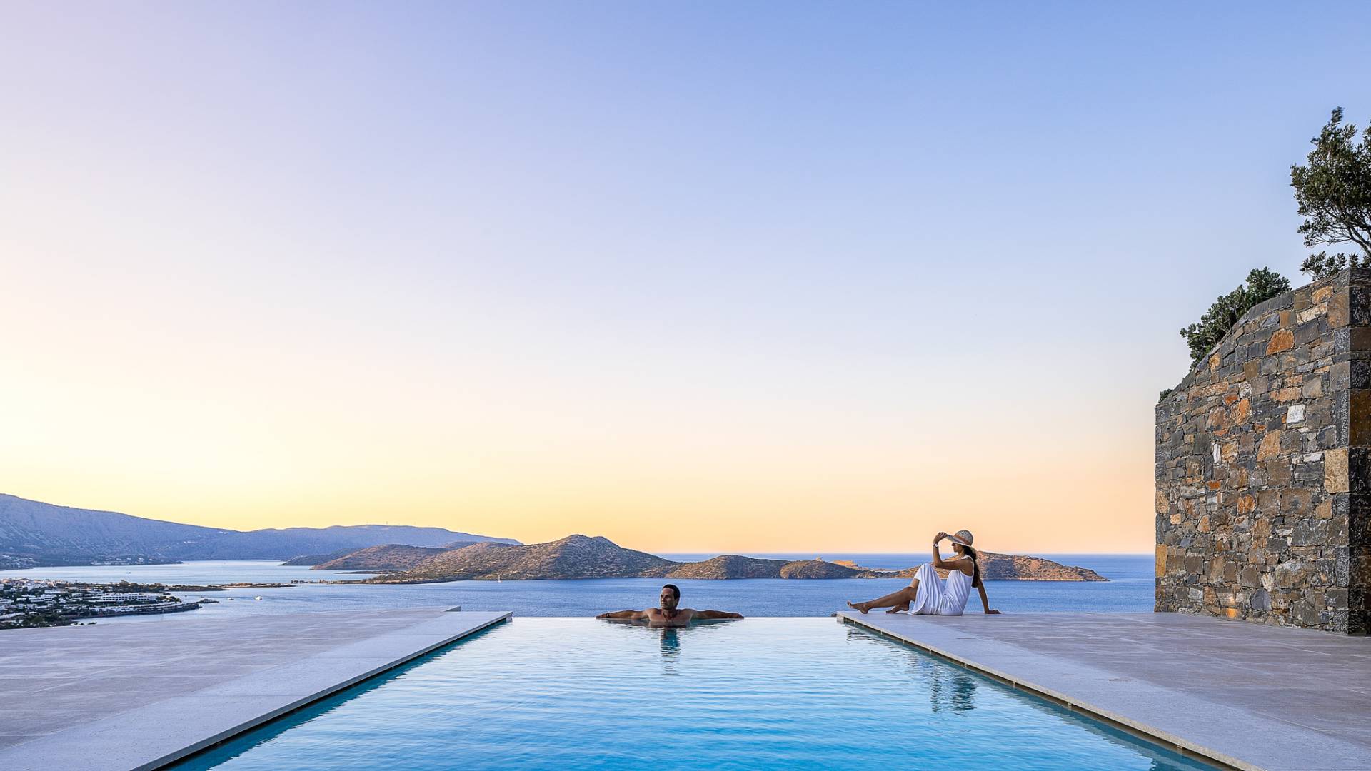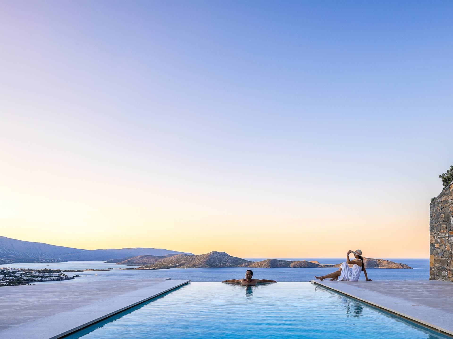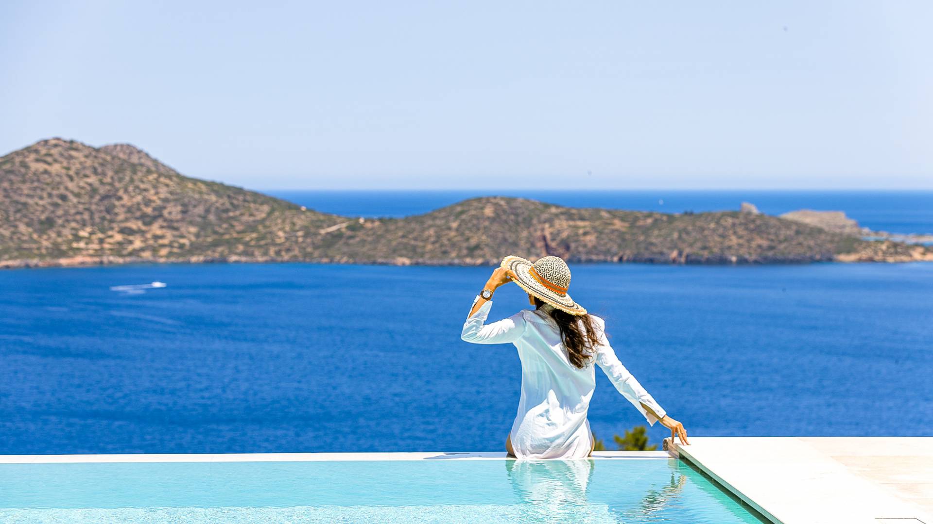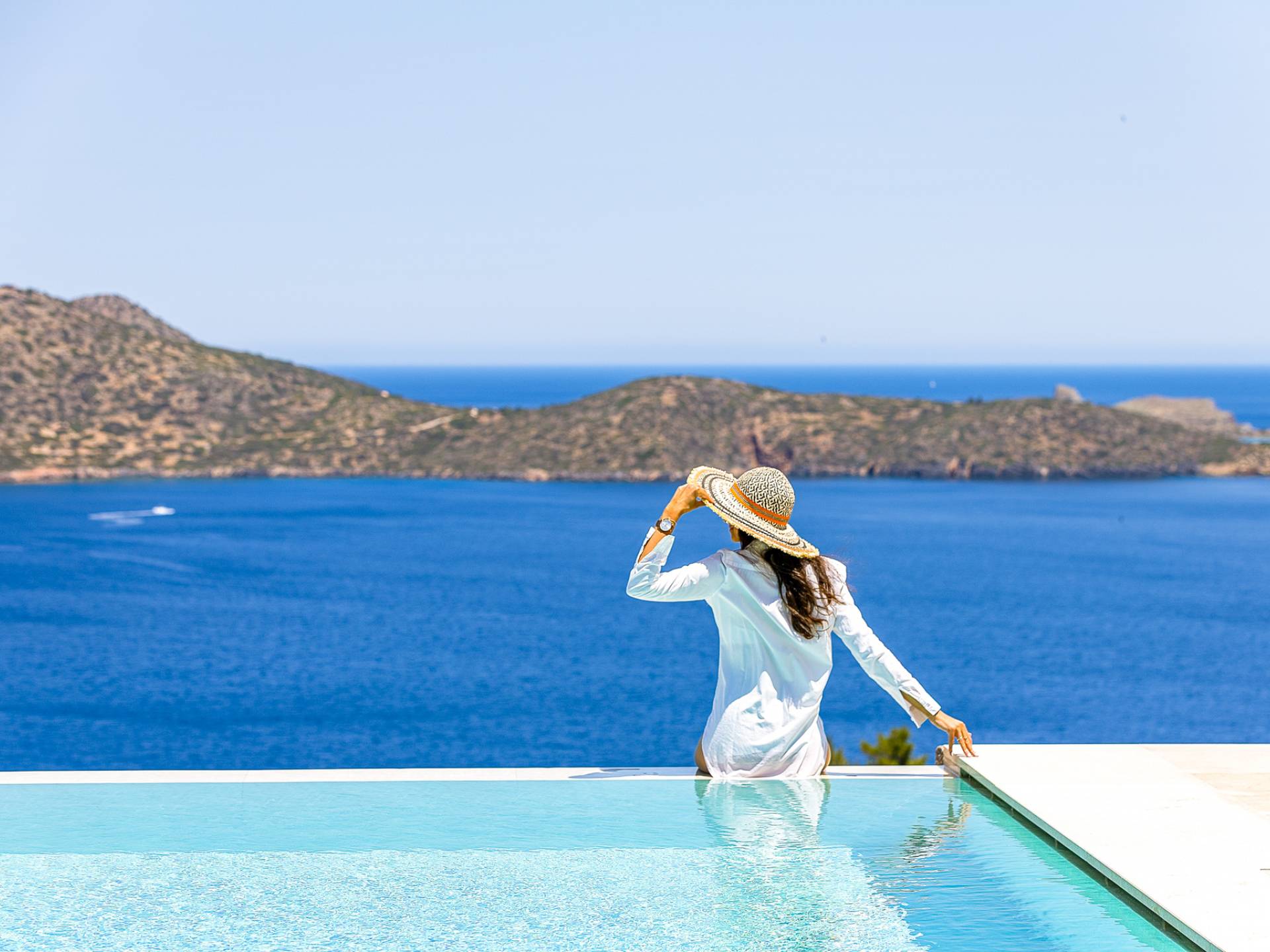 Mornings at the villa begin with laughter and splashes in the infinity pool, followed by a hearty breakfast together on the terrace with views over Elounda Bay.