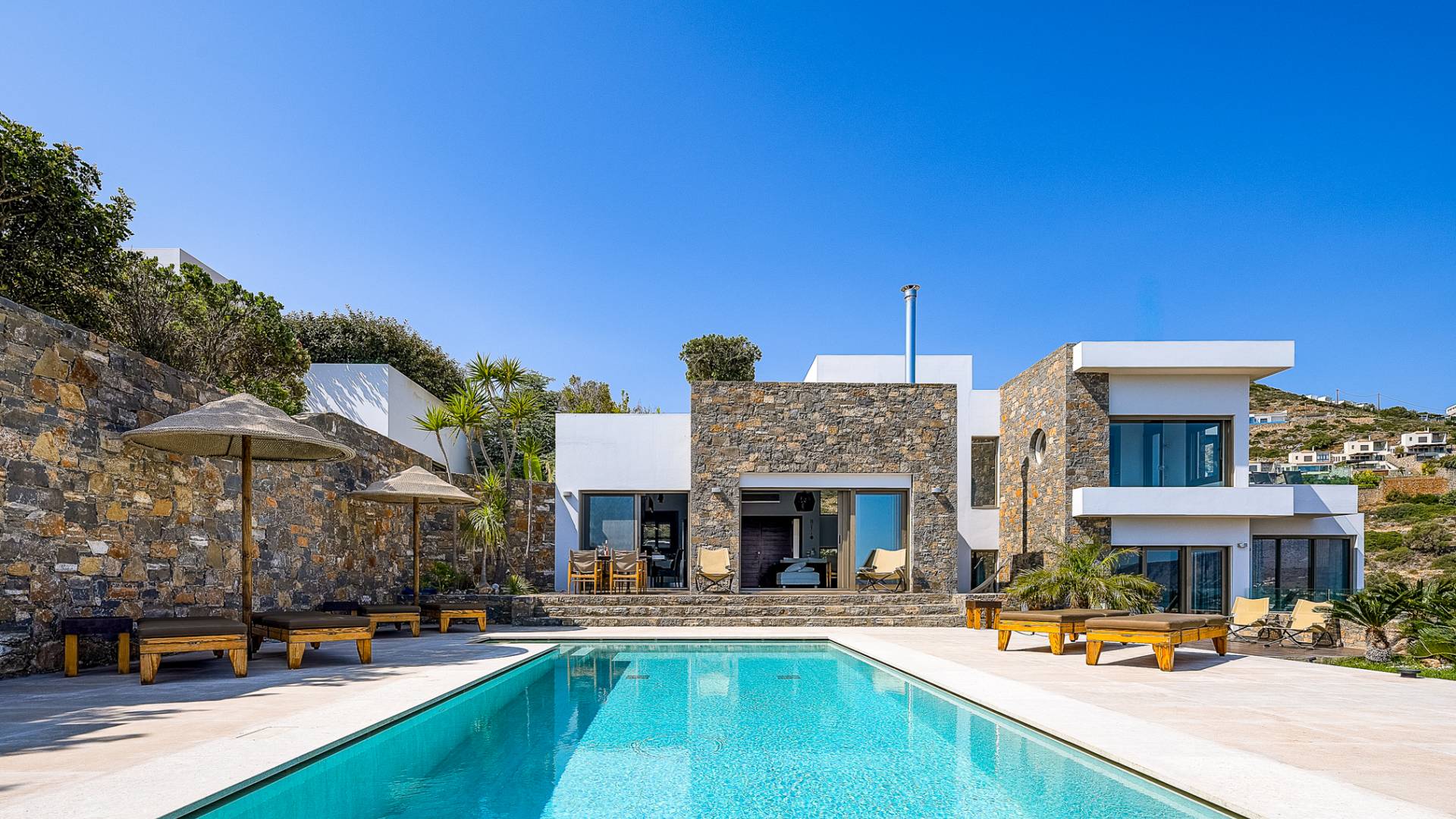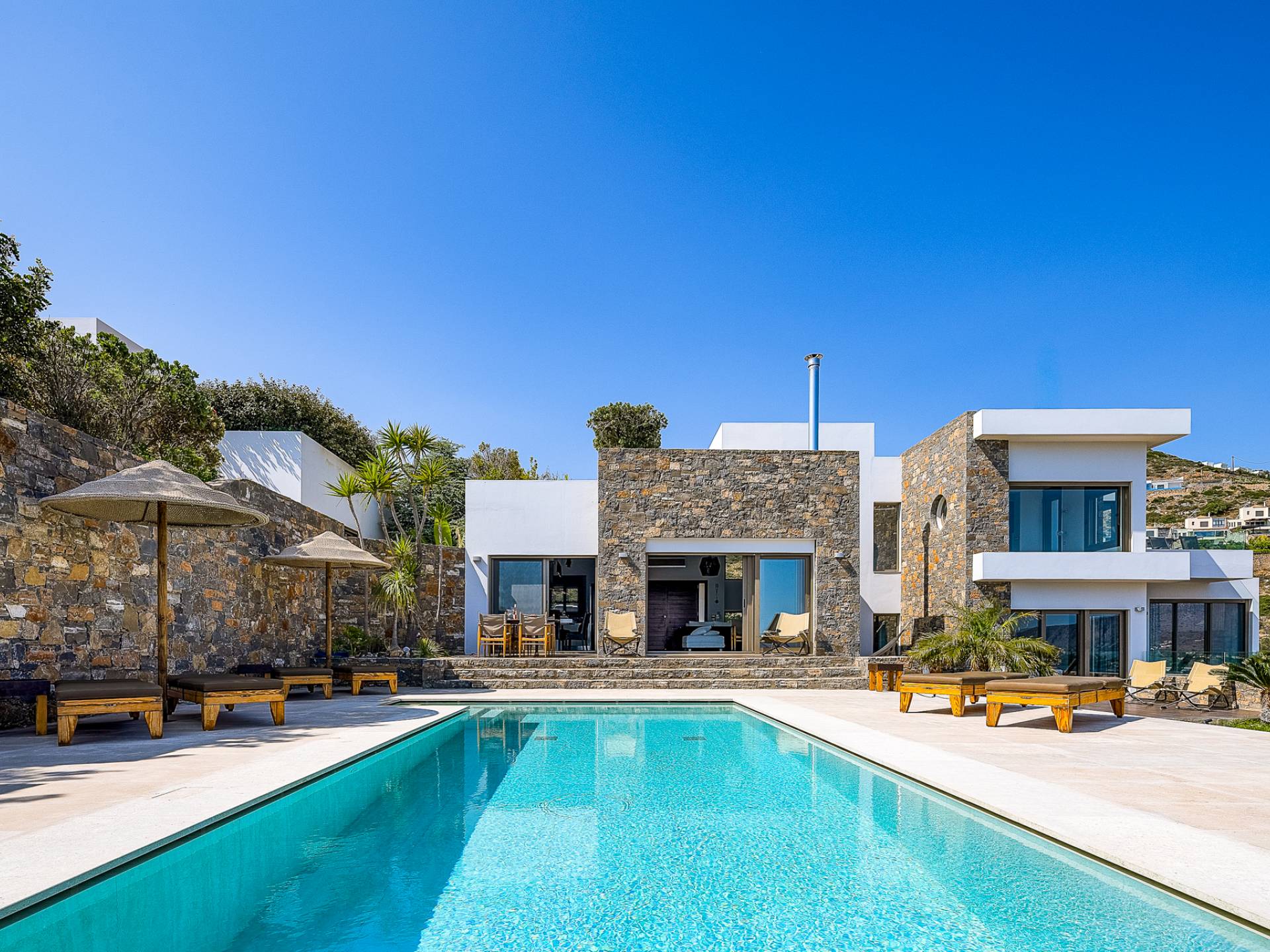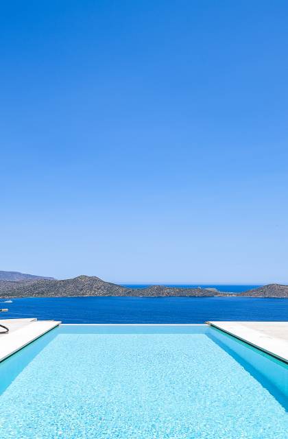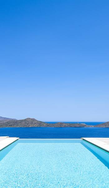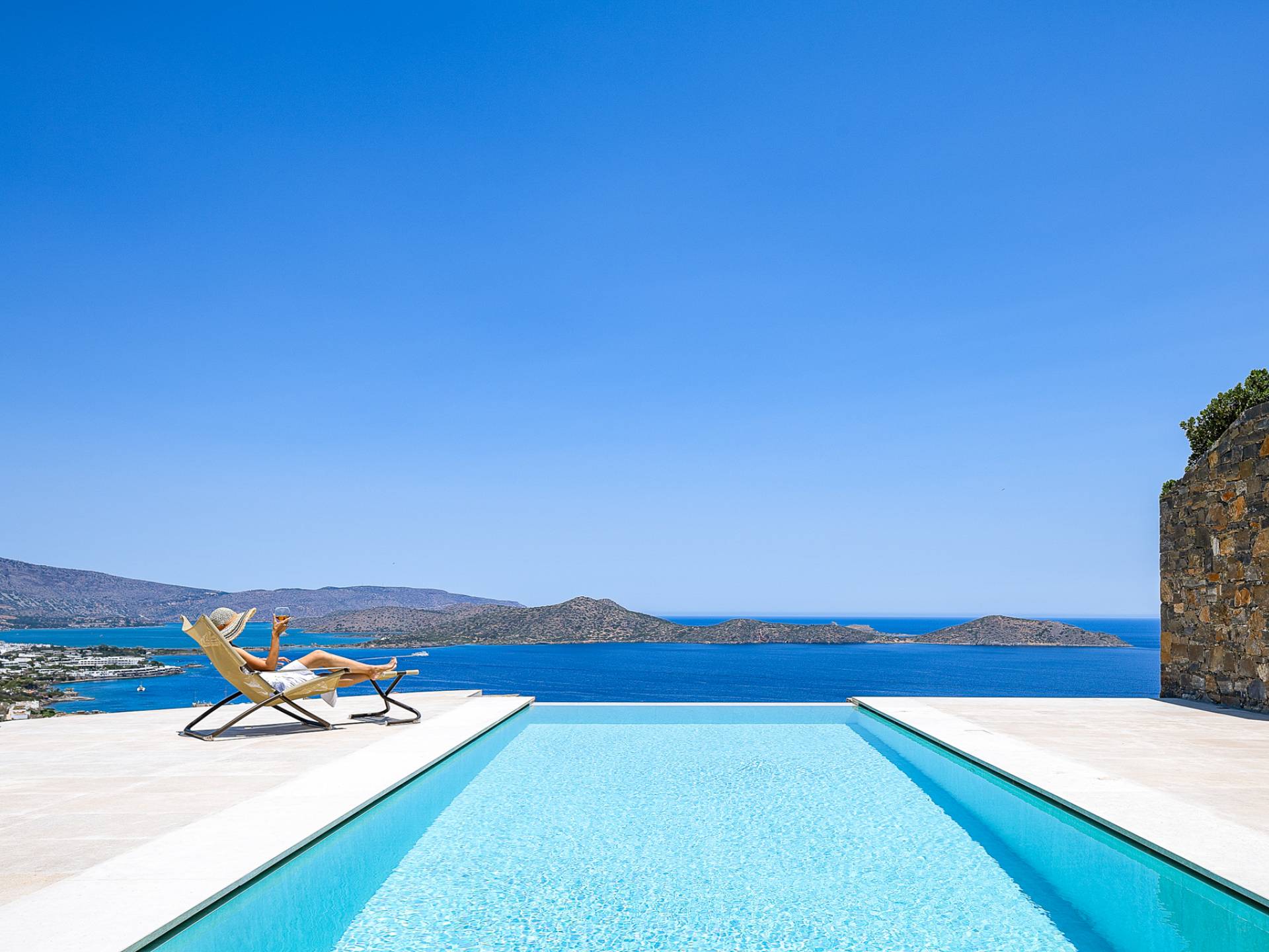Elounda Ammos Villa Crete - 220m² luxury villa rental with 3 bedrooms, heated infinity pool, gym & cinema. Sleeps 6, just 5 mins to Elounda Beach with sea views.