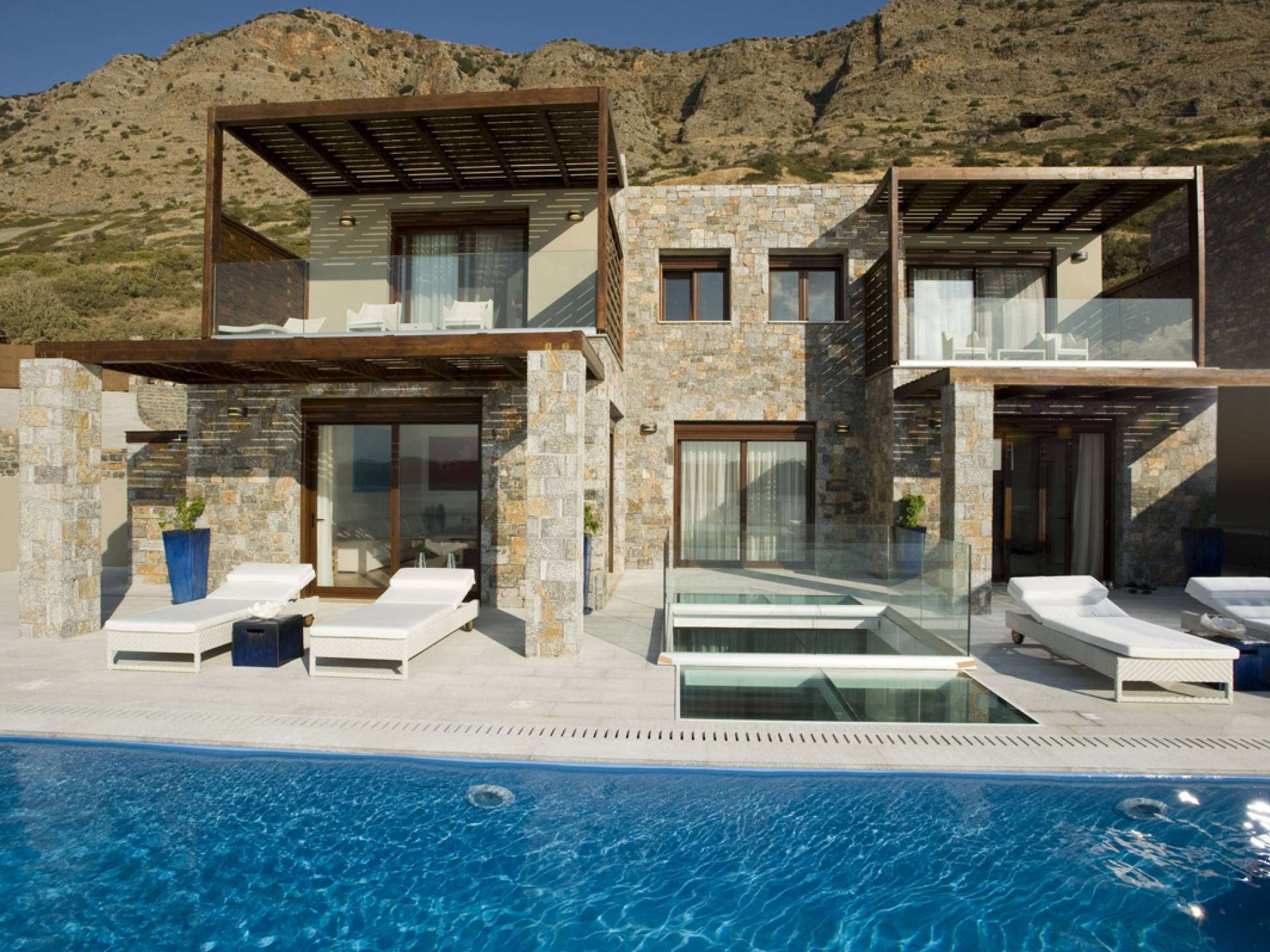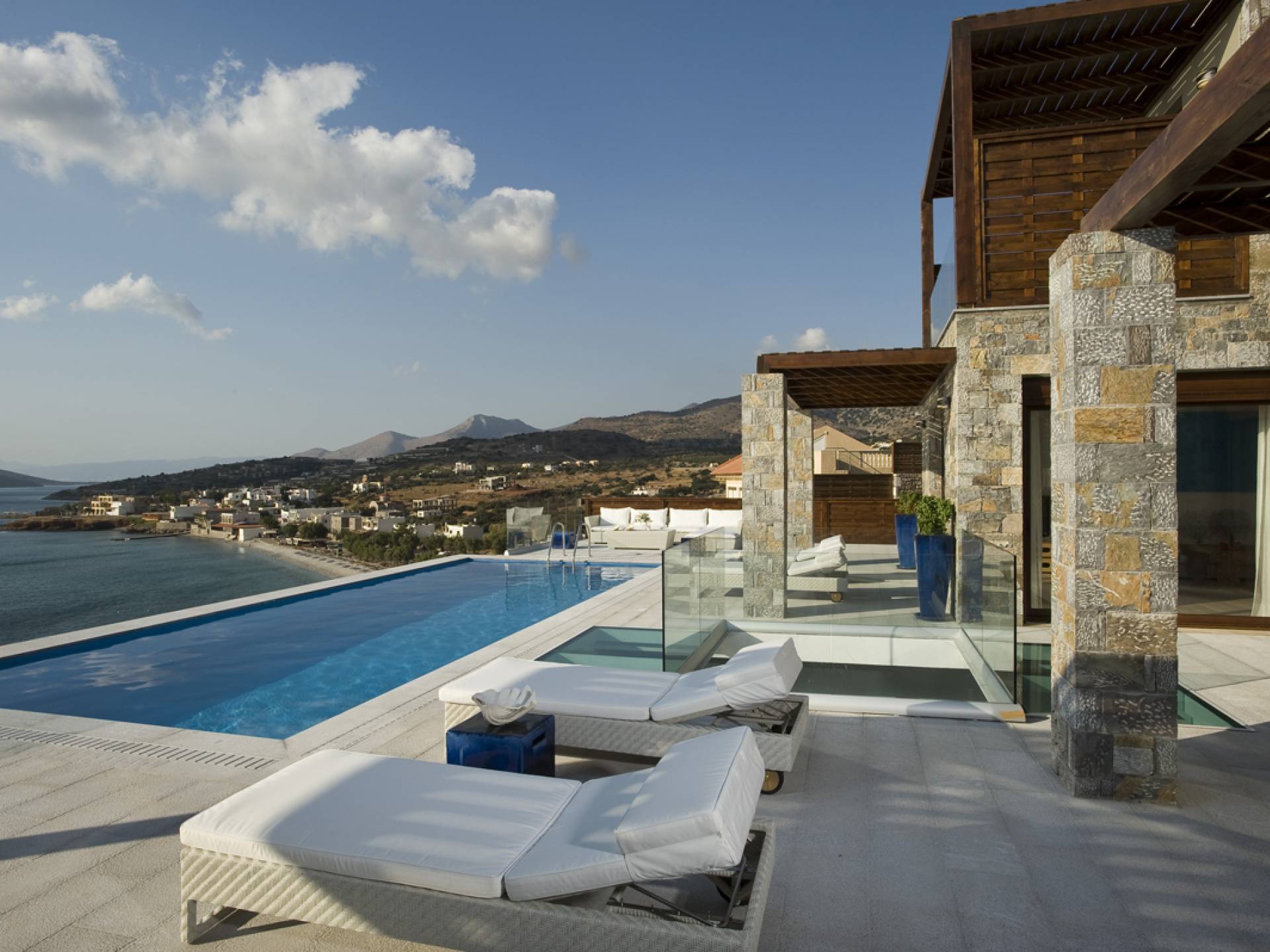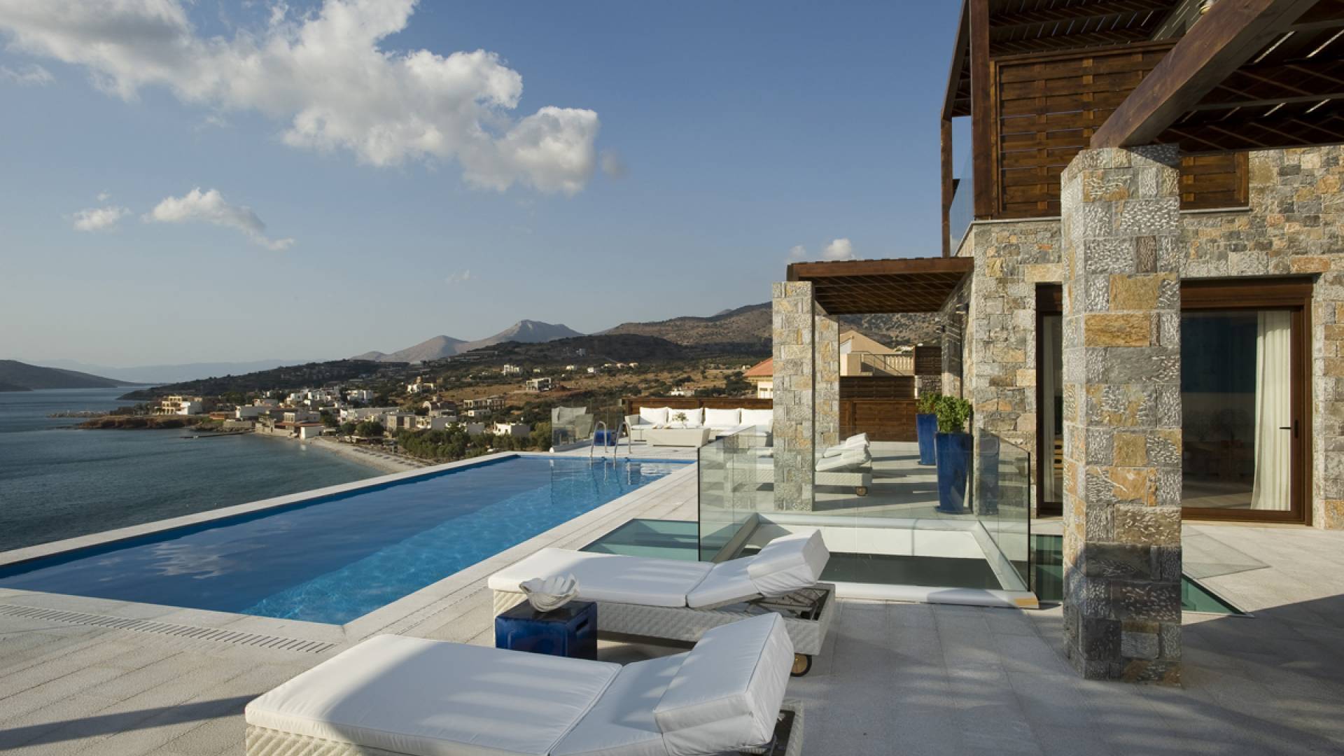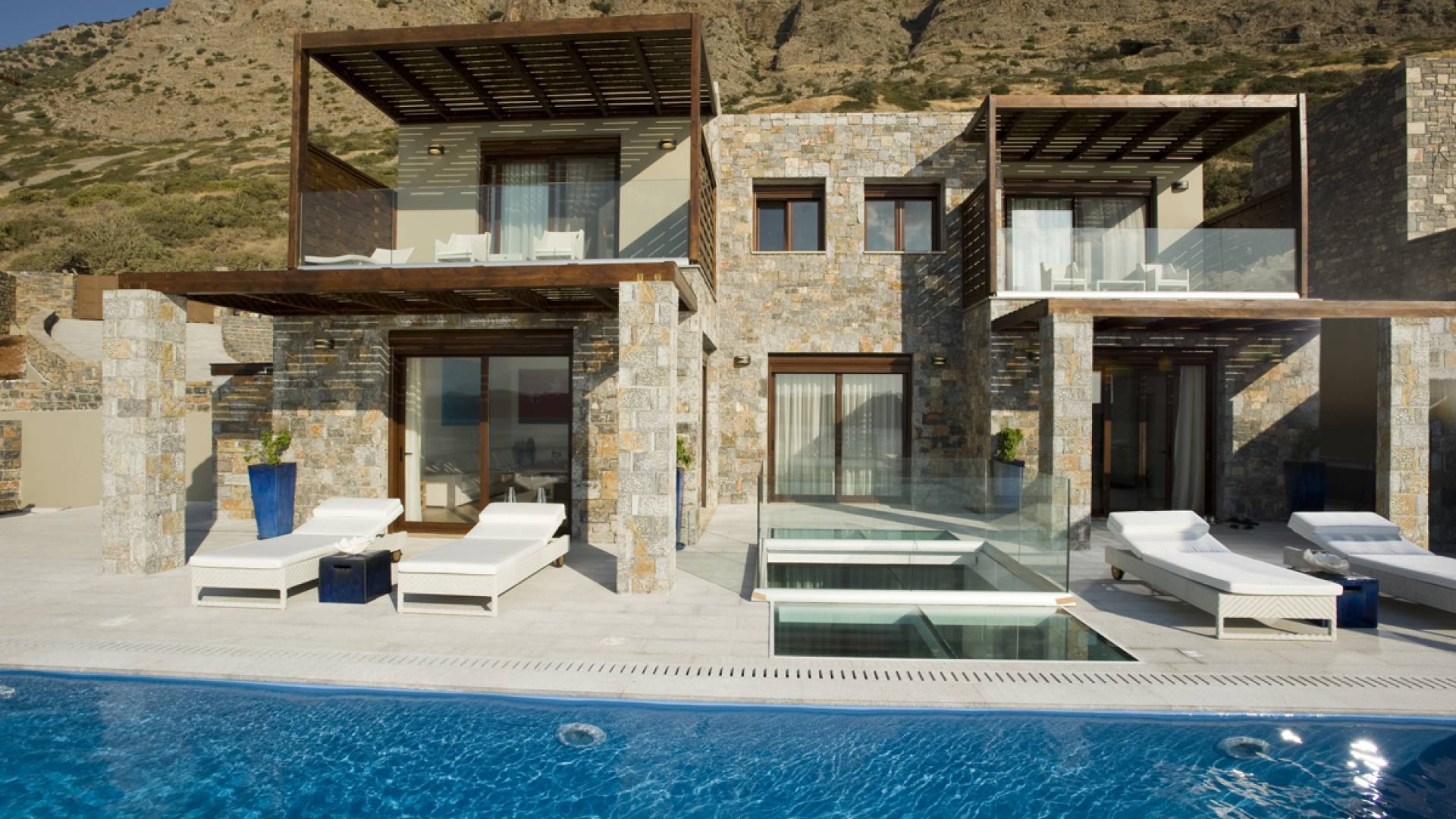Elounda Island View Villas Lasithi complex in Elounda, consists of seven luxurious villas of three different types, with their own private beach. Each residence has three levels and a unique design concept. The middle level is the entry level and there are also support areas such as the kitchen which serve both indoor and outdoor spaces with ease. This level is located between two more private levels and it has a direct connection between the two different types of areas.