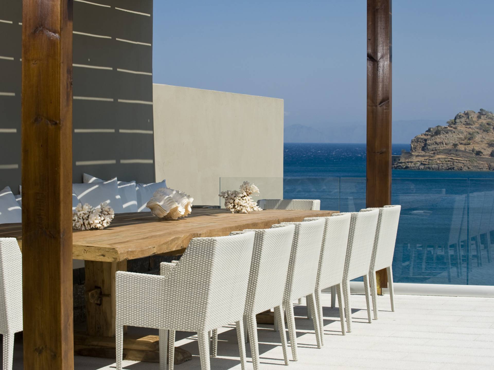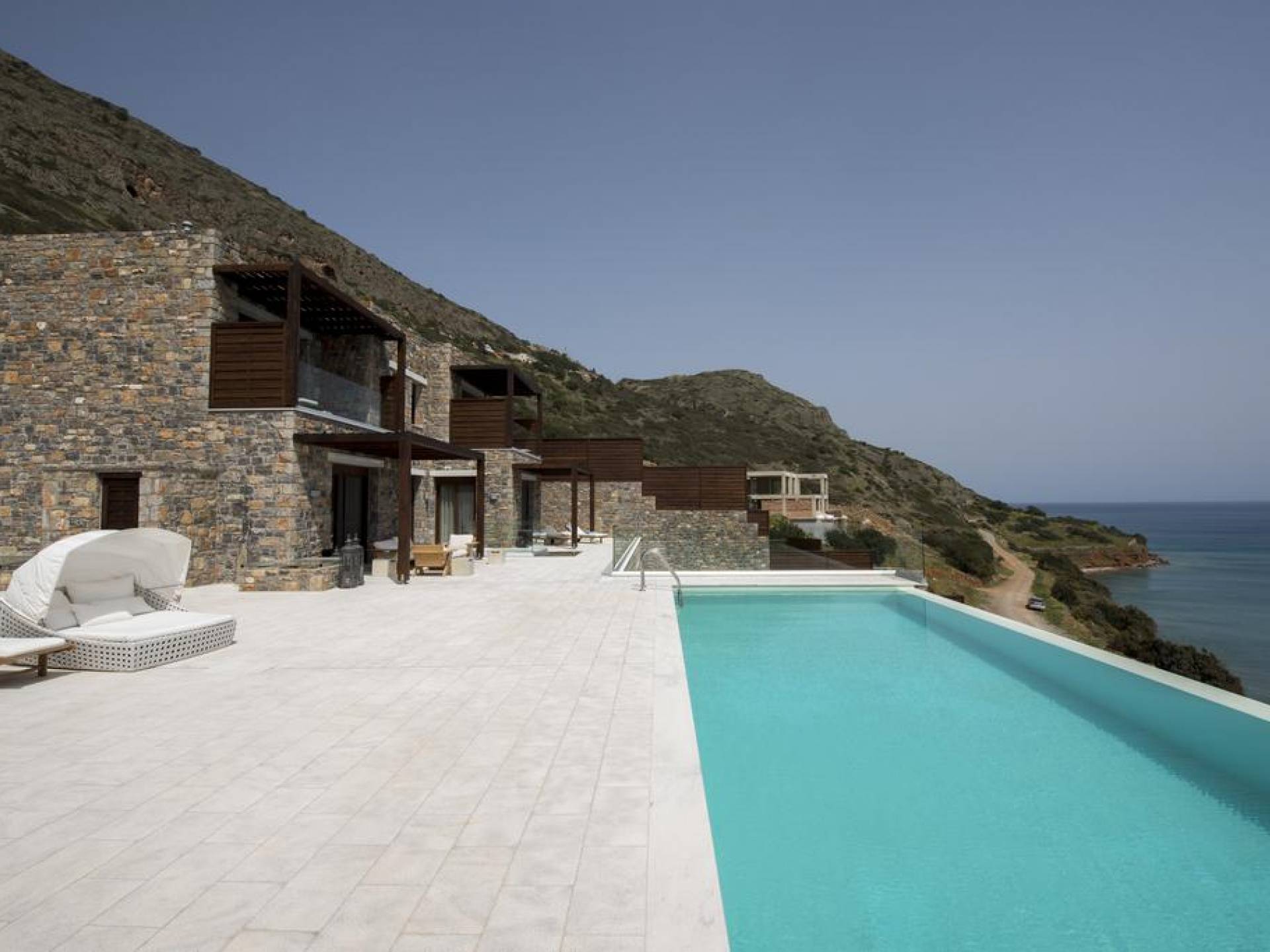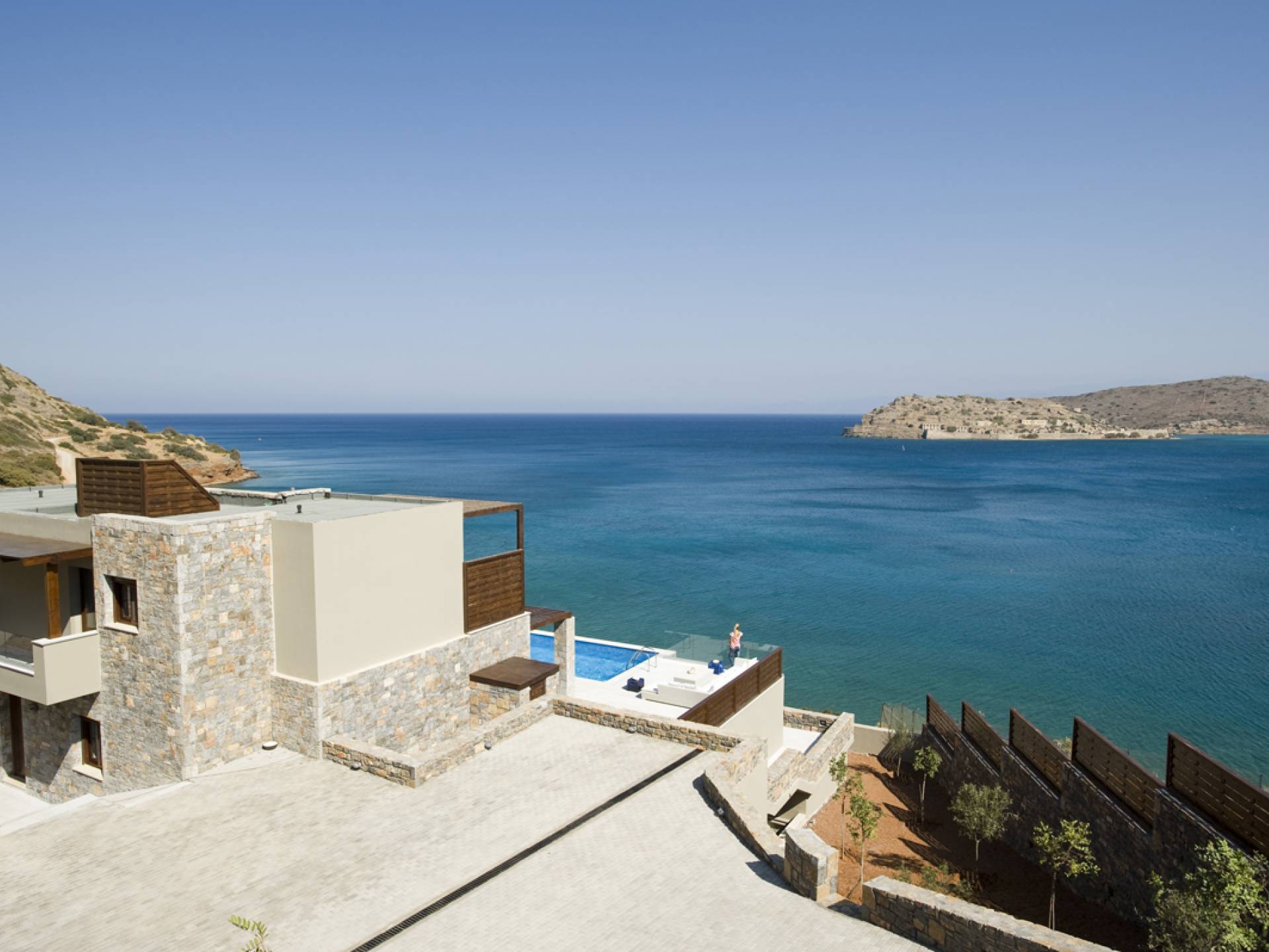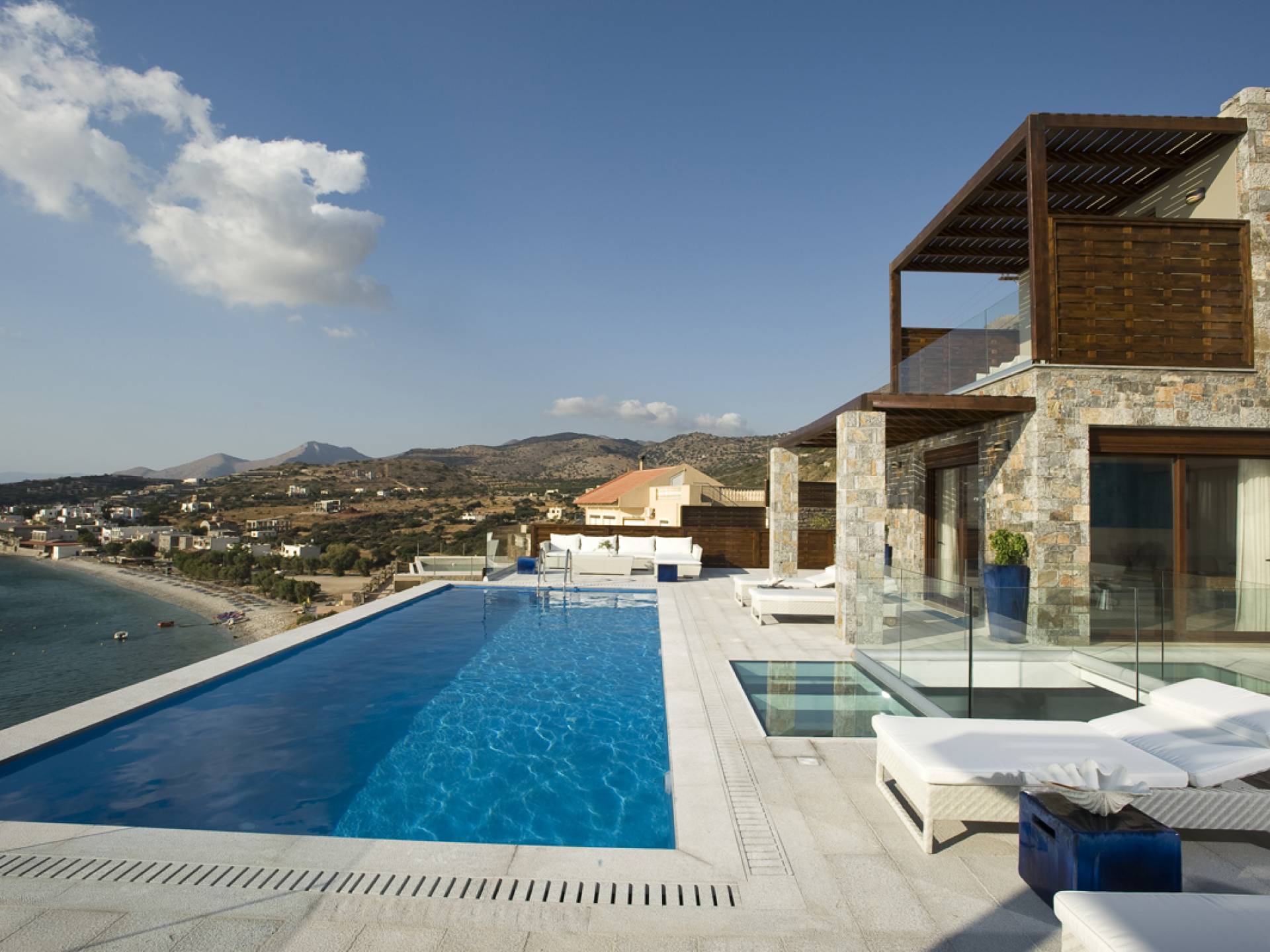 Elounda Island View Villas Lasithi complex in Elounda, consists of seven luxurious villas of three different types, with their own private beach. Each residence has three levels and a unique design concept. The middle level is the entry level and there are also support areas such as the kitchen which serve both indoor and outdoor spaces with ease. This level is located between two more private levels and it has a direct connection between the two different types of areas.