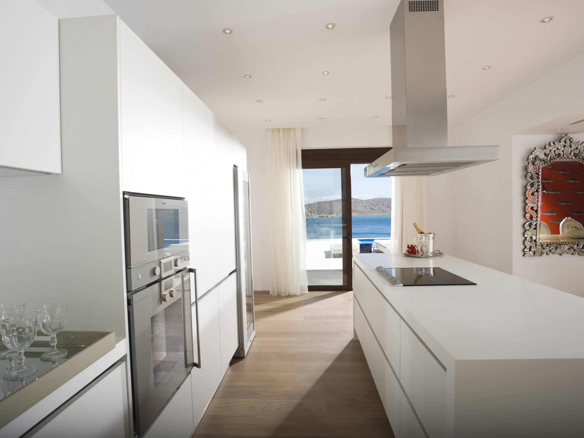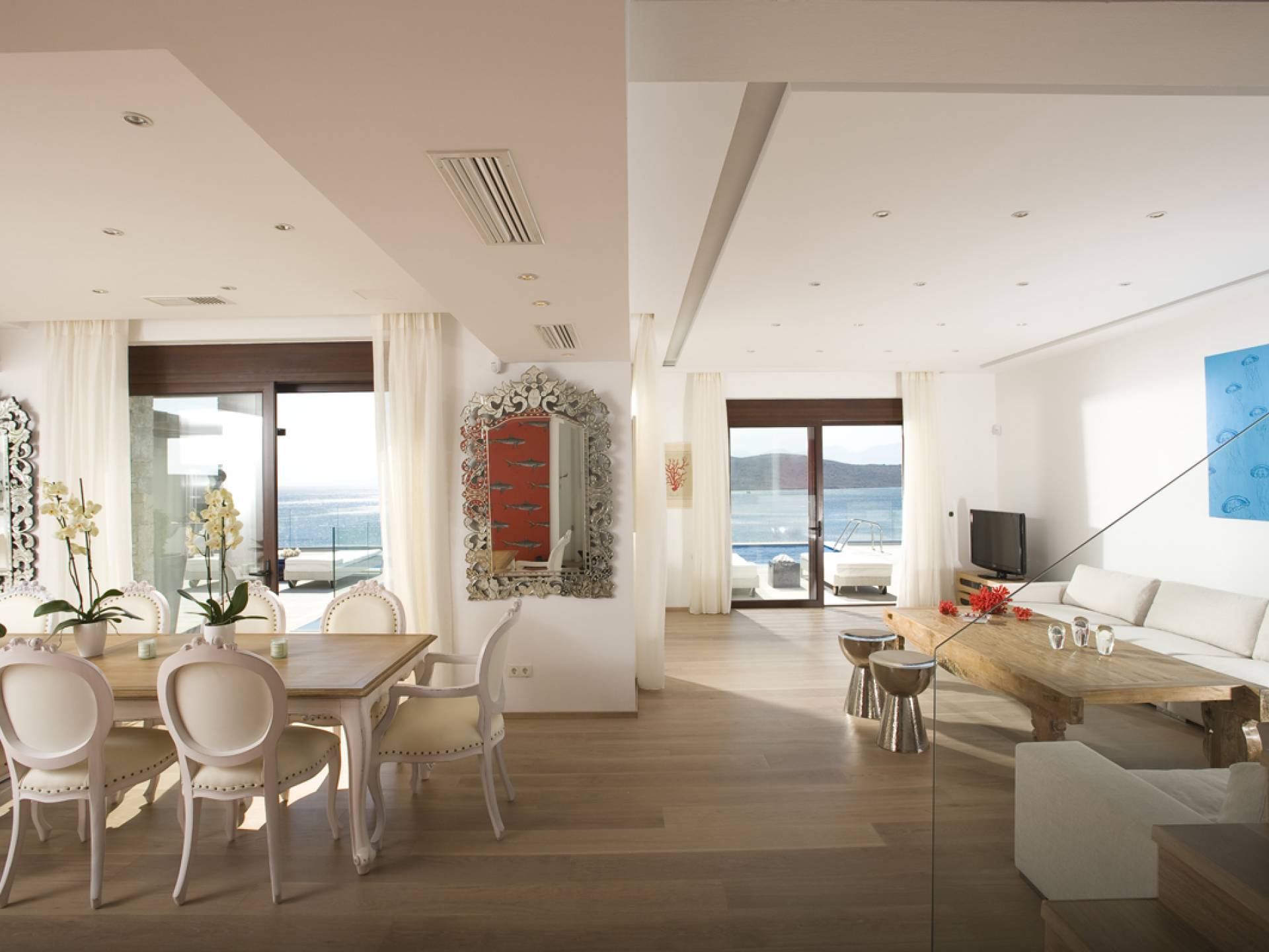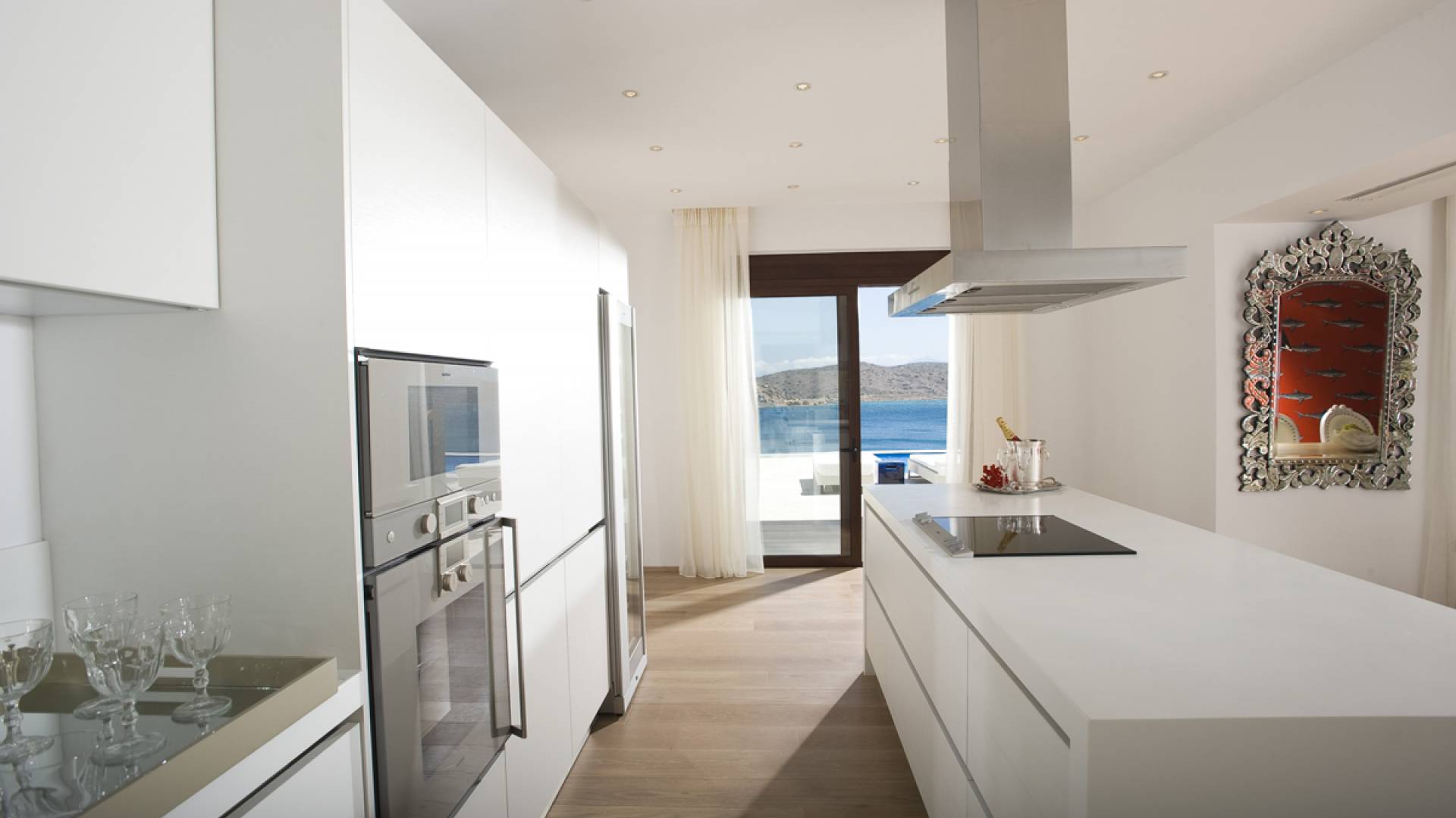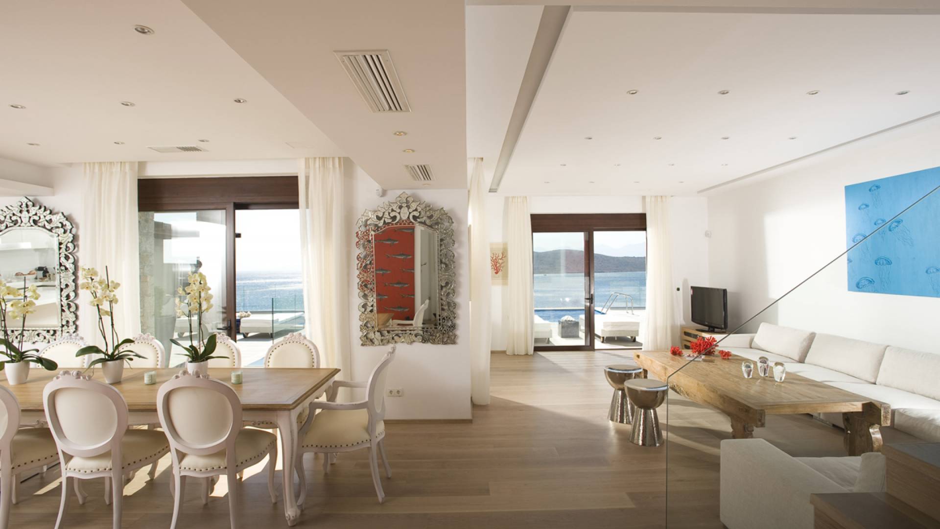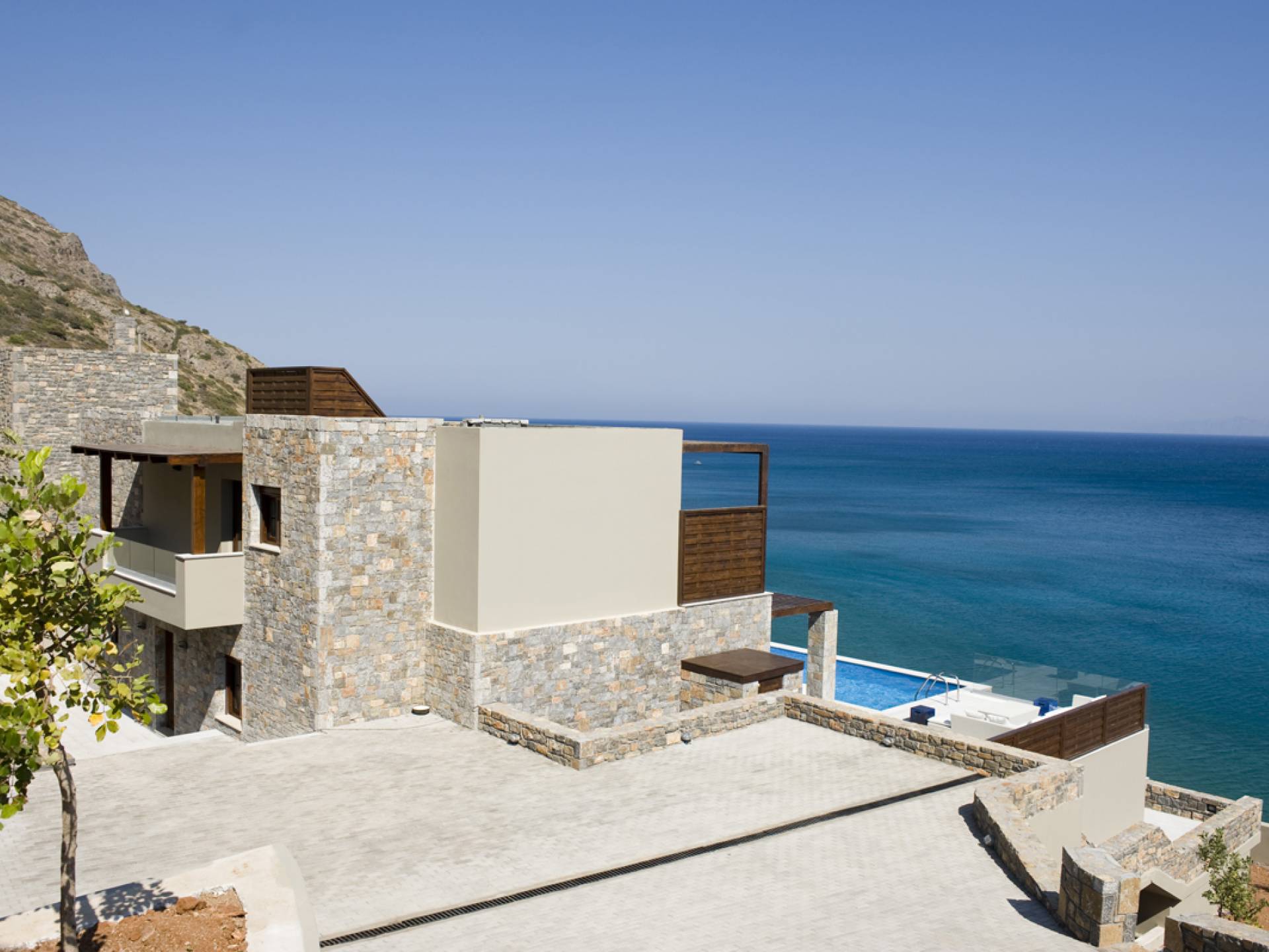 Elounda Island View Villas Lasithi complex in Elounda, consists of seven luxurious villas of three different types, with their own private beach. Each residence has three levels and a unique design concept. The middle level is the entry level and there are also support areas such as the kitchen which serve both indoor and outdoor spaces with ease. This level is located between two more private levels and it has a direct connection between the two different types of areas.