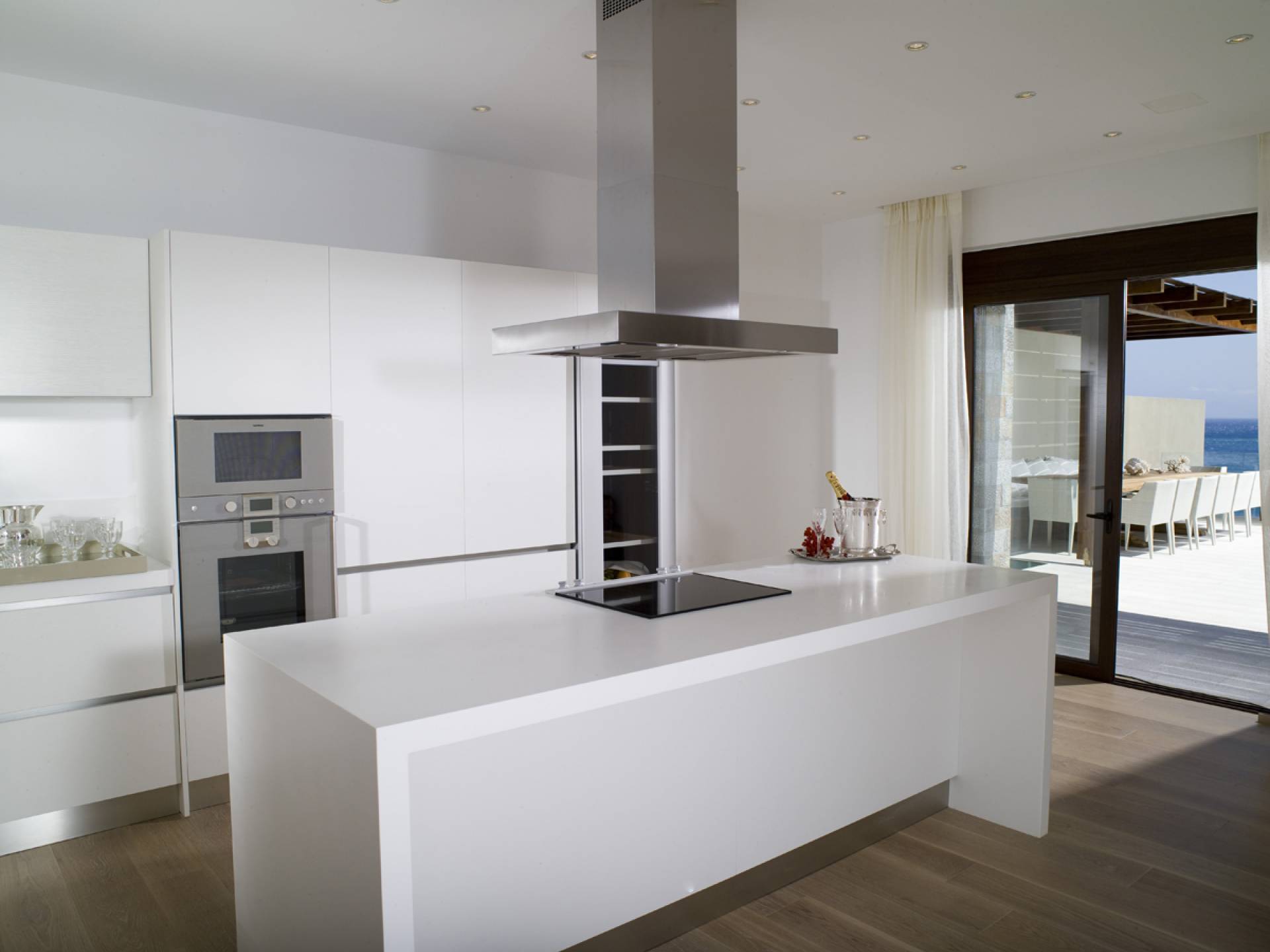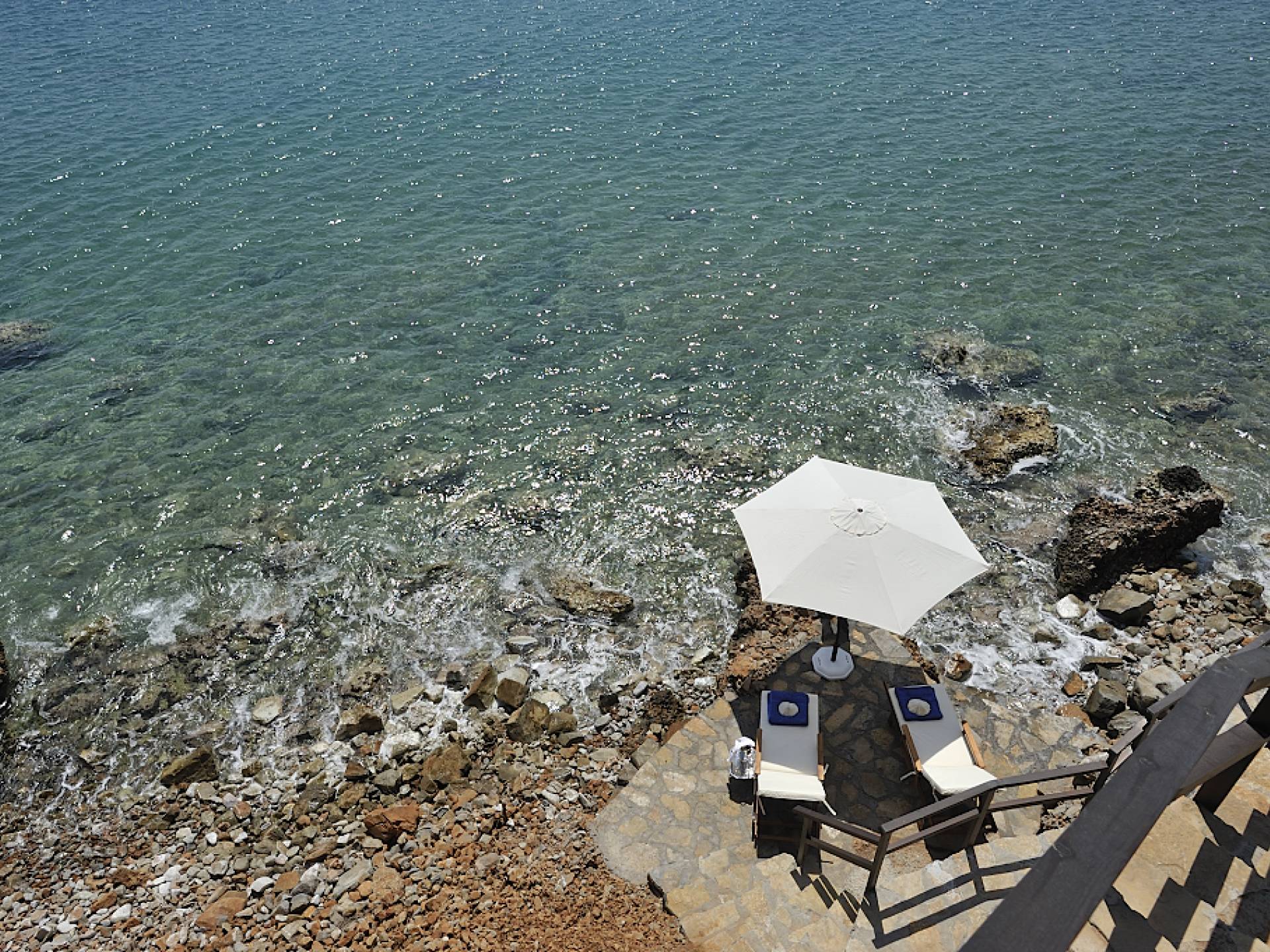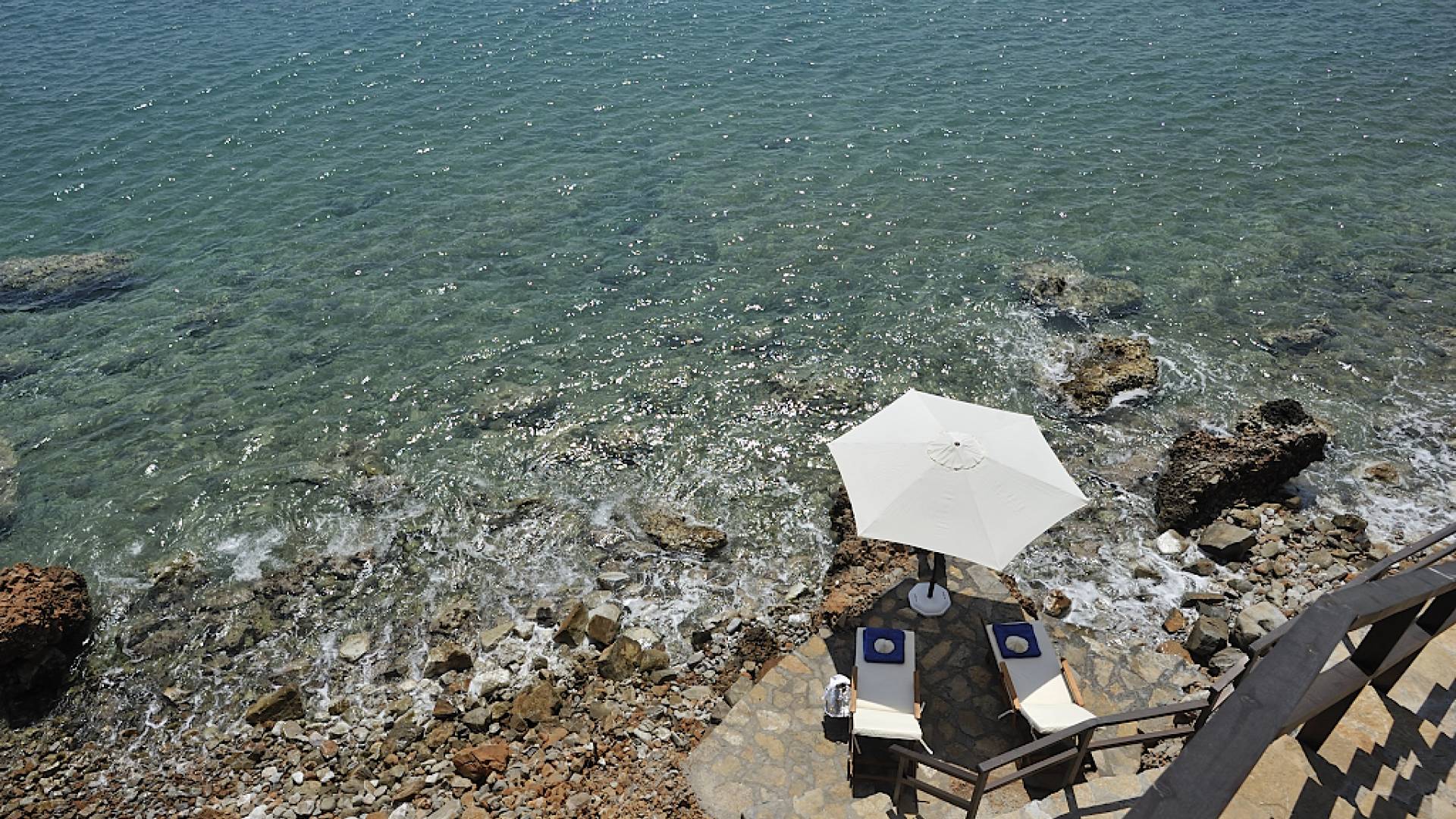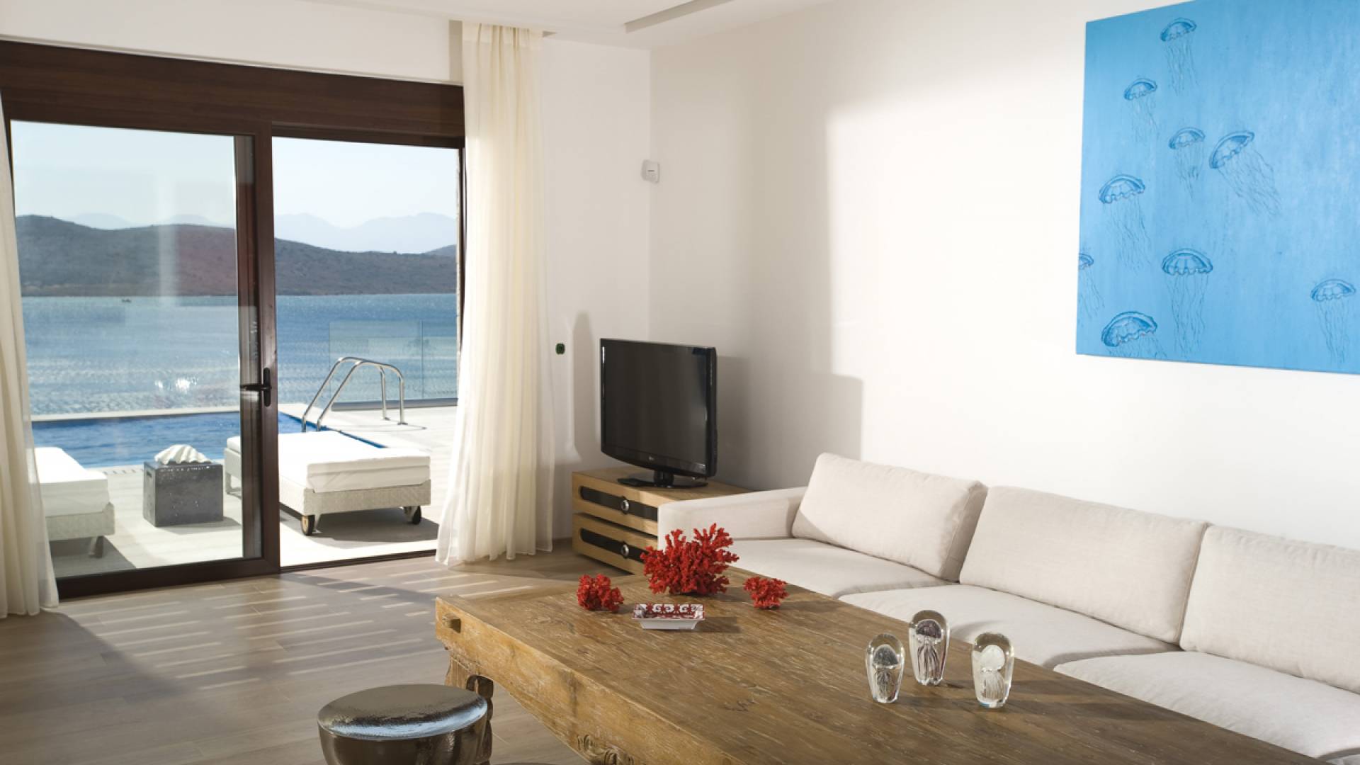 Elounda Island View Villas Lasithi complex in Elounda, consists of seven luxurious villas of three different types, with their own private beach. Each residence has three levels and a unique design concept. The middle level is the entry level and there are also support areas such as the kitchen which serve both indoor and outdoor spaces with ease. This level is located between two more private levels and it has a direct connection between the two different types of areas.