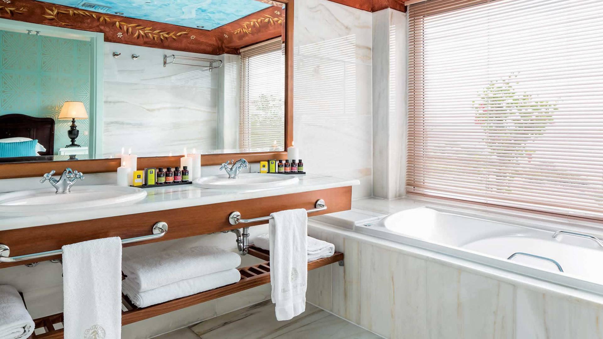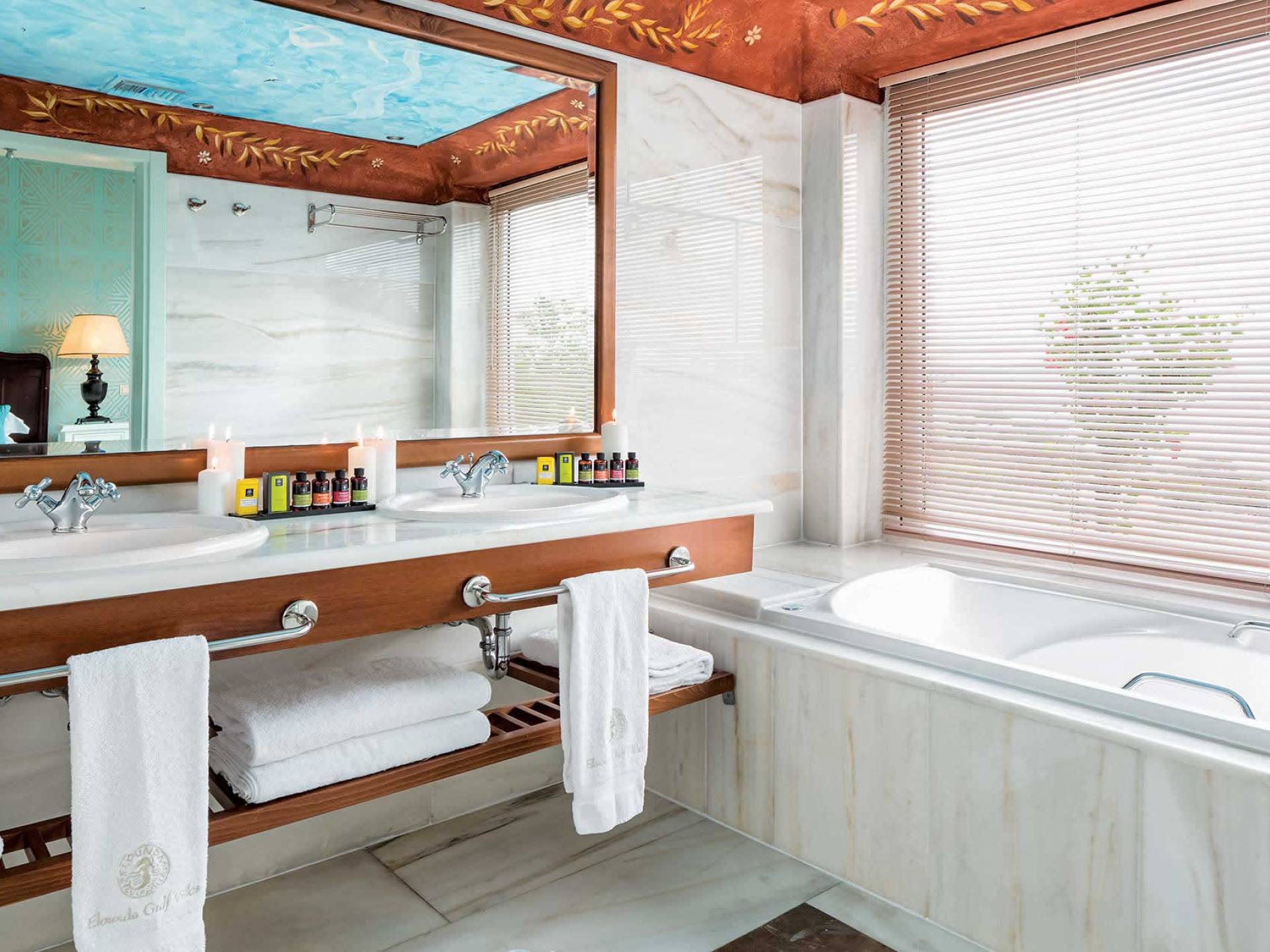 Occupying an area of 120-150m² the two-bedroom Pool Villas comprise of two master bedrooms full of vivid colors with comfortable beds, nice furnishings, en suite bathrooms and a spacious living room, and a fully equipped kitchen. The two-bedroom Elounda Pool Villas also offers a private pool and Jacuzzi. The capacious bathrooms are elegantly designed with marble features and hand-painted ceilings to offer guests various amenities to ensure wellness and relaxation.
