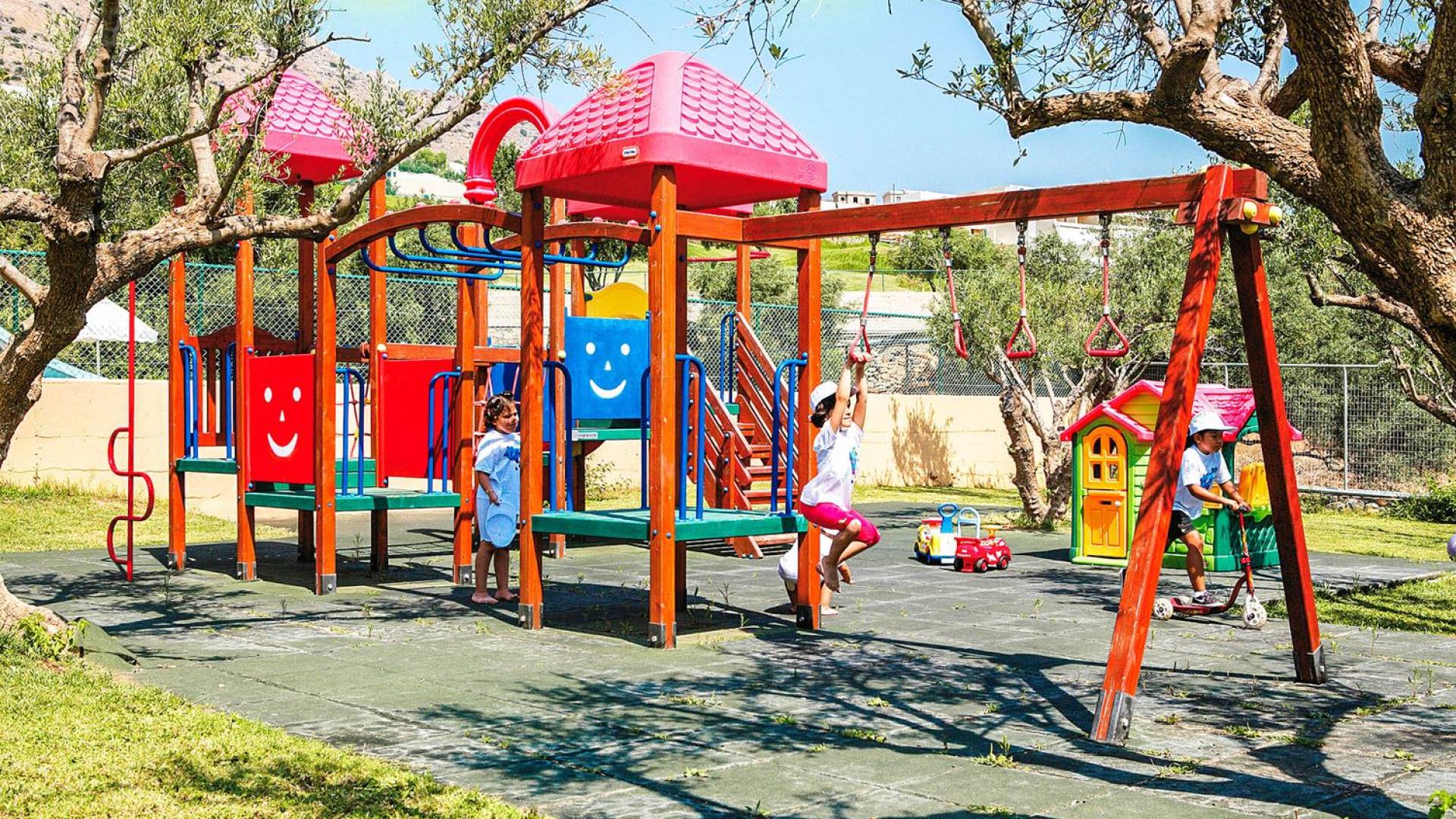 Sports and leisure activities include an AstroTurf tennis court, where tuition is available, a fitness room, table tennis, as well as an indoor area with a sauna and a steam room. Situated in the sister property Porto Elounda [at 500m, with complimentary shuttle service], a nine-hole par-3 golf course with golf academy run by a multi-lingual PGA instructor. Further facilities at Porto Elounda, near the golf course, include a 5-on-5 football pitch with Valencia Soccer Camps tuition, as well as the “Kid’s Ark”, a complete childcare center of a unique design. The Crèche cares for children aged between 4 months and 4+ years. The activities center welcomes juniors from 5+ years to 11+years with water slides and playground set in an olive grove for children to play under supervision. Finally, the Teens Club is for 12+ years to 17 years.