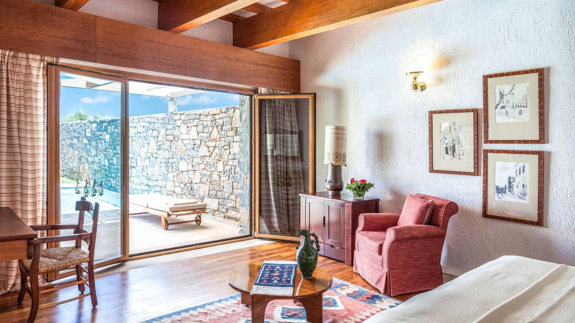 The charm and character of the hotel are evident to anyone taking an enchanting stroll through the lush seaside gardens of the Elounda Mare Hotel, and its rugged coastline with the many private coves, plateaus, and the gorgeous little sandy beach. Guests particularly enjoy the many lounges, enjoying their aperitif or just a cup of tea on the terrace, in perfectly elegant surroundings furnished in antiques.