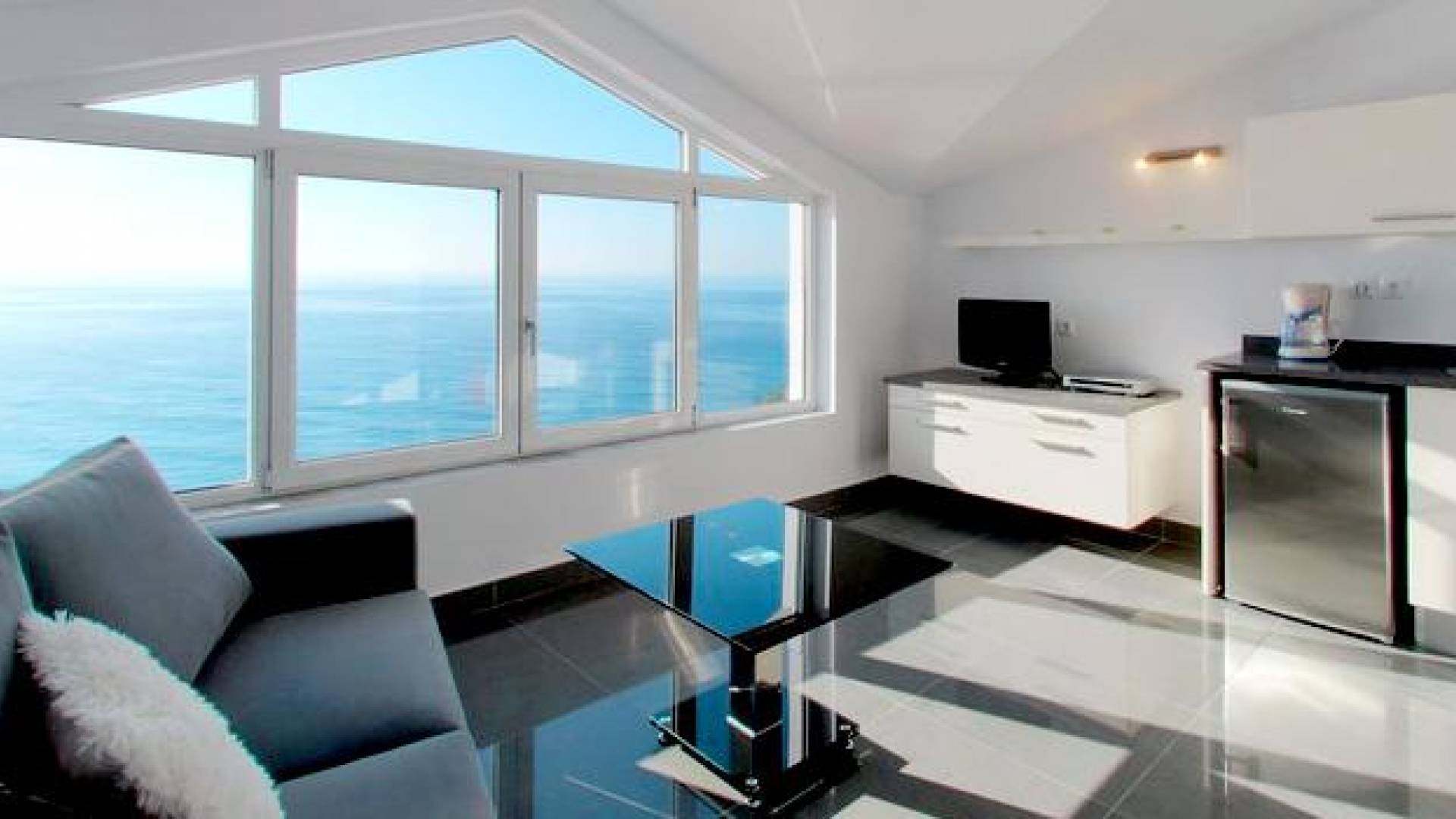 Bedroom 3: Double bed, en suite bathroom with a shower and a hydro massage column, a window with a spectacular mountain - sea view. Continuing on from the bedroom is a small area (small lounge area) with a sofa that folds out into a bed, cupboards with a sink, fridge, coffee maker, electric kettle and a huge window offering a sea view. All bedrooms comprise of LCD satellite television, fitted wardrobes and hair dryer.