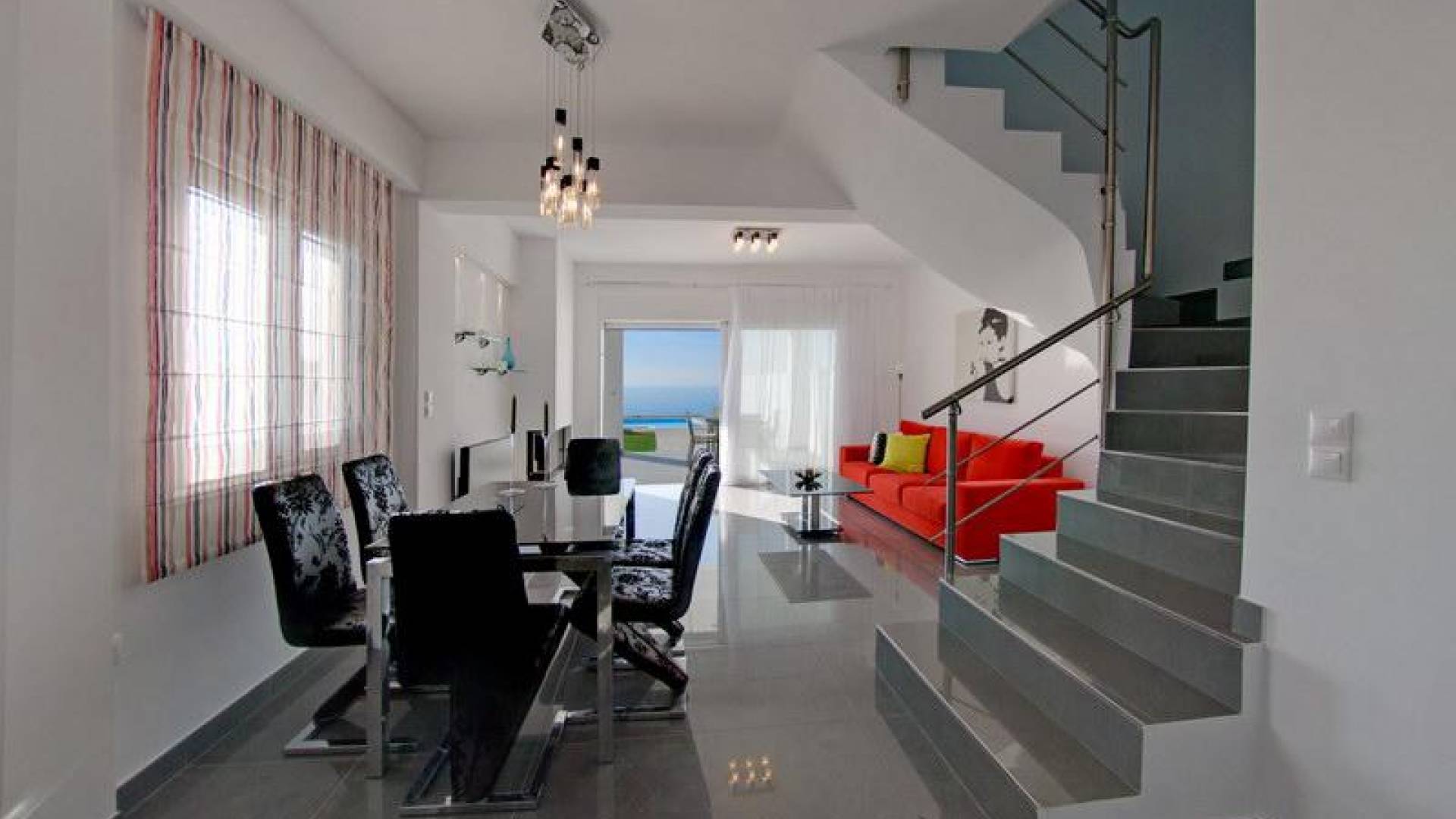Both villas has a total area of 290m². Individually, each villa comprises of three floors and can accommodate up to seven (7) adults, fourteen (14) totally . On the ground floor one will find a fully equipped kitchen, a dining room, a lounge room with a sofa, a fireplace and W.C. The 1st floor has two bedrooms with en suite bathrooms, whilst the 2nd floor comprises of an open area with a double bed and sofa that folds out into a bed and a kitchenette. The villas are suitable for large families or large groups and can be rented as one property. In that case the intermediate fence can be removed.