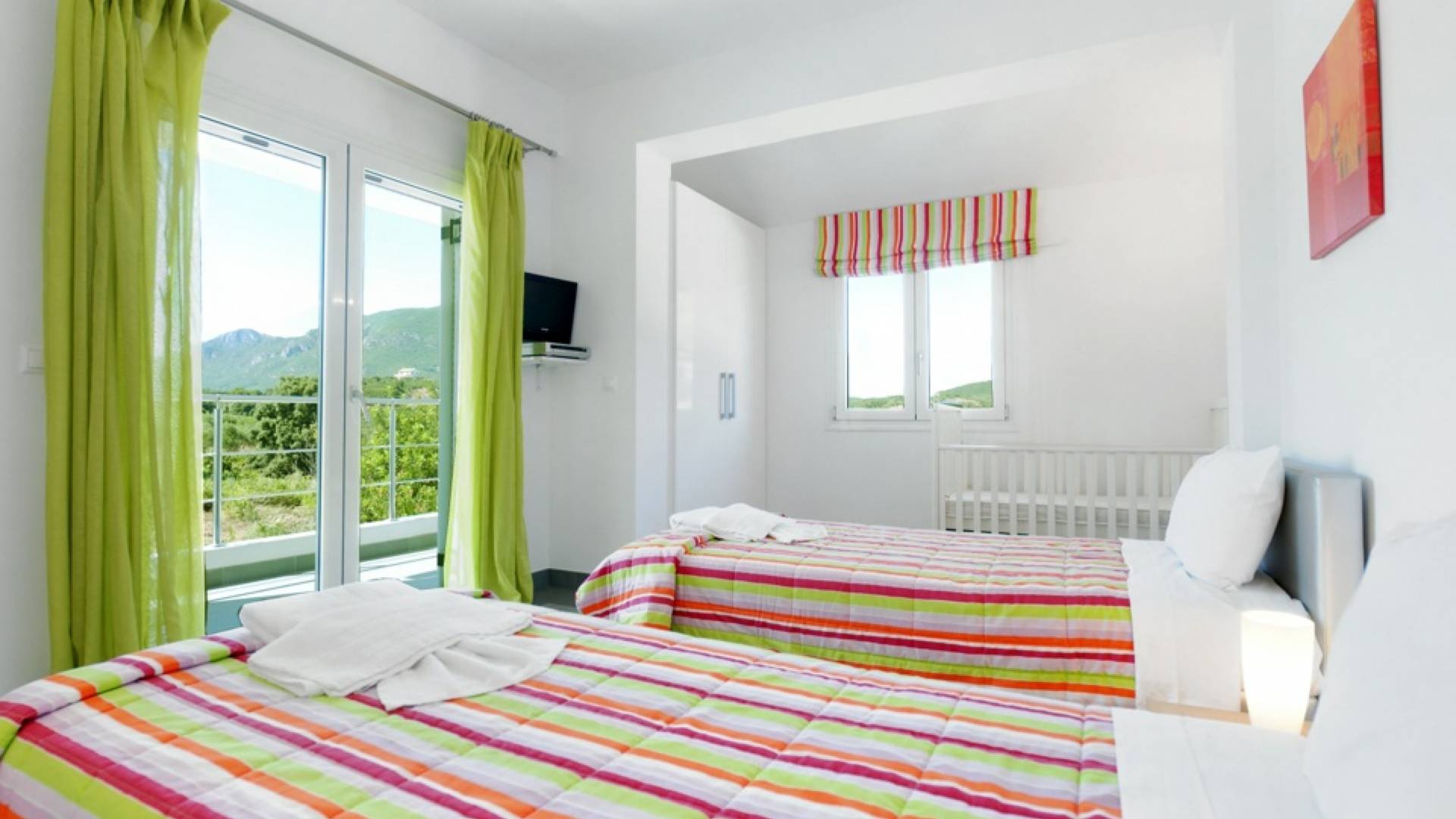 Bedroom 2: Two single beds with the ability of joining them into a double bed, en suite bathroom with a shower and a hydro massage column, a large balcony with a spectacular sea view.