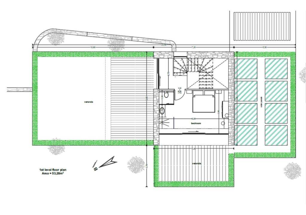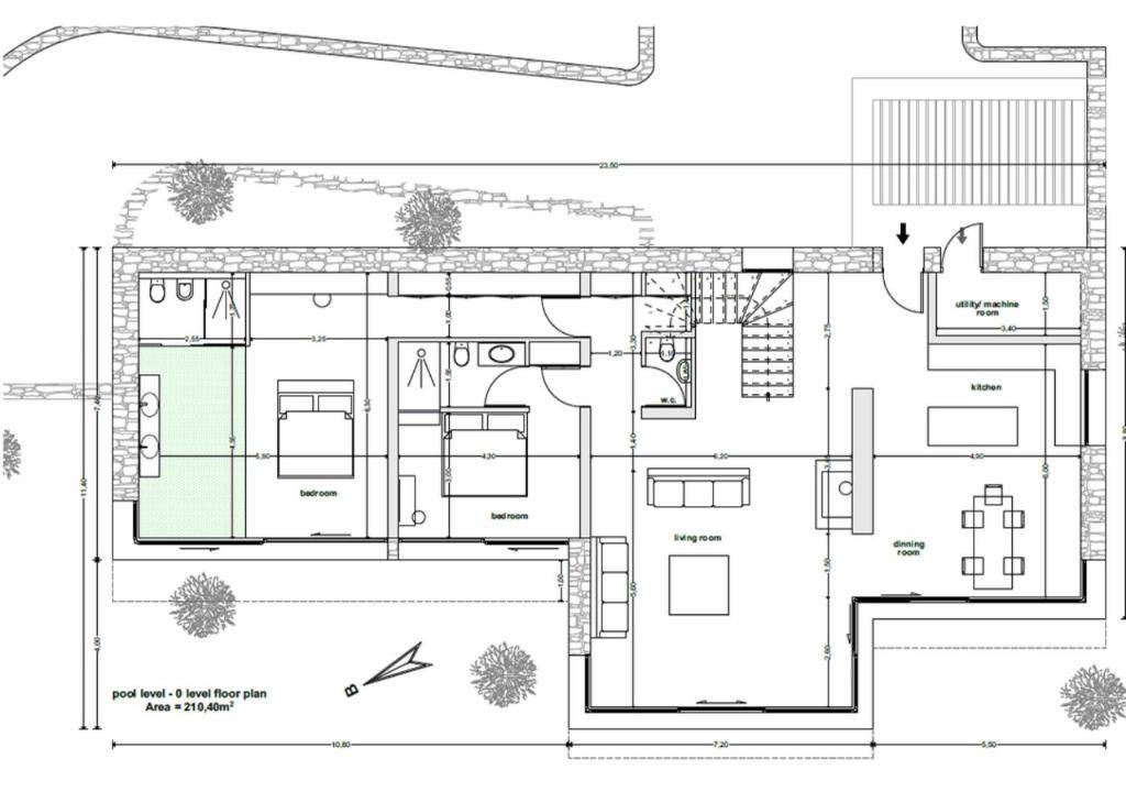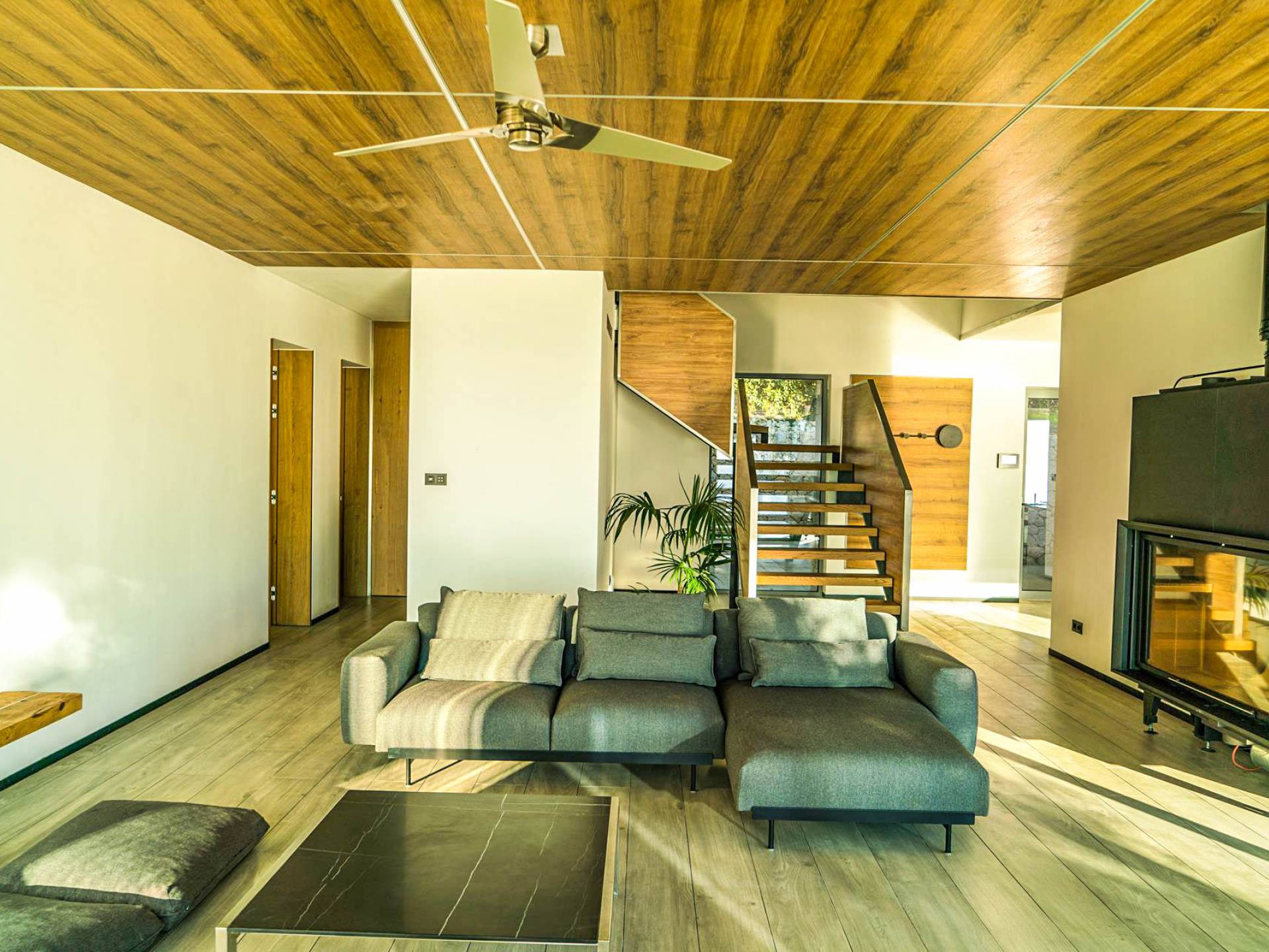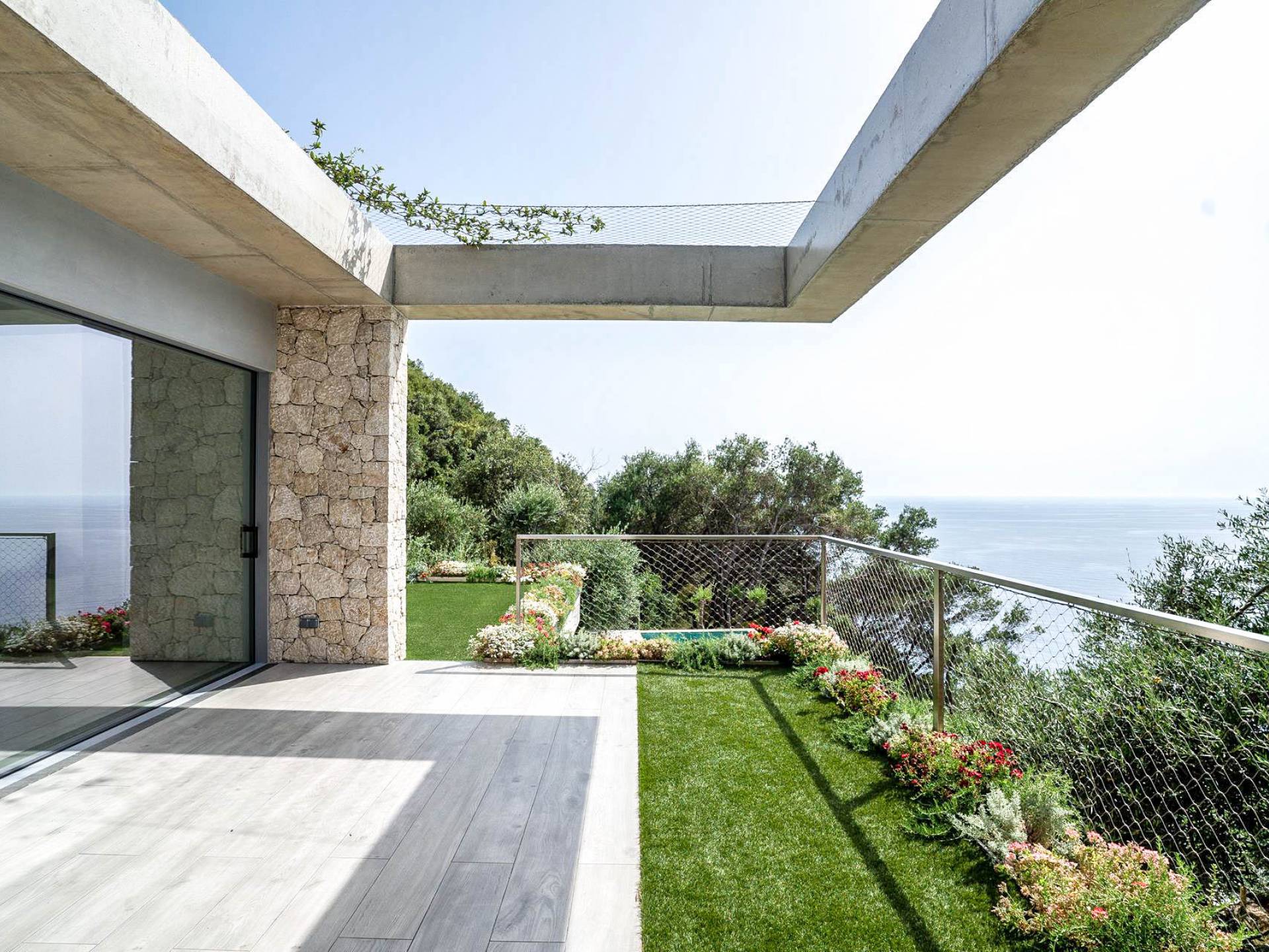 The magnificent two levels property has 3 bedrooms, 4 bathrooms, 200 m² terraces, an outdoor area with a garden, a 17×4 meters size infinity pool with an overflow edge and a Jacuzzi. The ground floor is the size of 210 square meters, and the second floor – is 53 square meters. The villa was built and furnished in 2022.