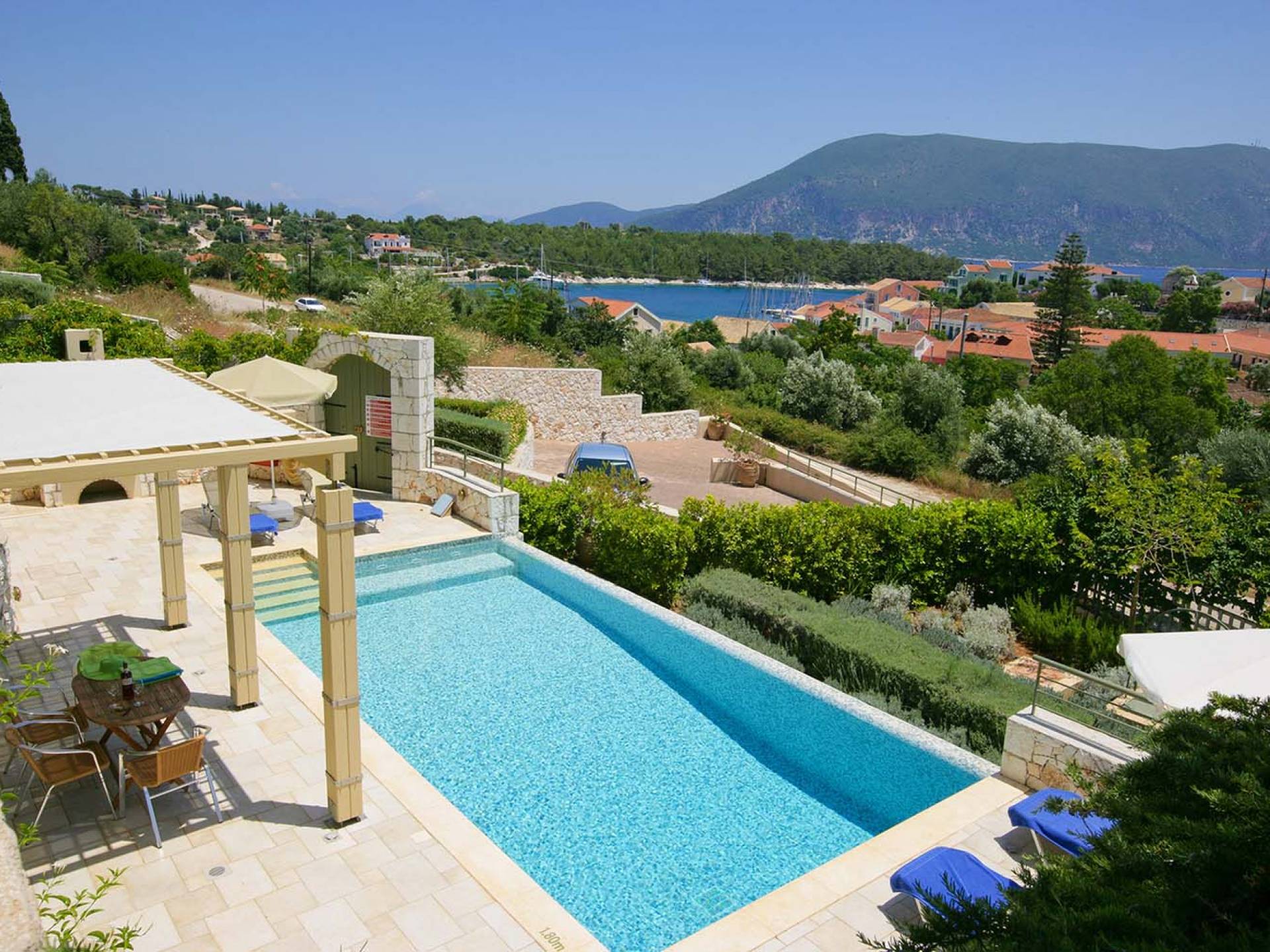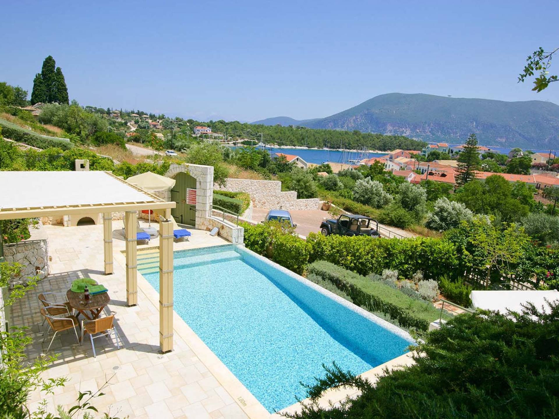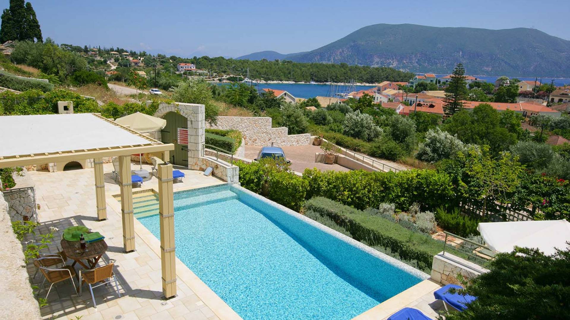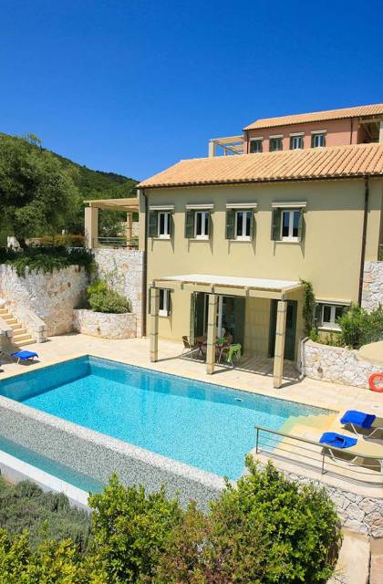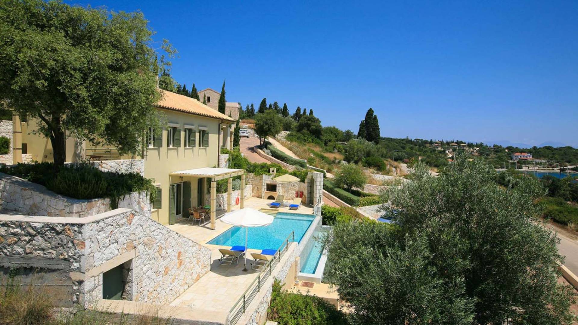 Villa Dendrolivano at Fiscardo View Villas is one of the most sought after villas on the Island of Kefalonia due to its idyllic hillside location overlooking the yachts and fishing boats moored in the harbour of Fiscardo. Villa Dendrolivano at Fiscardo View Villas is the first villa from the three that comprise the Fiscardo View Villas and it is ideal especially for families with young kids or older guests as it is closer to the road and not up on the hilltop. The views over the harbor and Ionian Sea towards the Island of Ithaca from the infinity swimming pool and terraces are simply stunning.