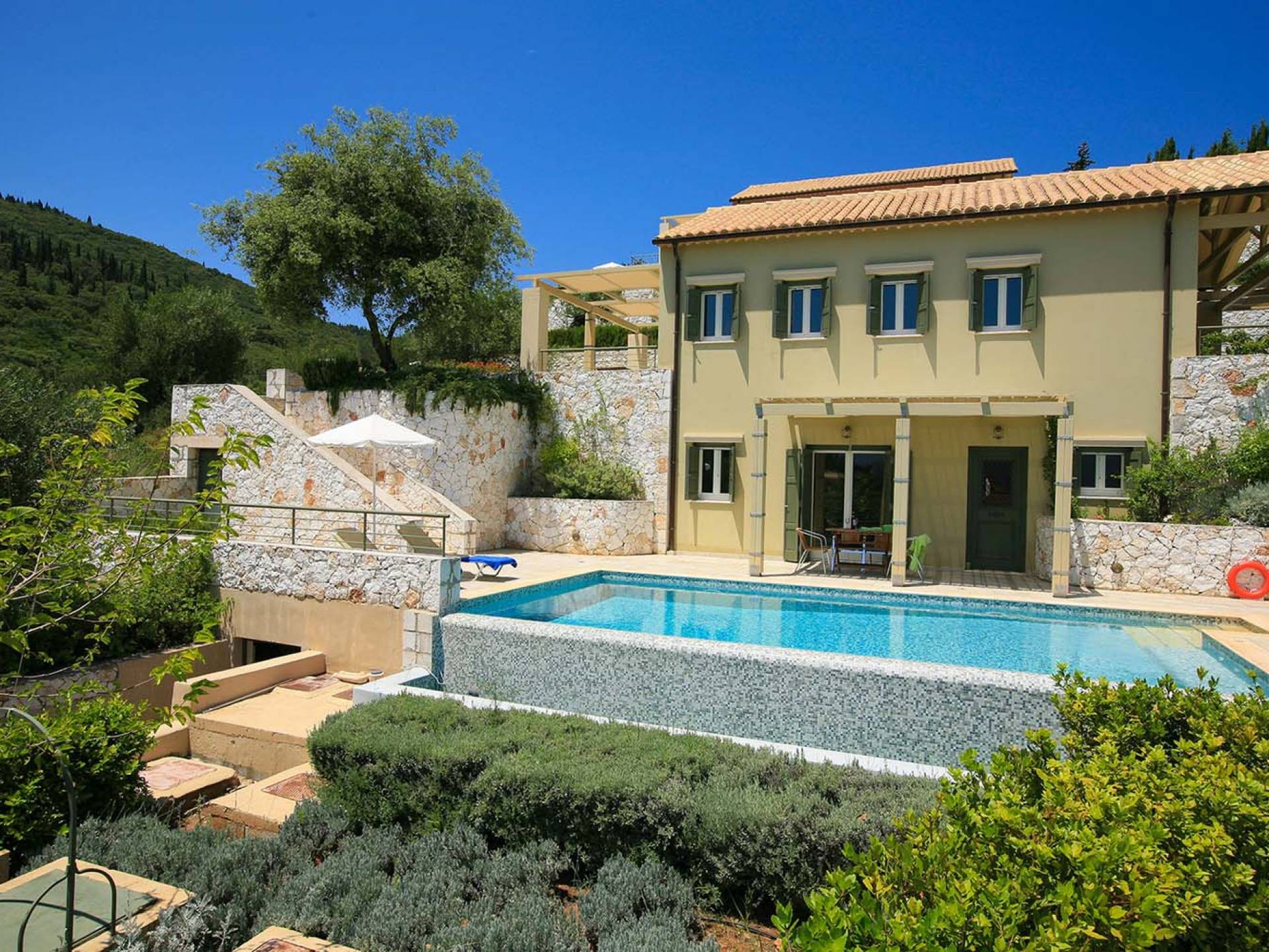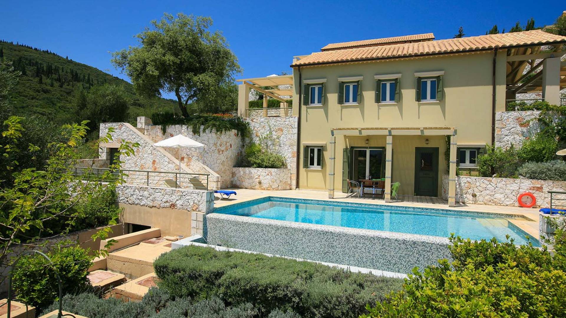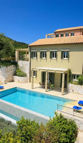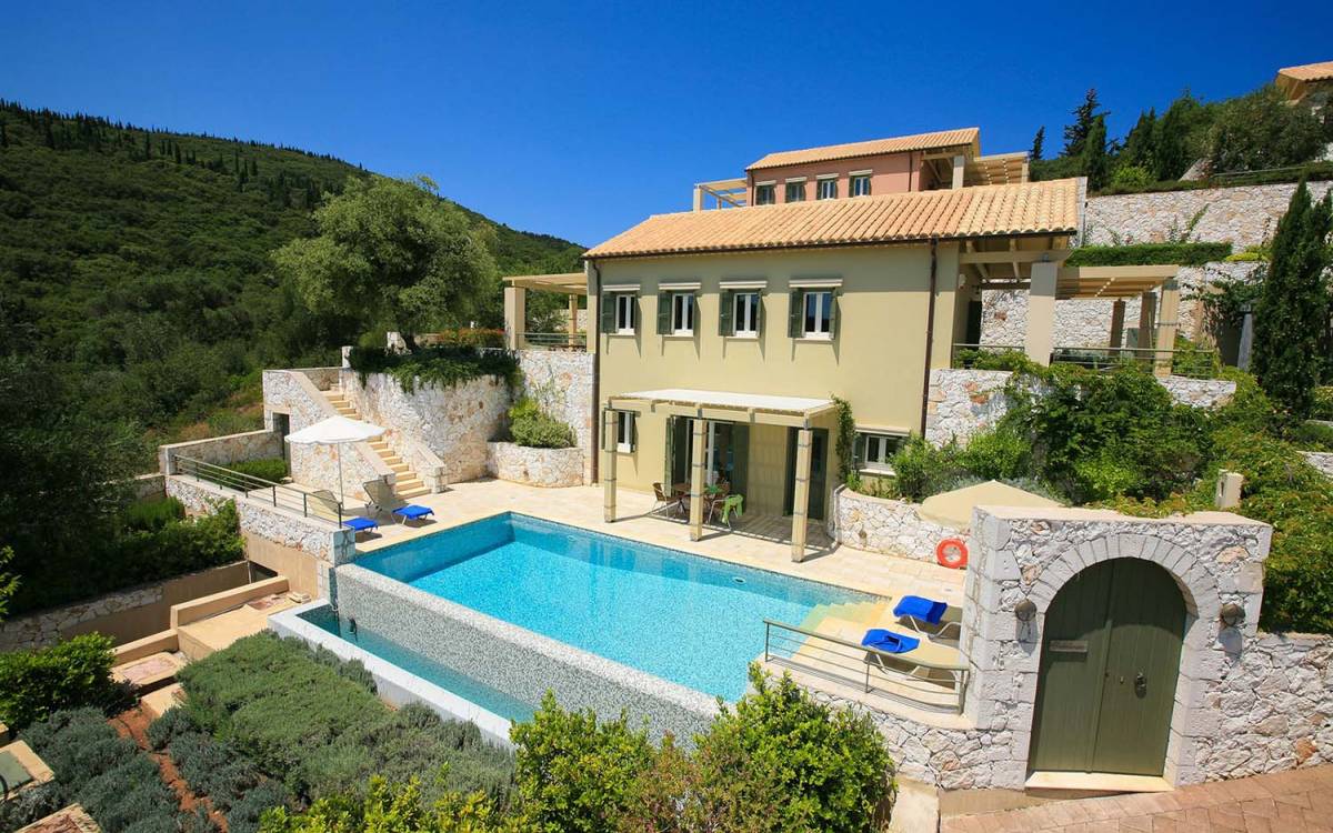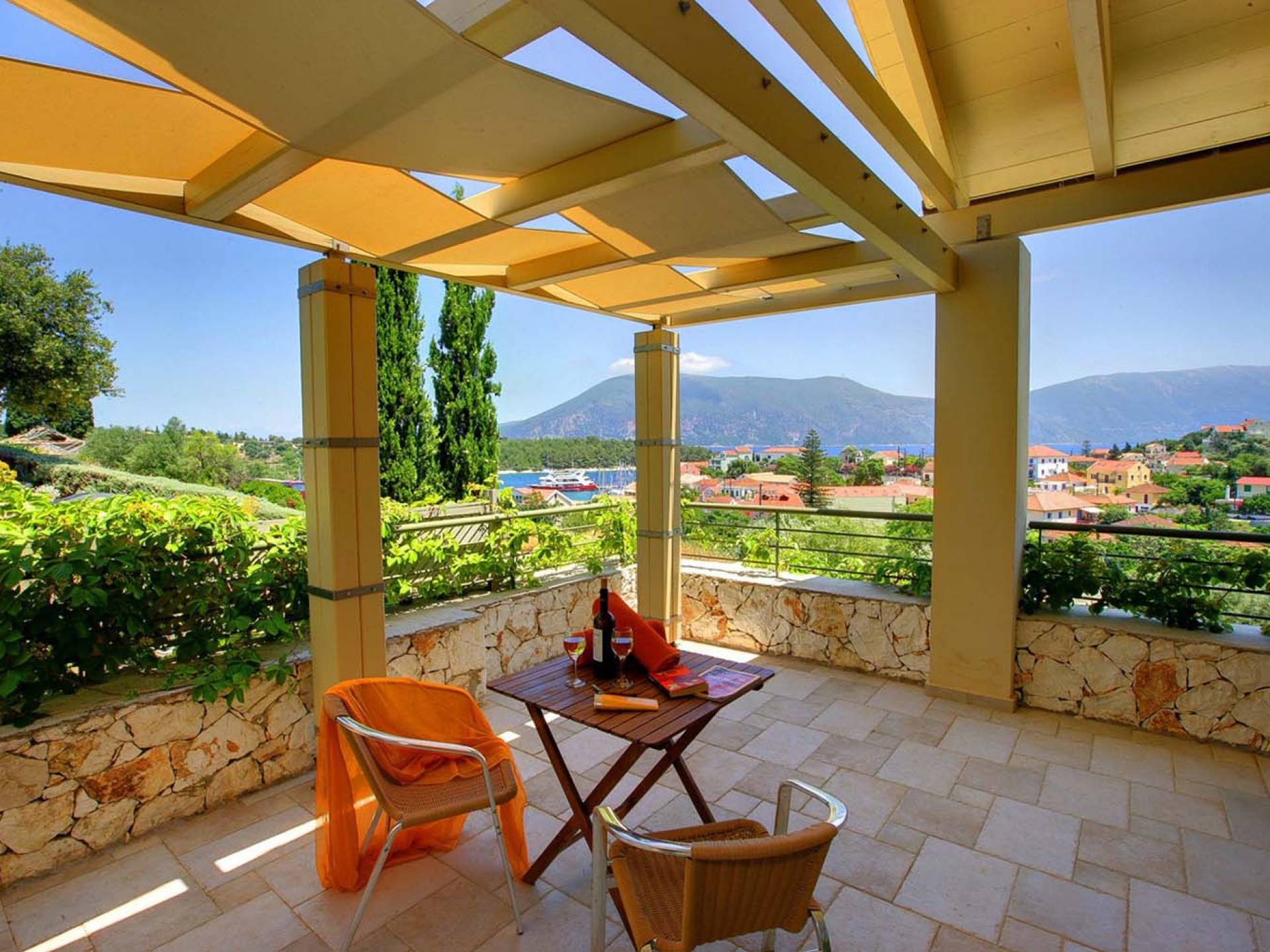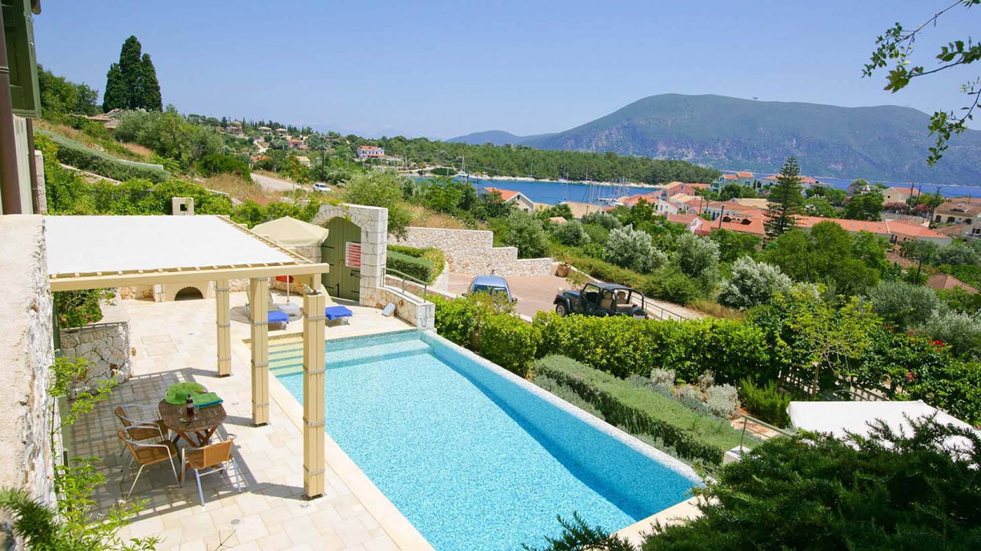 Villa Dendrolivano at Fiscardo View Villas is one of the most sought after villas on the Island of Kefalonia due to its idyllic hillside location overlooking the yachts and fishing boats moored in the harbour of Fiscardo. Villa Dendrolivano at Fiscardo View Villas is the first villa from the three that comprise the Fiscardo View Villas and it is ideal especially for families with young kids or older guests as it is closer to the road and not up on the hilltop. The views over the harbor and Ionian Sea towards the Island of Ithaca from the infinity swimming pool and terraces are simply stunning.