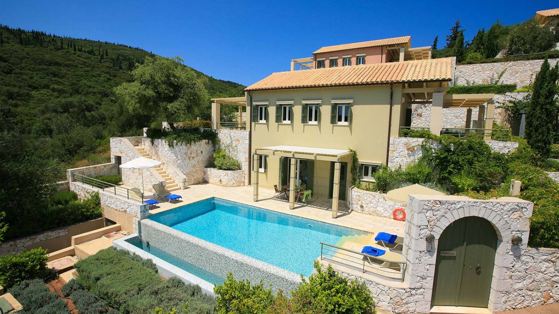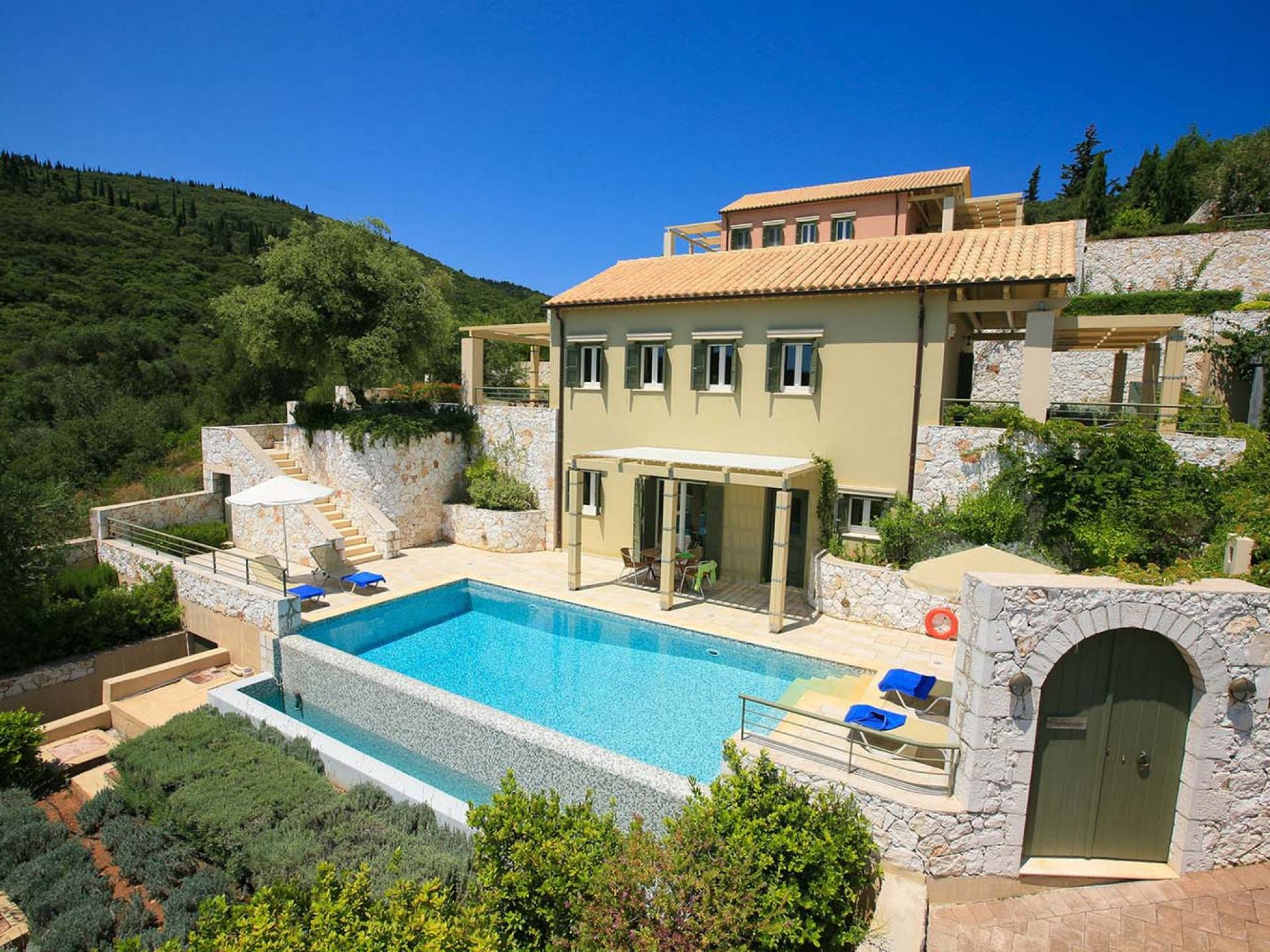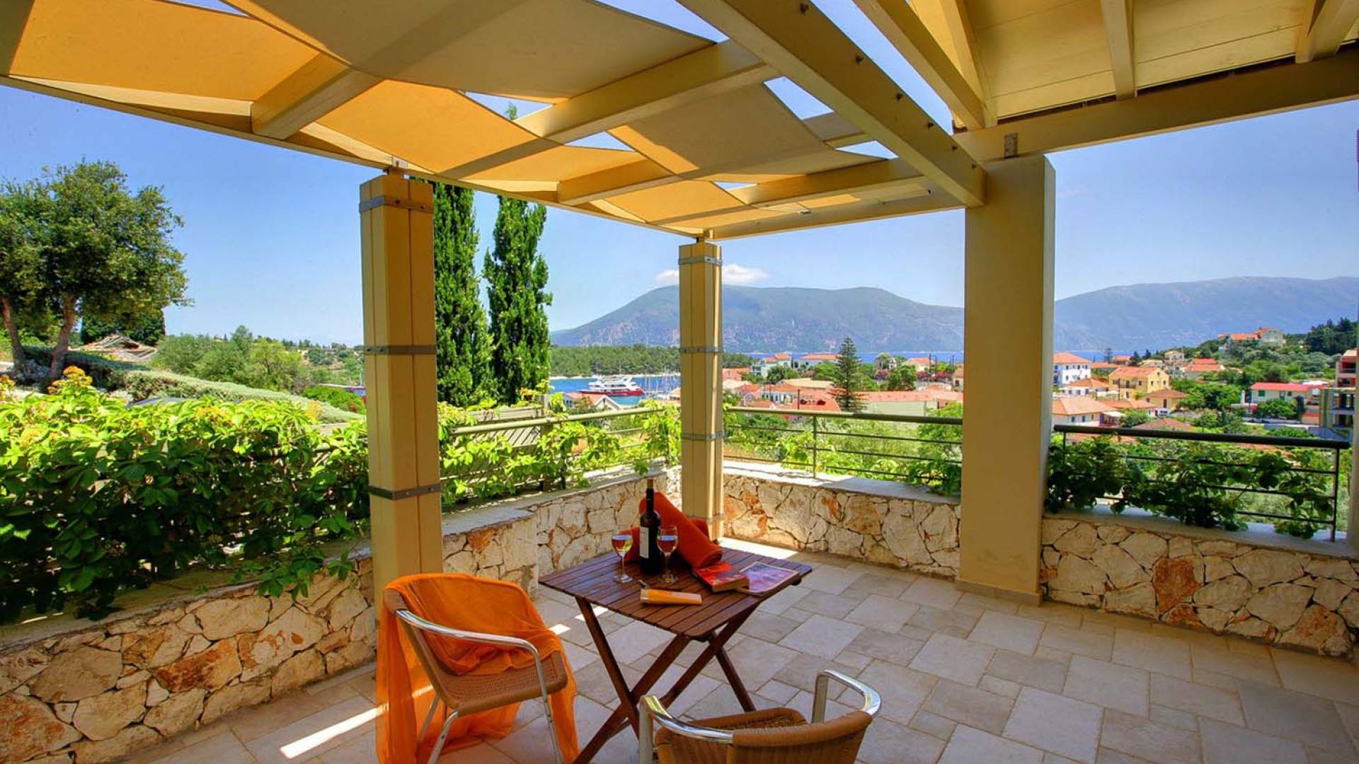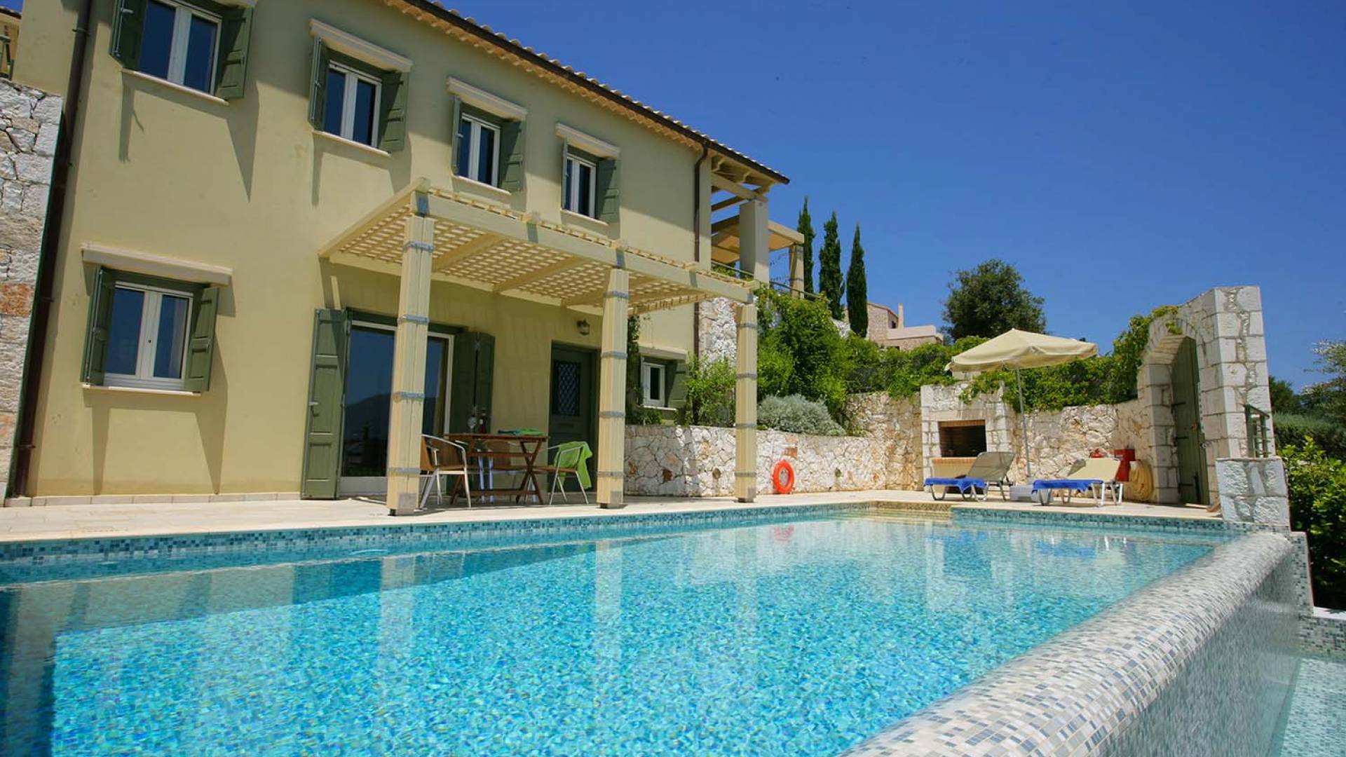 Villa Dendrolivano at Fiscardo View Villas is one of the most sought after villas on the Island of Kefalonia due to its idyllic hillside location overlooking the yachts and fishing boats moored in the harbour of Fiscardo. Villa Dendrolivano at Fiscardo View Villas is the first villa from the three that comprise the Fiscardo View Villas and it is ideal especially for families with young kids or older guests as it is closer to the road and not up on the hilltop. The views over the harbor and Ionian Sea towards the Island of Ithaca from the infinity swimming pool and terraces are simply stunning.