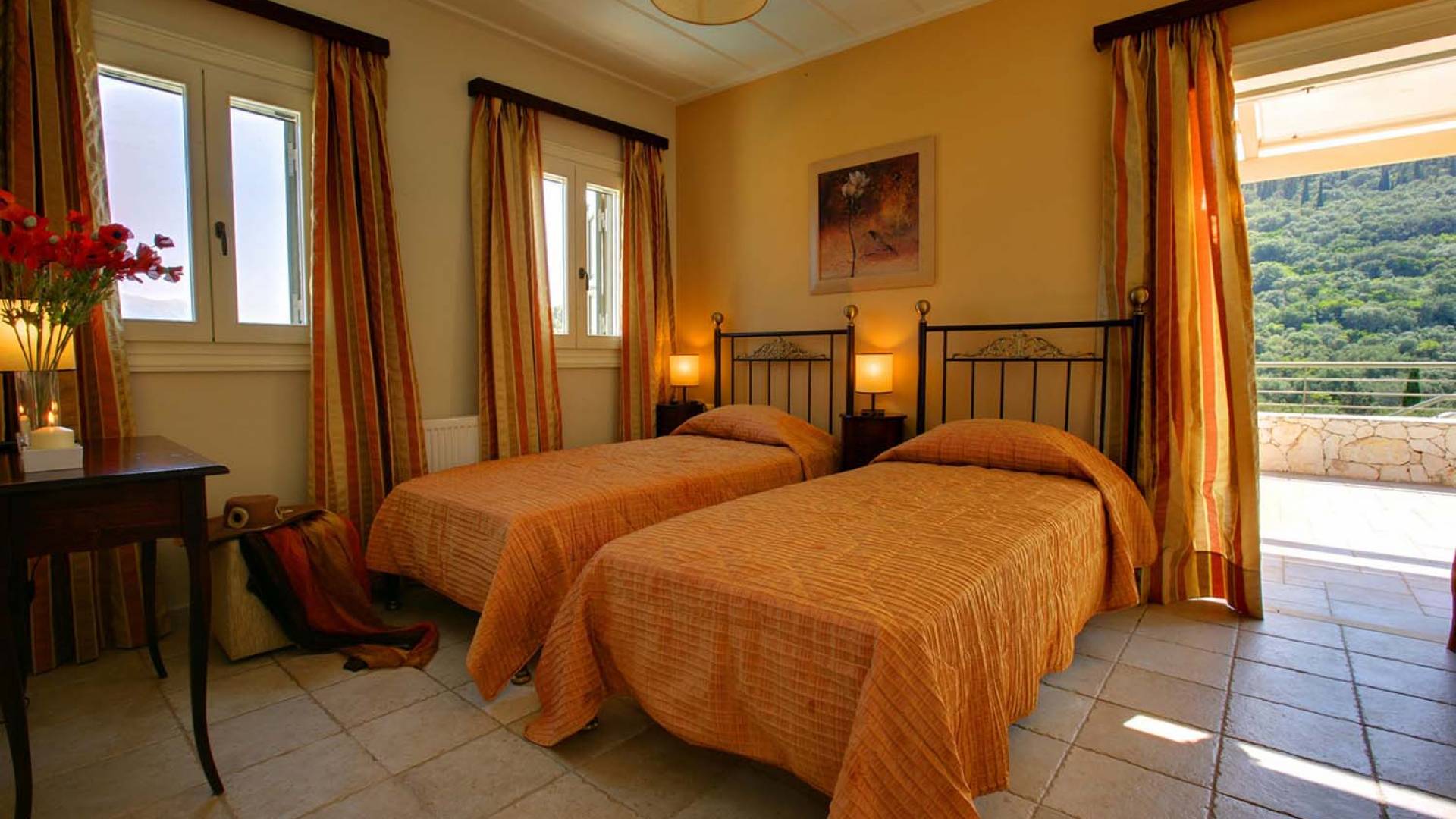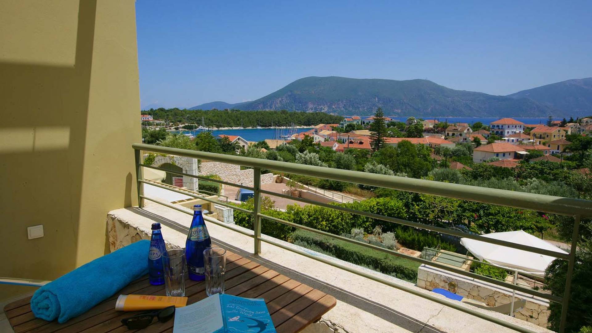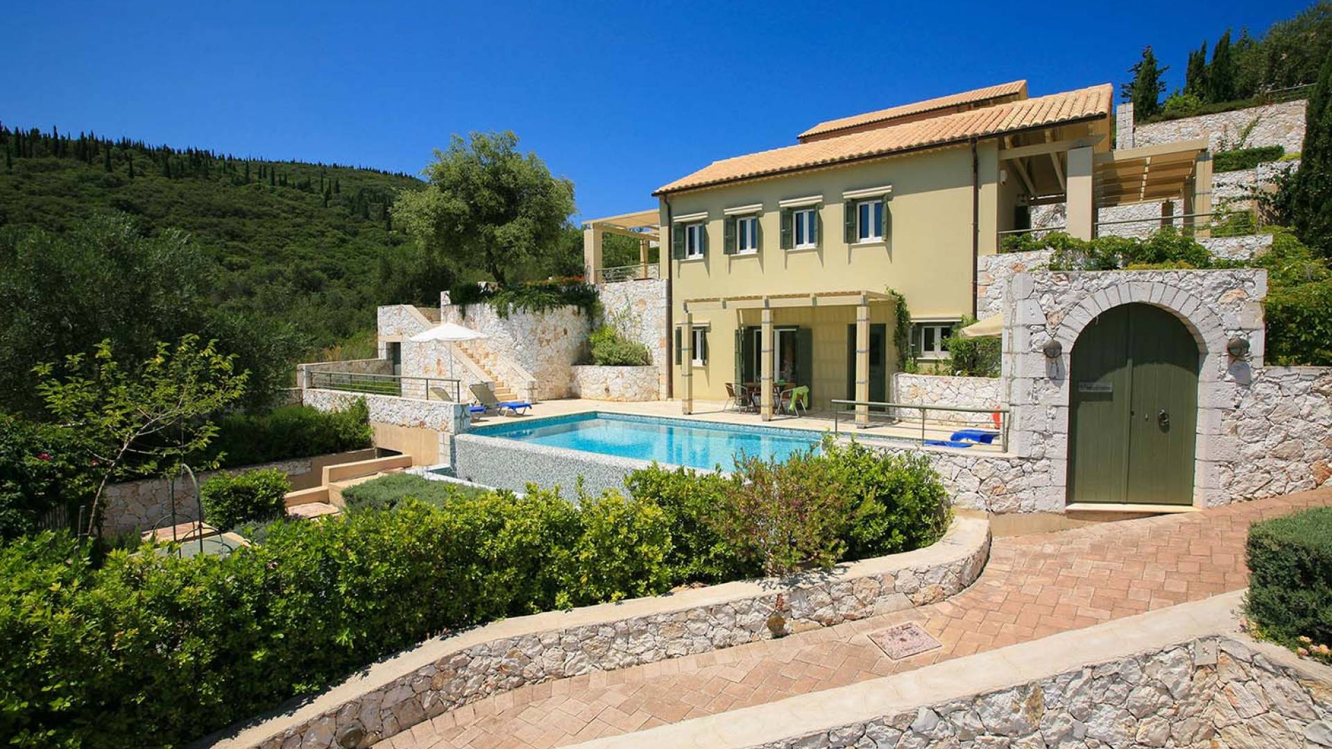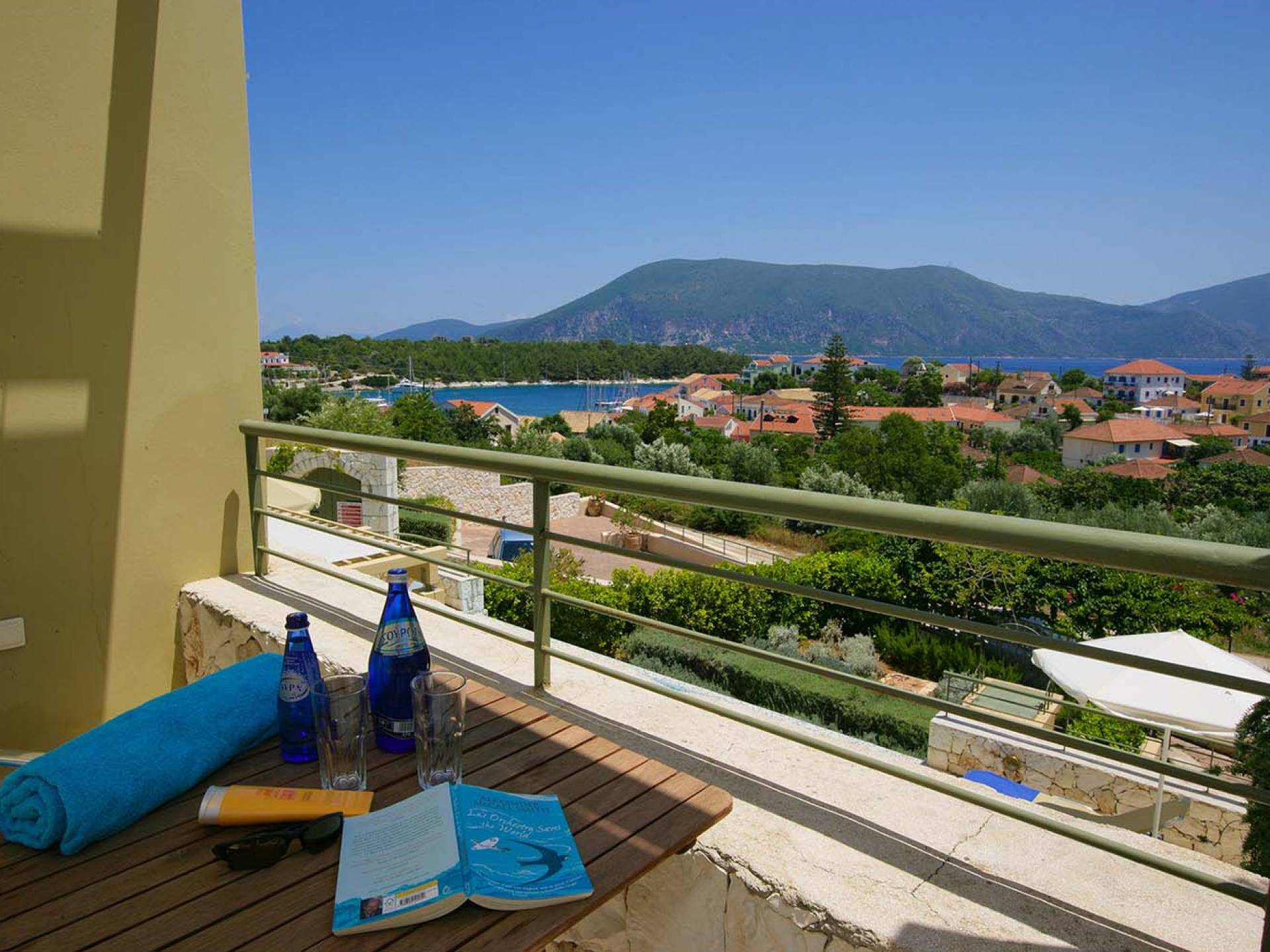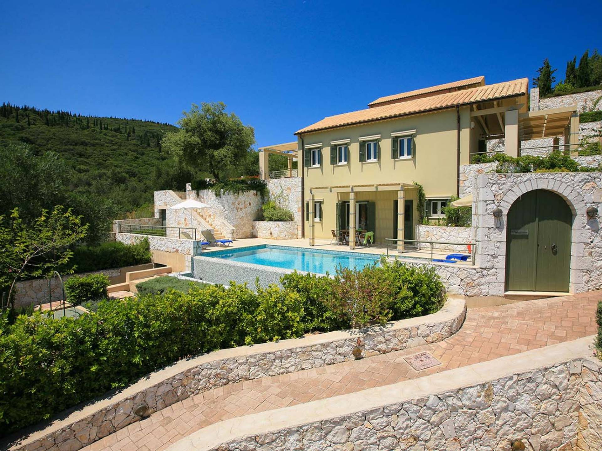 Villa Dendrolivano at Fiscardo View Villas is one of the most sought after villas on the Island of Kefalonia due to its idyllic hillside location overlooking the yachts and fishing boats moored in the harbour of Fiscardo. Villa Dendrolivano at Fiscardo View Villas is the first villa from the three that comprise the Fiscardo View Villas and it is ideal especially for families with young kids or older guests as it is closer to the road and not up on the hilltop. The views over the harbor and Ionian Sea towards the Island of Ithaca from the infinity swimming pool and terraces are simply stunning.