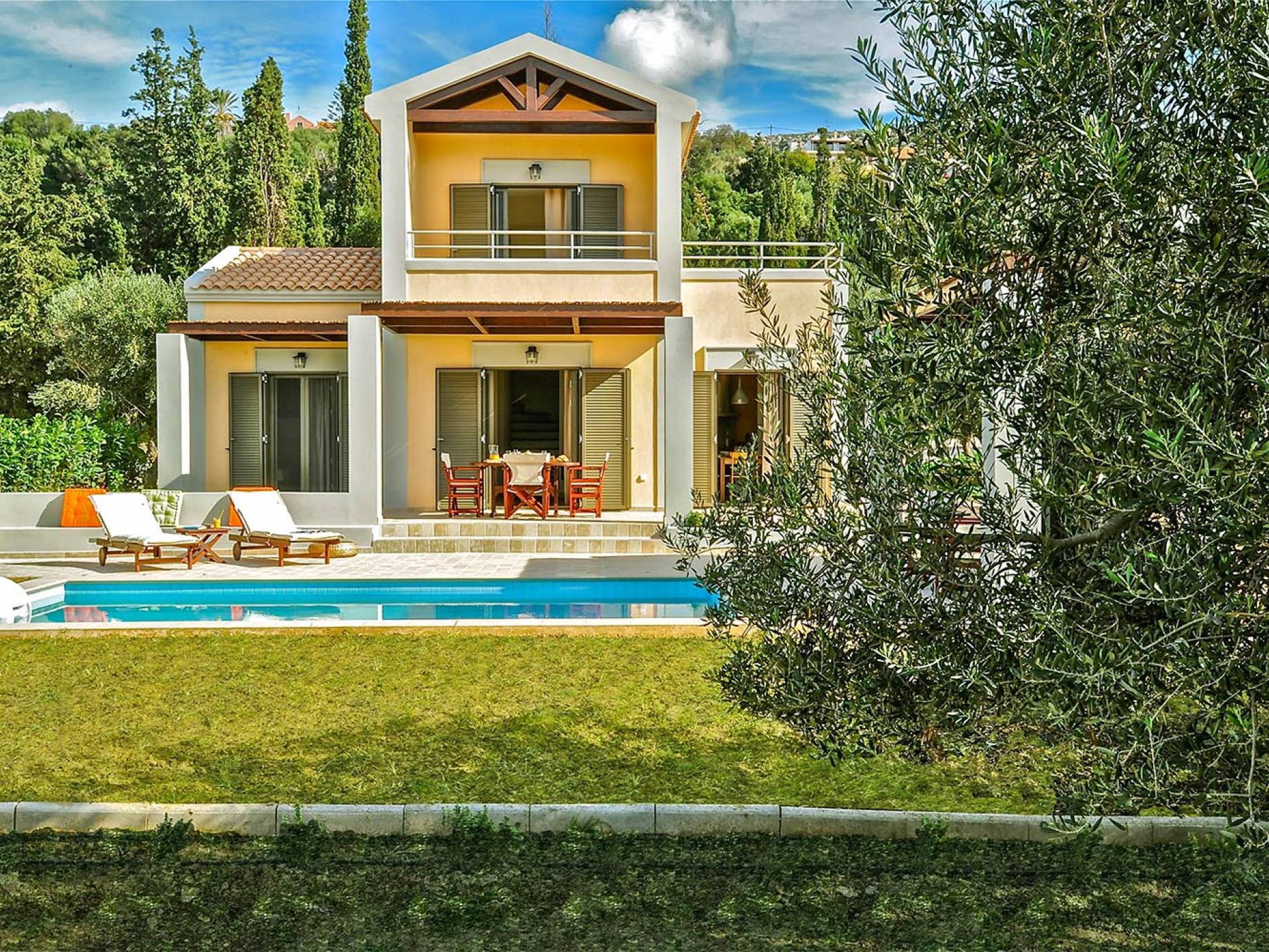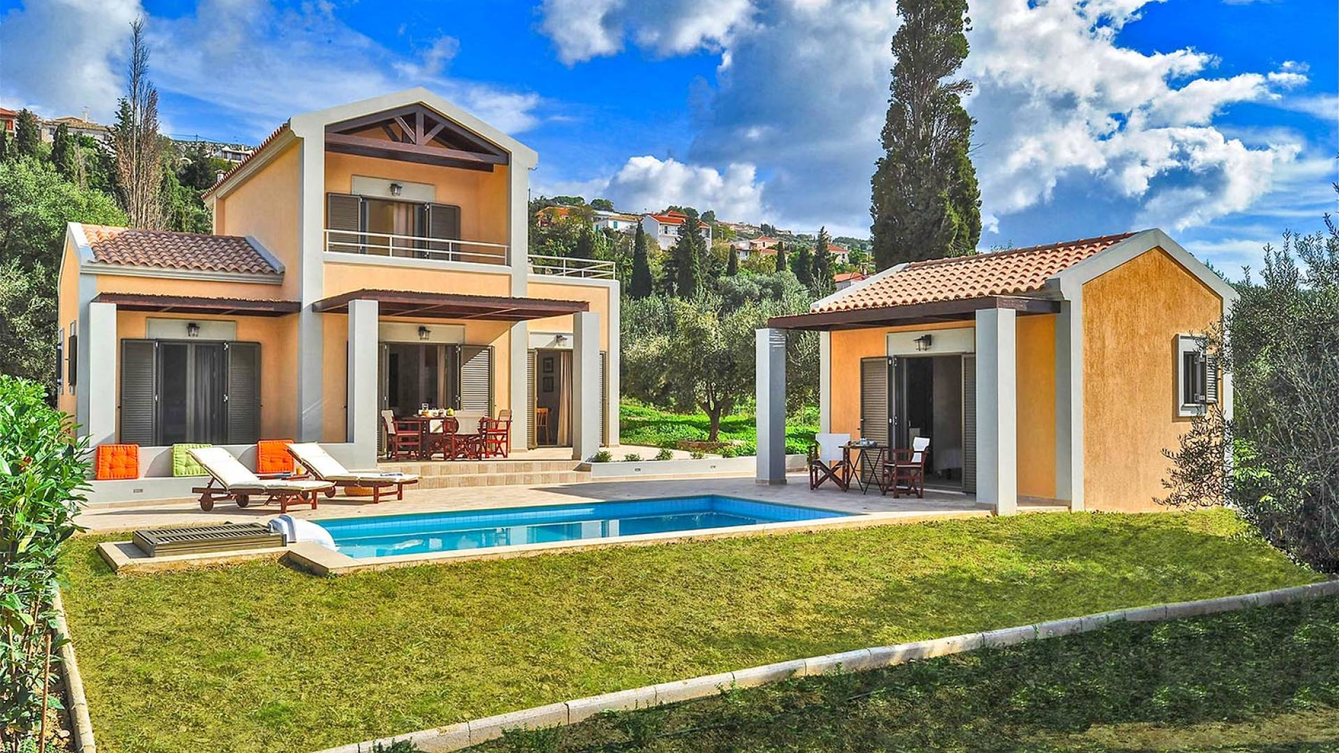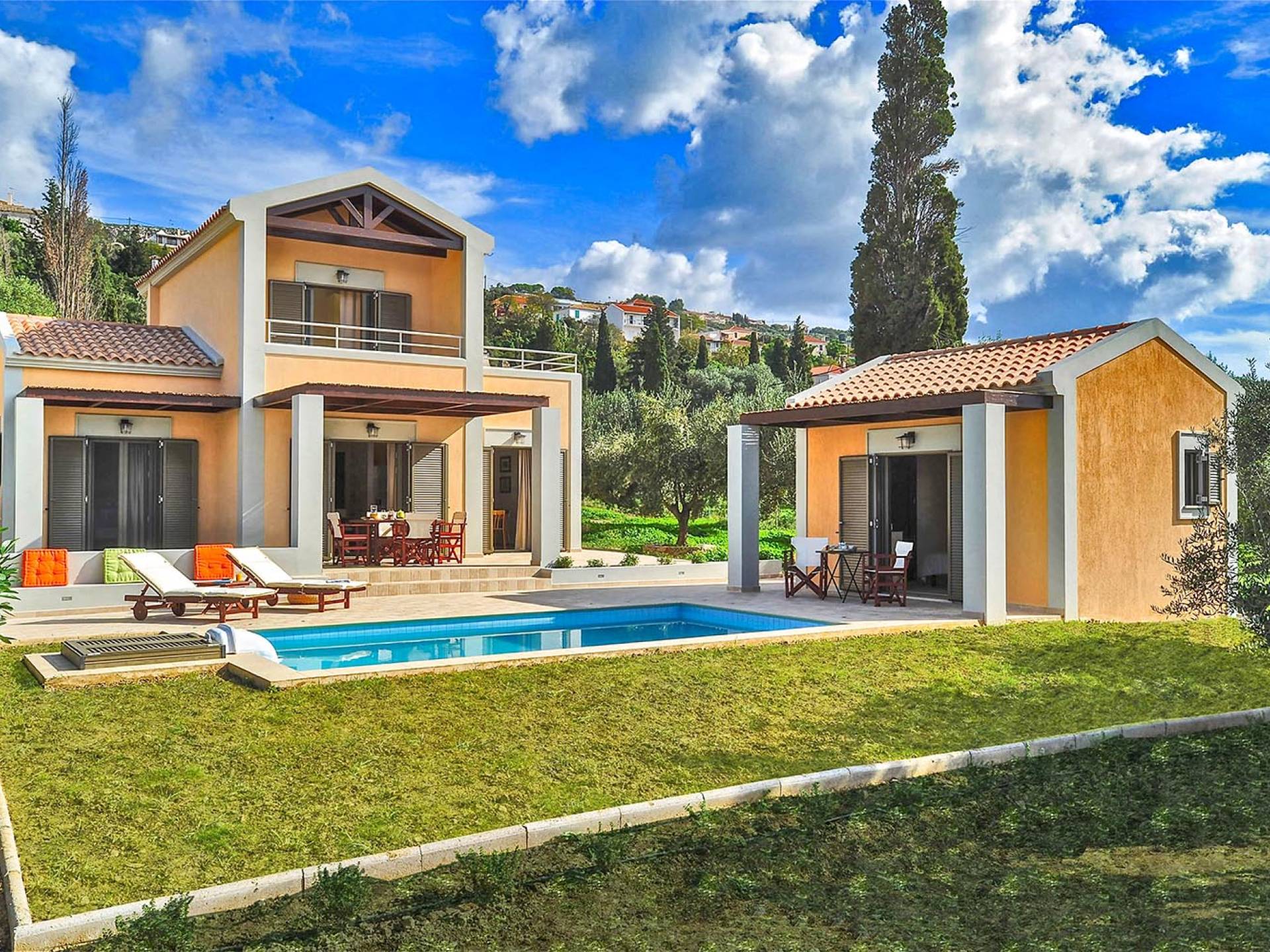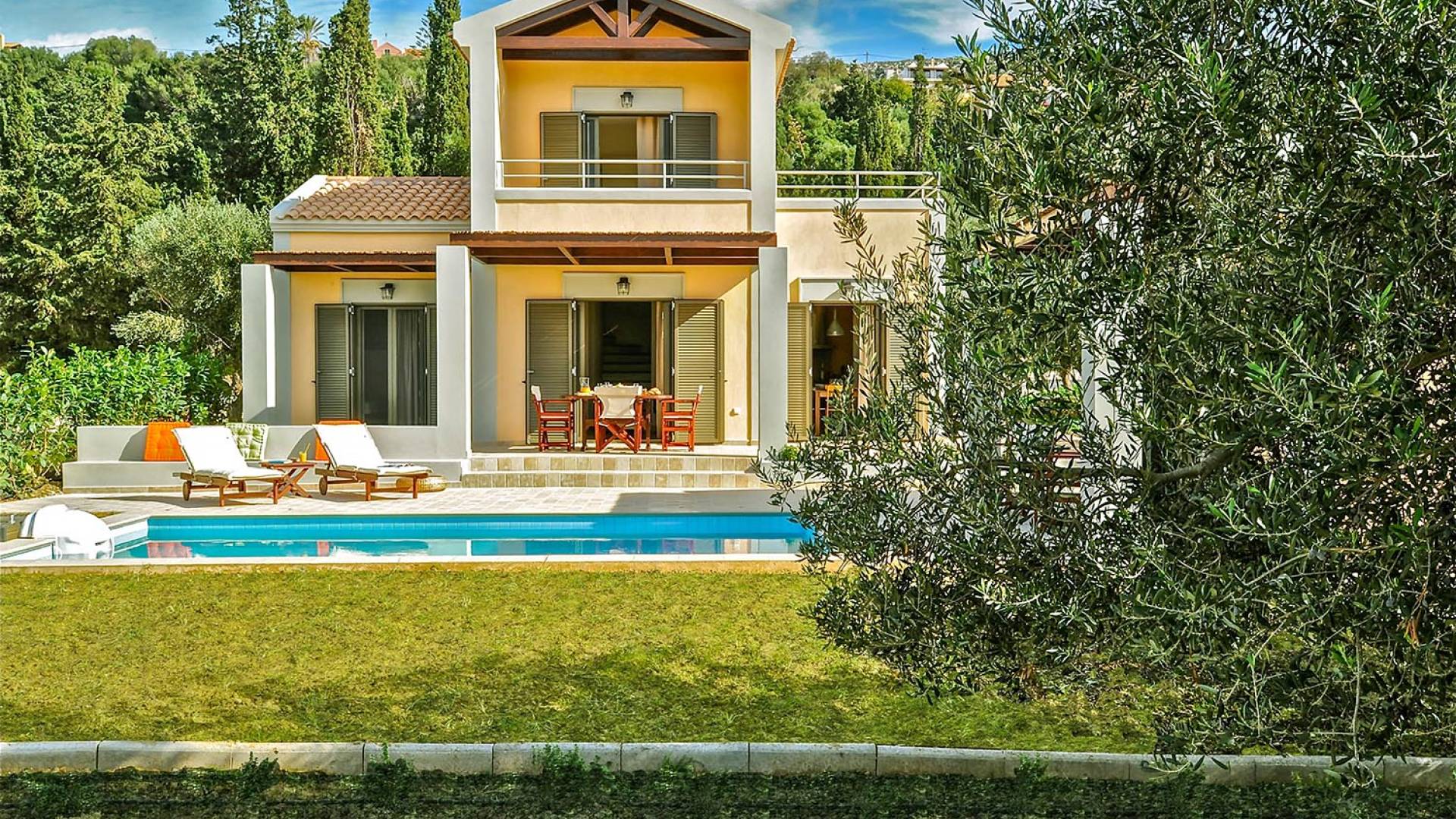 Villa Agrilia is a luxury villa rental with 3 bedrooms and private pool. A two-storey detached villa plus studio ready to host up to 7 guests. The main building, on the ground floor, consists of a living-room, dining-room, fully equipped modern kitchen, W.C., double bedroom and offers direct access to the private pool. On the first floor there is the master bedroom, a bathroom and two large balconies. The villa also has a sofa bed for one guest. The studio has an open plan area with its own private facilities. On the verandas you can relax and plan the following day’s summer activities.