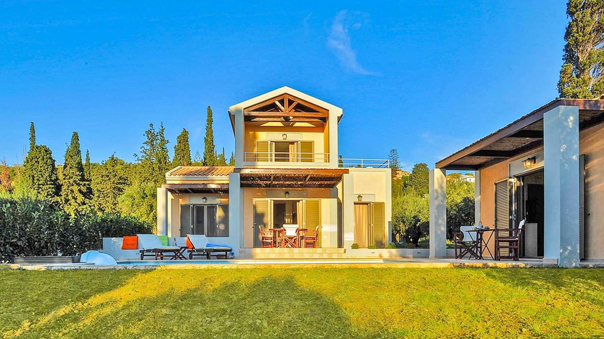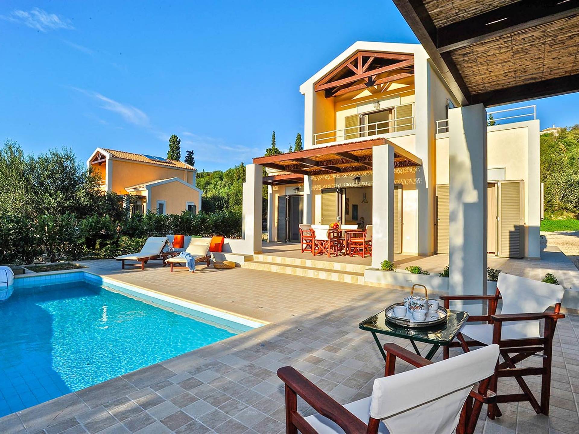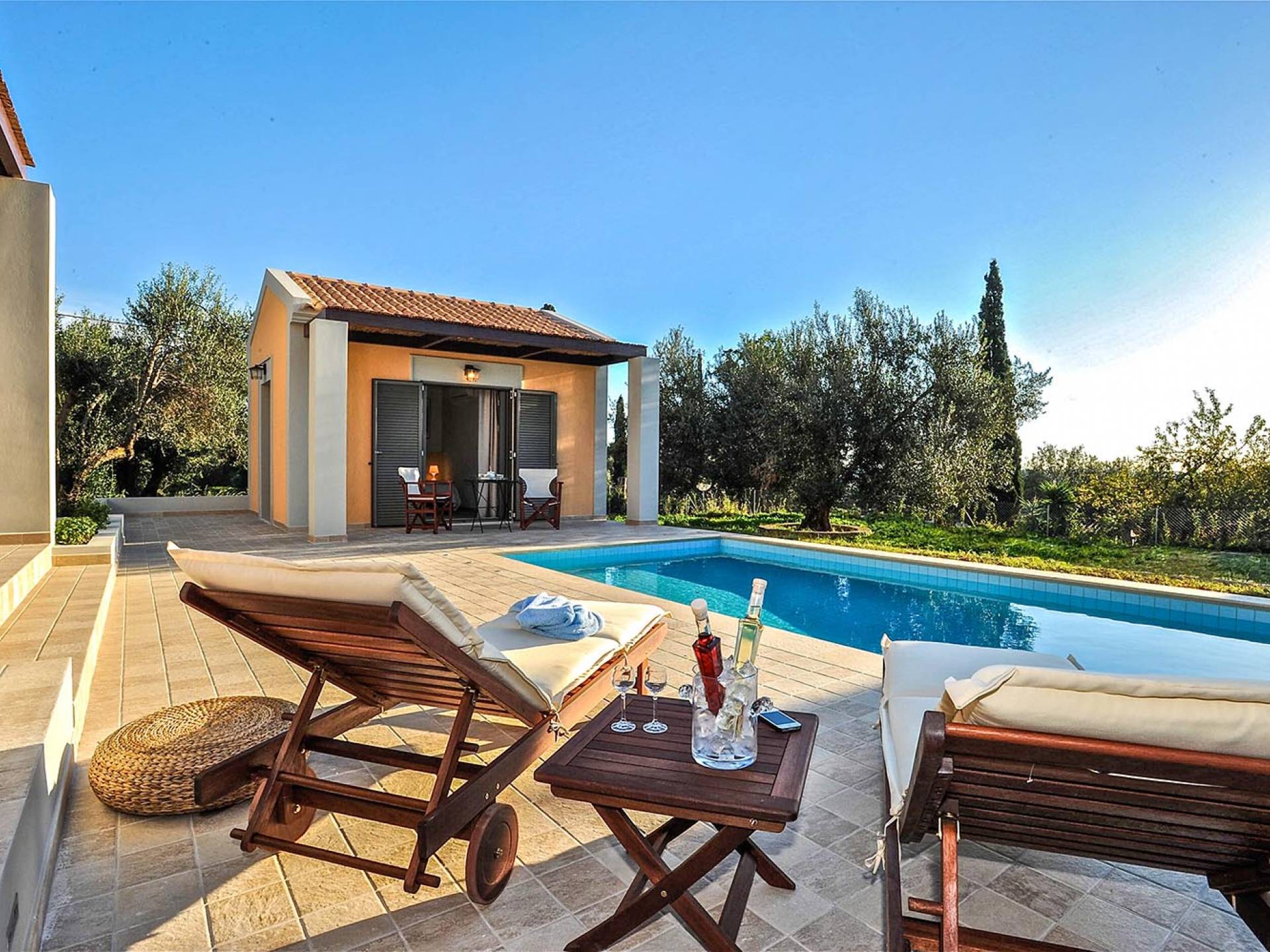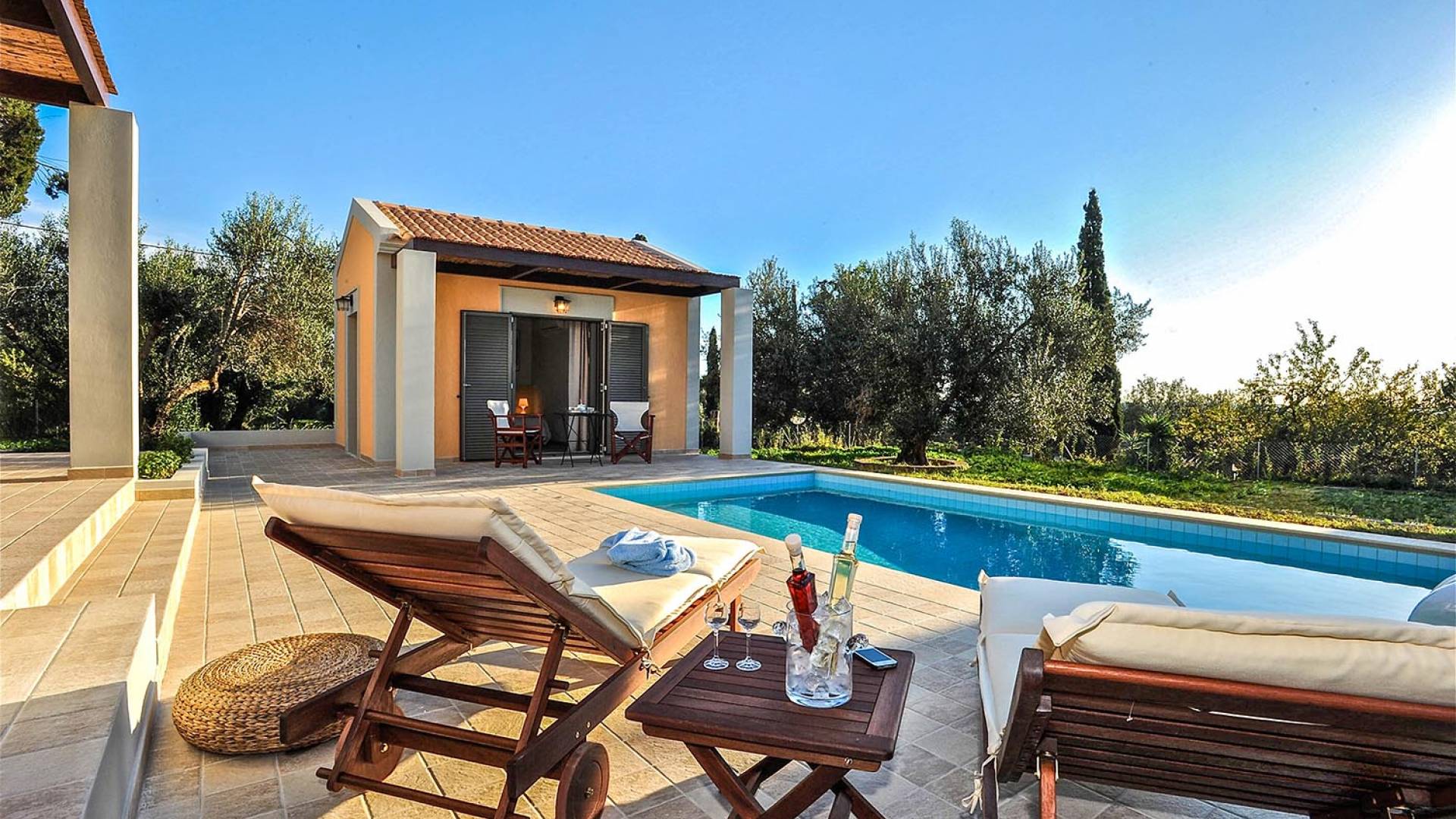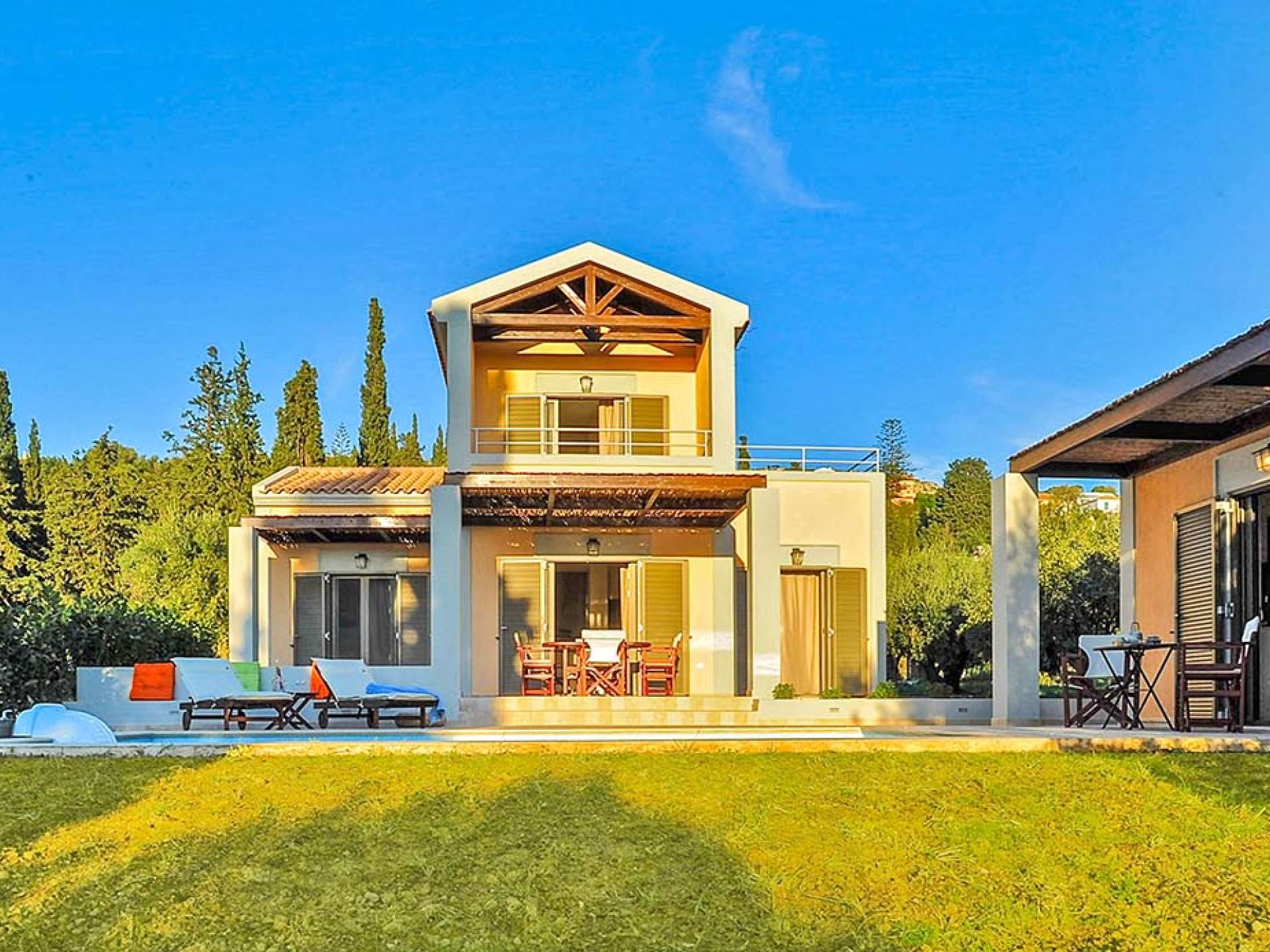 Villa Agrilia is a luxury villa rental with 3 bedrooms and private pool. A two-storey detached villa plus studio ready to host up to 7 guests. The main building, on the ground floor, consists of a living-room, dining-room, fully equipped modern kitchen, W.C., double bedroom and offers direct access to the private pool. On the first floor there is the master bedroom, a bathroom and two large balconies. The villa also has a sofa bed for one guest. The studio has an open plan area with its own private facilities. On the verandas you can relax and plan the following day’s summer activities.