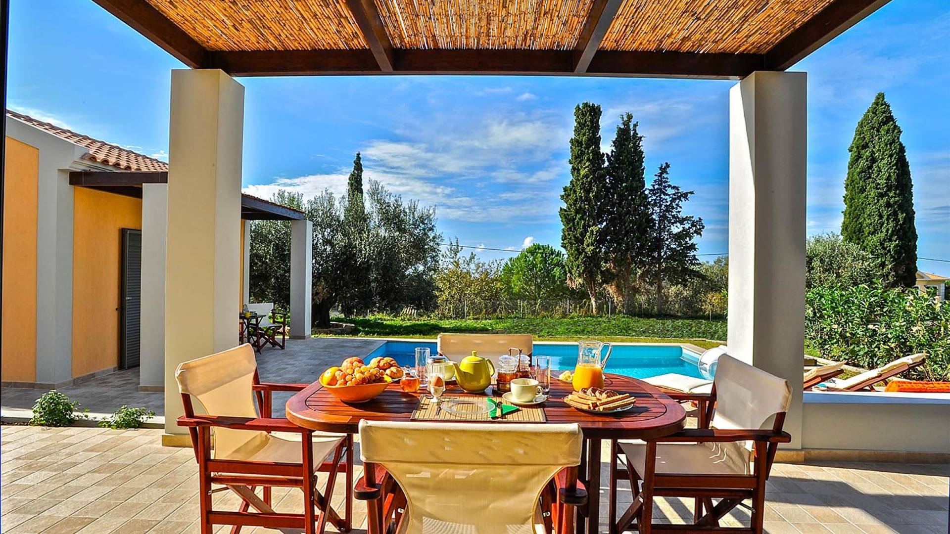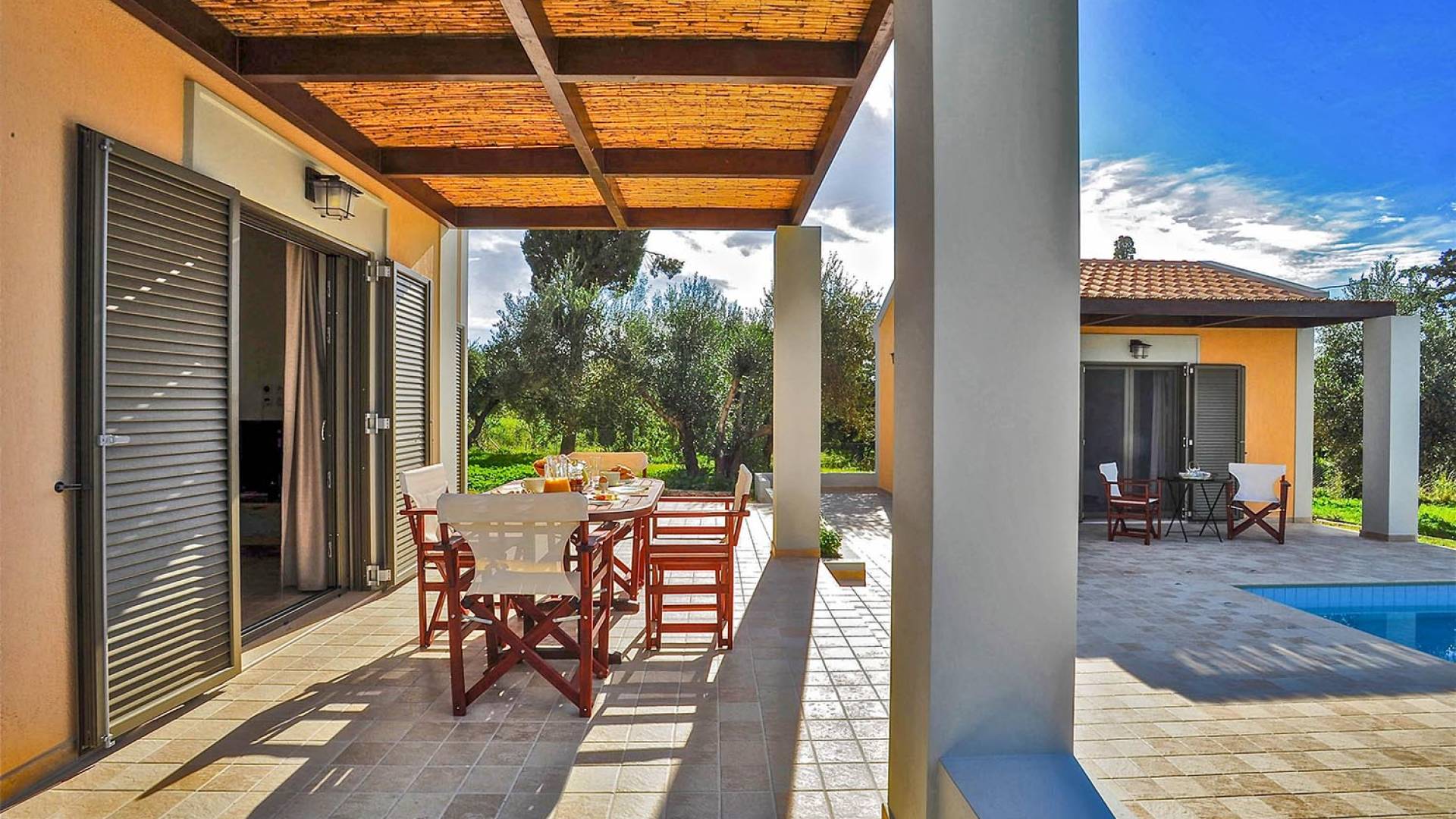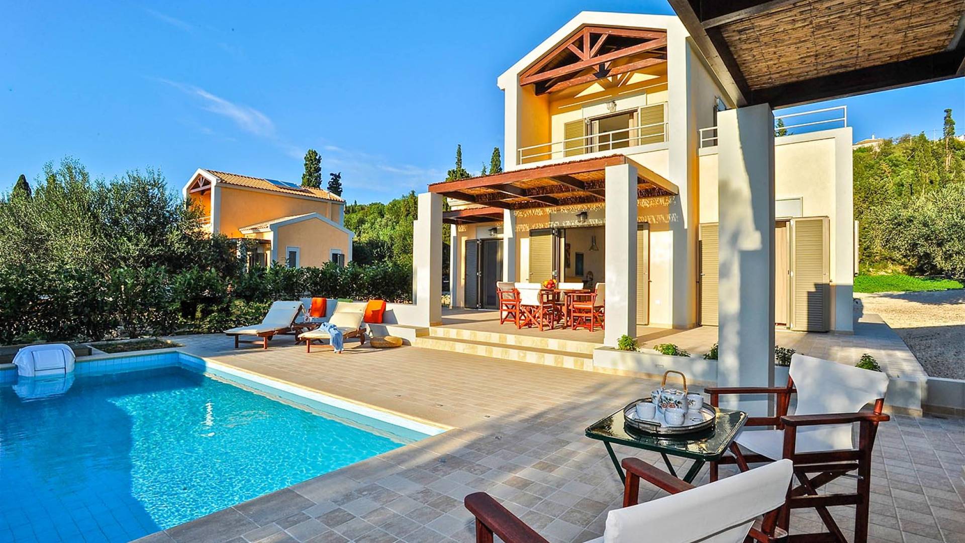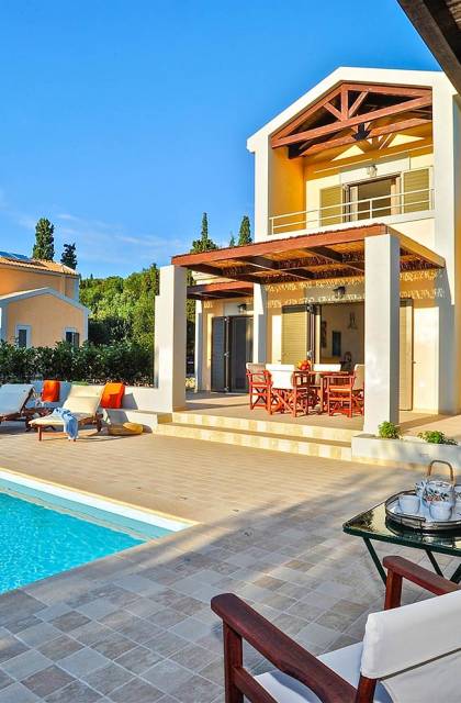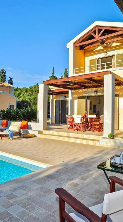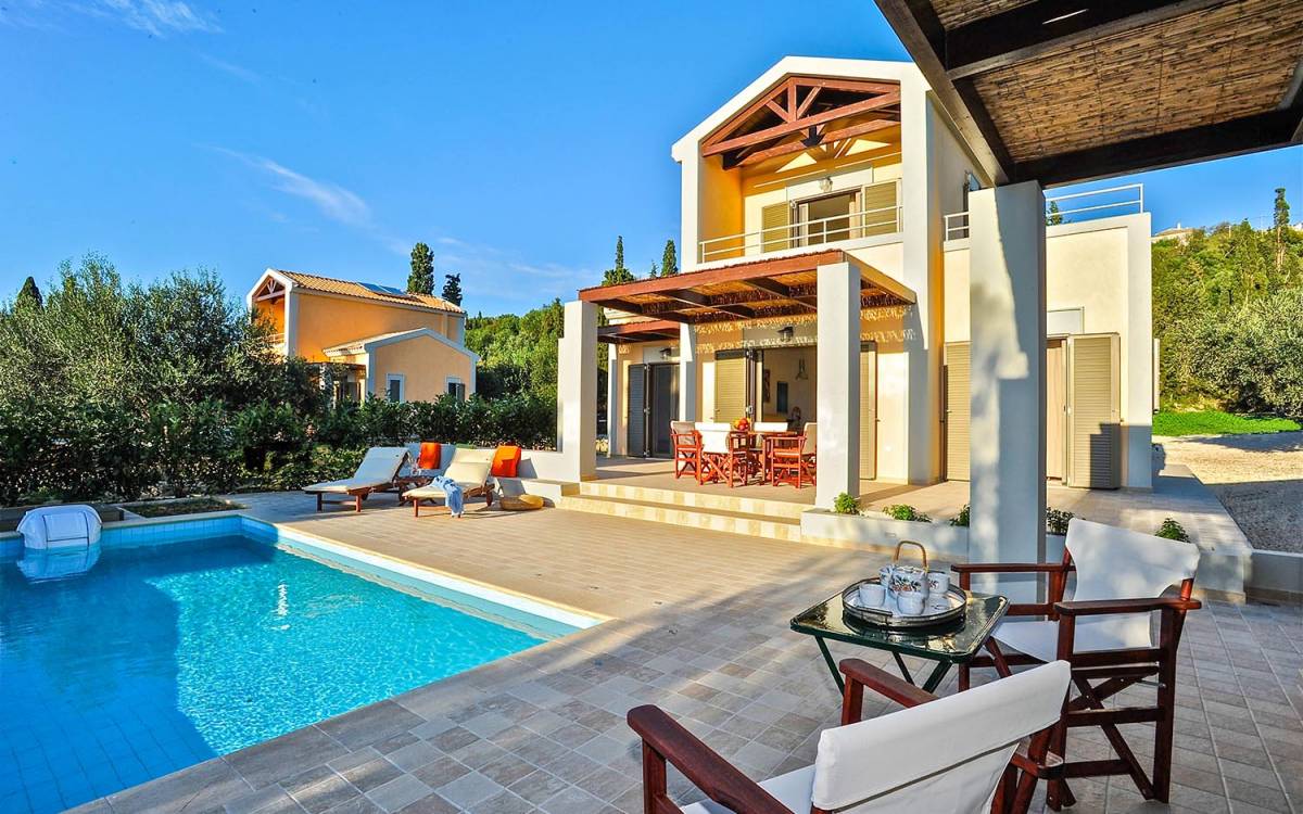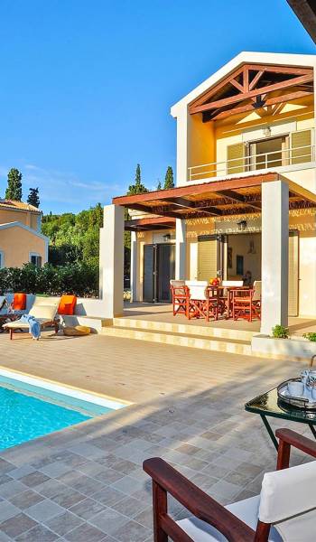 Elaia Villas Kefalonia are 2 luxury villa rentals with 5 bedrooms and 2 private pools. Elaia Villas are two spacious villas in Kefalonia, Villa Agrilia and Villa Koroni, each with stunning garden settings and colourful sunsets. These Kefalonia Villas are also blessed with, superb outlook and proximity to Spasmata beach. Amidst the garden above the pool, a spacious deck with comfortable sunchairs promises a perfect chocolate tan. Elaia Villas is an excellent property for guests who are longing for a stylish home away from home with impressive views and inspiring interiors. Anyone who is looking to rent a villa in Kefalonia and has high expectations will certainly enjoy the experience at Elaia Villas.